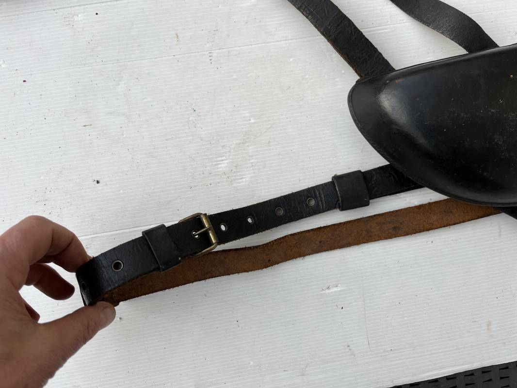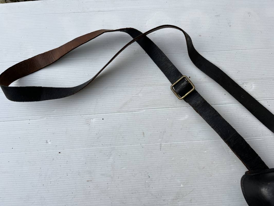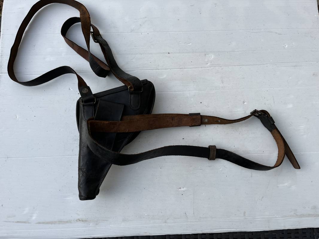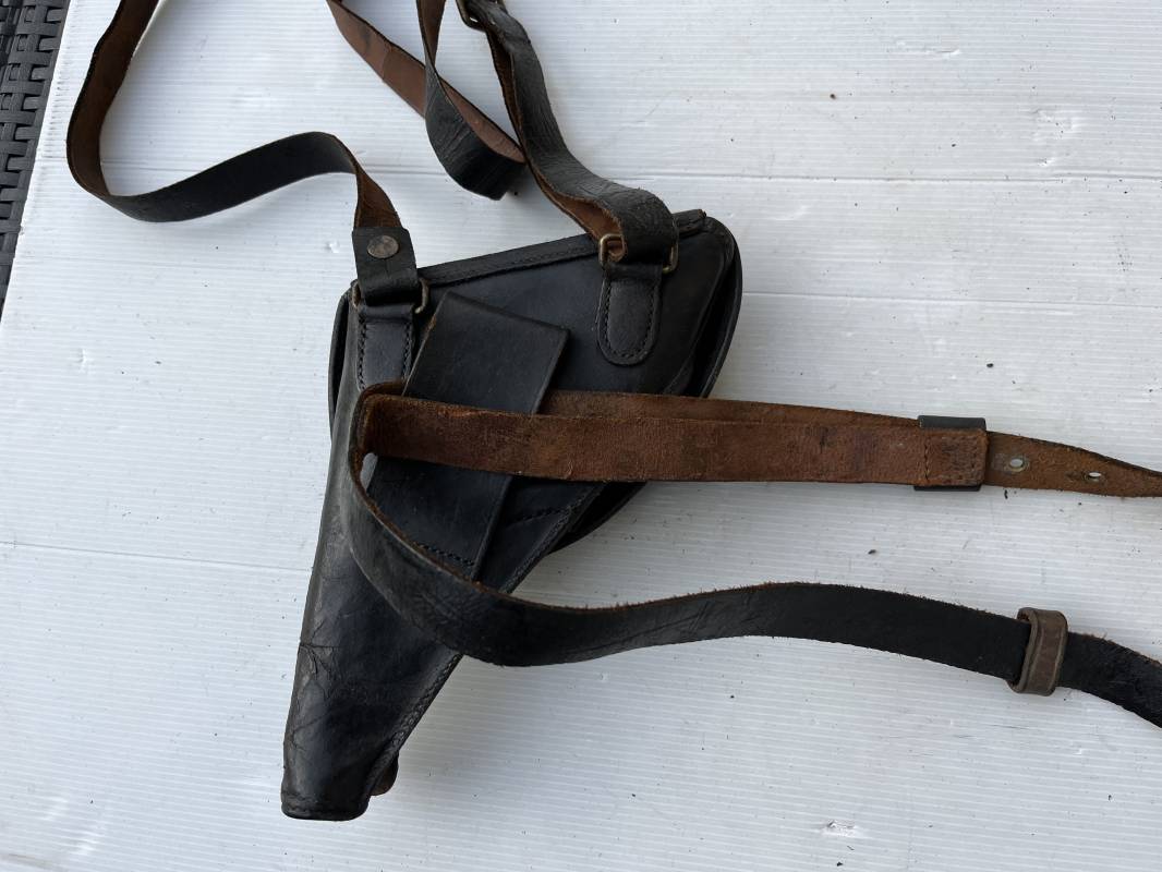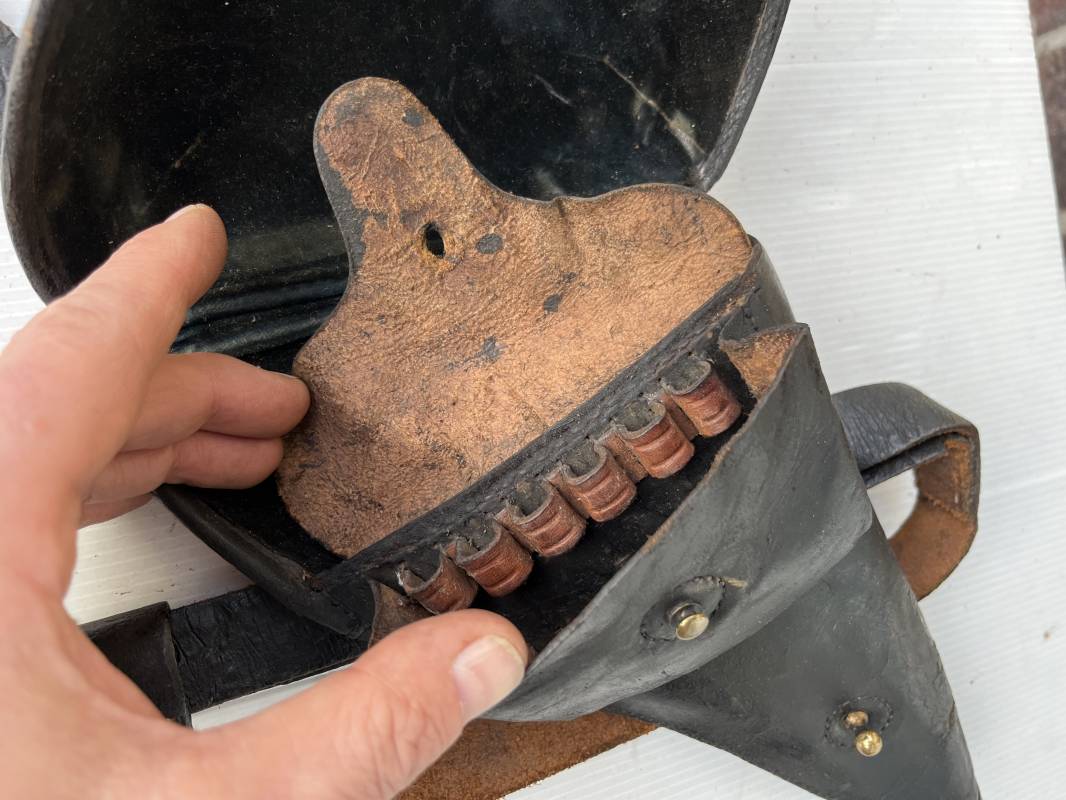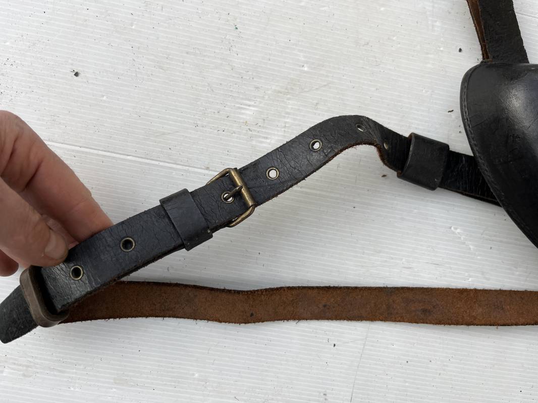 Rare brelage d'un officier en cuir noir typique mobilisation en Aout 1914 . Ceinturon officier modèle 1893 en cuir noir avec boucle en laiton à un ardillon. Passant cuir mobile et double ceinture à coulisse . Longueur totale 110cm, cuir souple. Étui révolver modèle 1892 dit "étui jambon" avec passant de ceinturon. Baudrier et boucle et rivets laiton. Rabat avec téton de fermeture. Pochette à munitions et alvéoles intèrieures. L etui revolver est un modele dit de luxe doublé en velours noir Belle forme jambon .Bon brelage légèrement porté en bon état 1914/15 Ref 21121