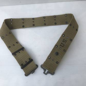 Ceinturon modèle 1936 en coton filé olive drab. Bouclerie en zinc estampé . Oeillets et boucle en laiton noirci , marquages encre noire US et fabricant YALE 1943 . Très légèrement porté en superbe état Ref 5302