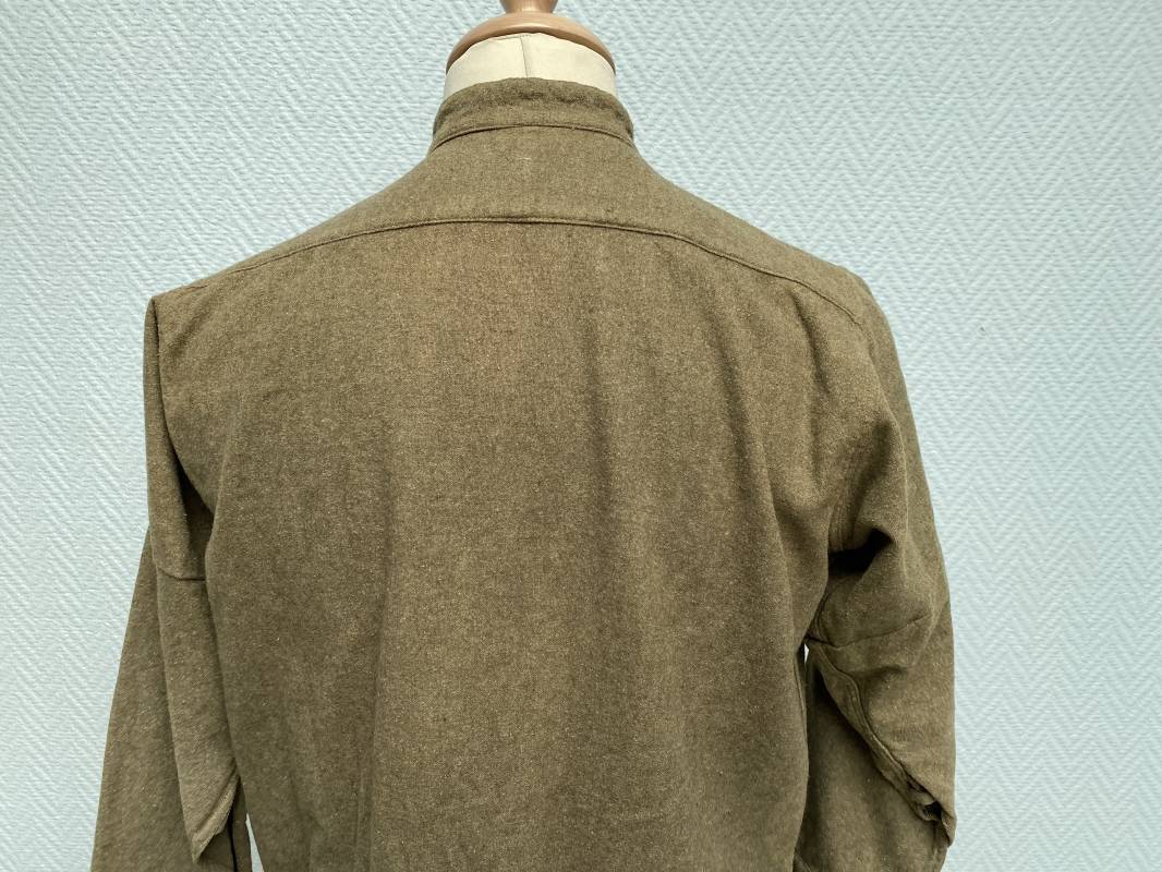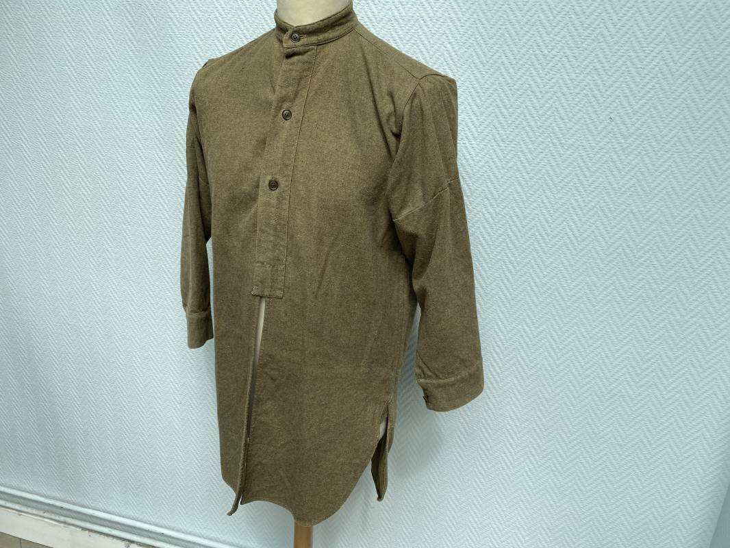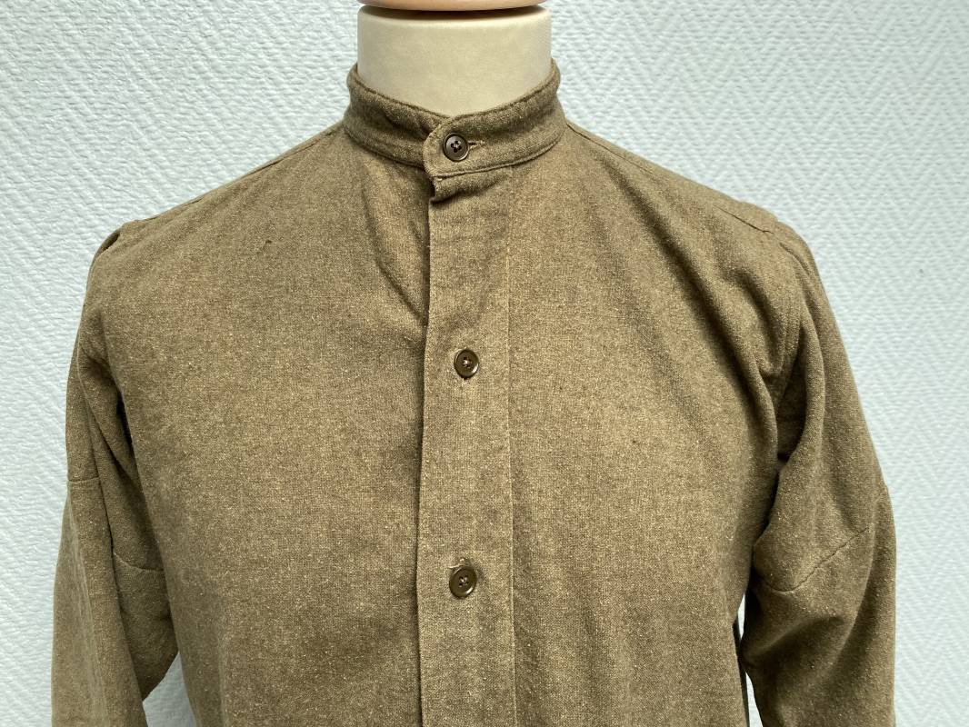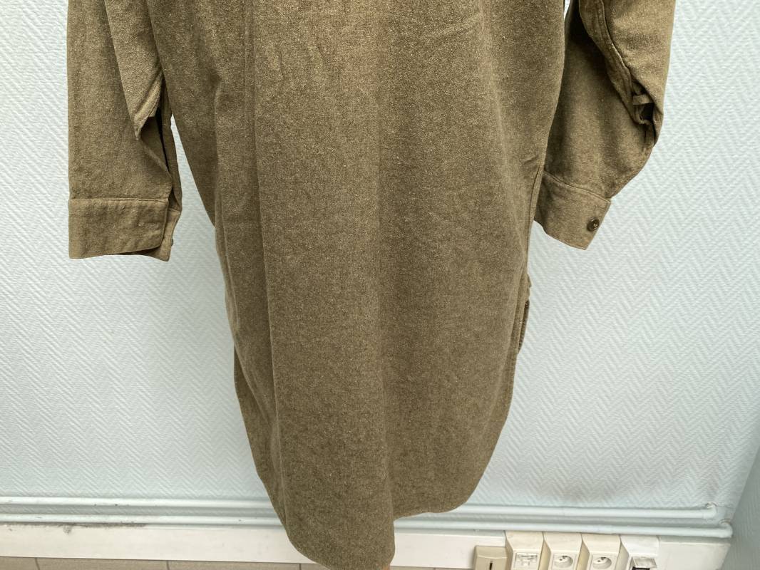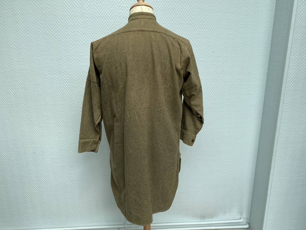 Belle chemise troupe réglementaire en flanelle kaki. Petit col droit. Fermeture mi poitrine par 3 boutons plastique kaki. Bouts des manches boutonnés. Chemise ouverte sur le bas avant (modification d'origine par le soldat pour plus de confort). Légèrement porté en parfait état. Largeur d'épaules 42cm. Longueur 94cm. Manches 54cm 1940/45. Ref 18324
