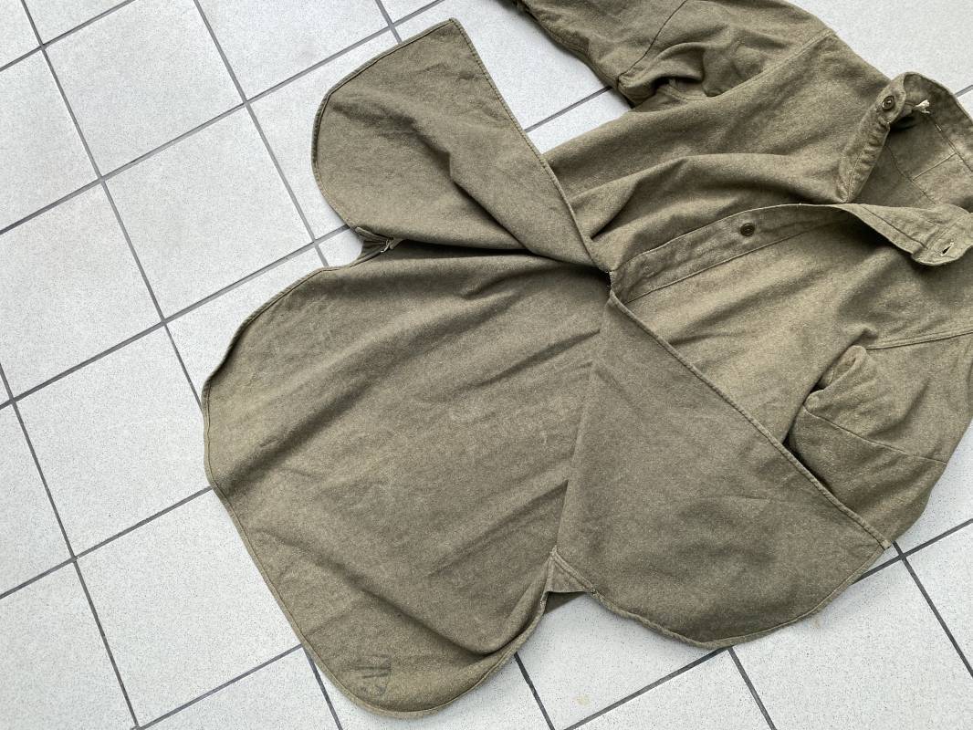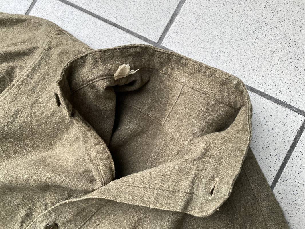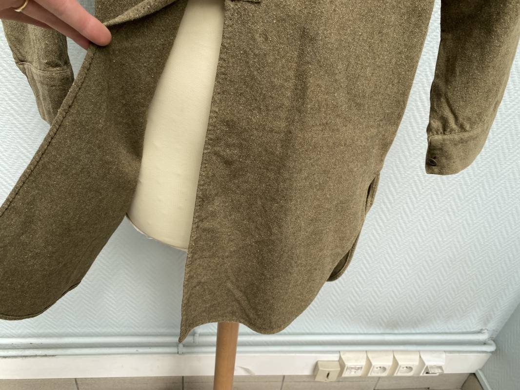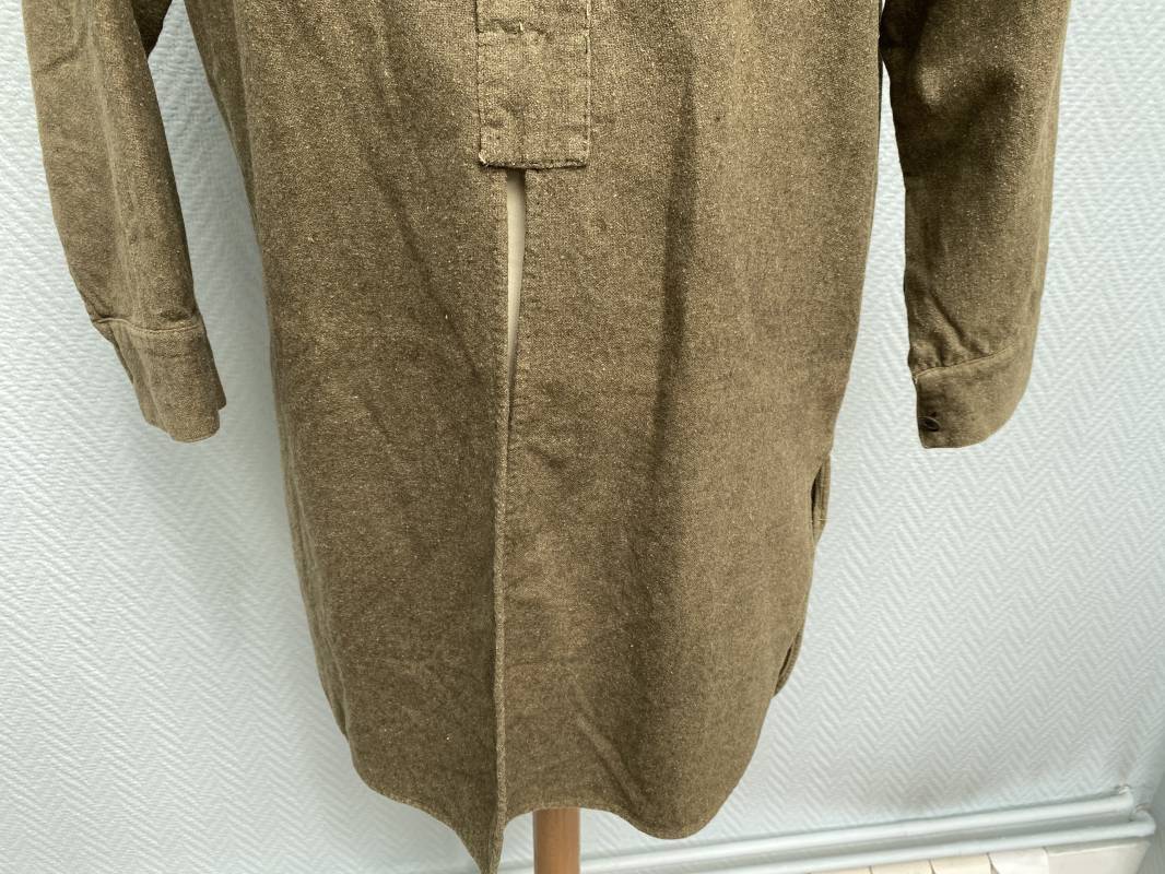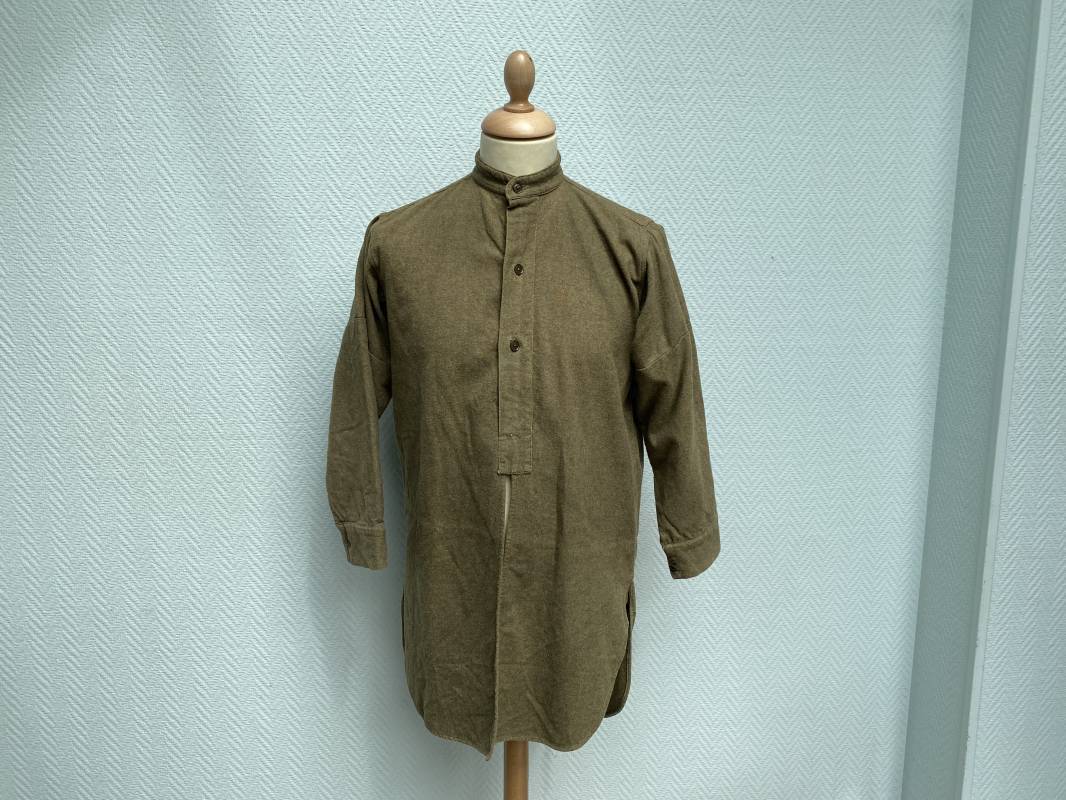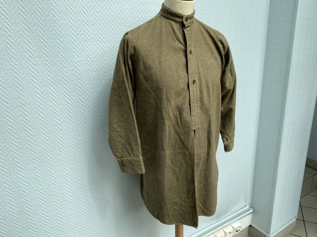 Belle chemise troupe réglementaire en flanelle kaki. Petit col droit. Fermeture mi poitrine par 3 boutons plastique kaki. Bouts des manches boutonnés. Chemise ouverte sur le bas avant (modification d'origine par le soldat pour plus de confort). Légèrement porté en parfait état. Largeur d'épaules 42cm. Longueur 94cm. Manches 54cm 1940/45. Ref 18324