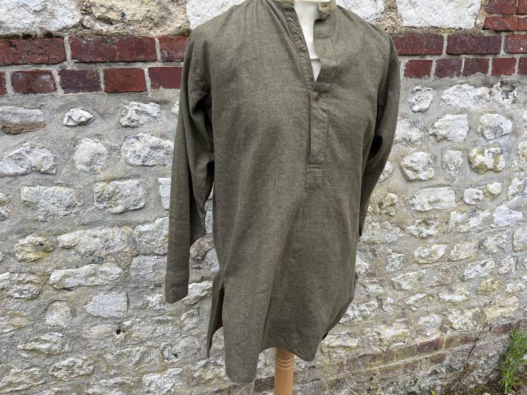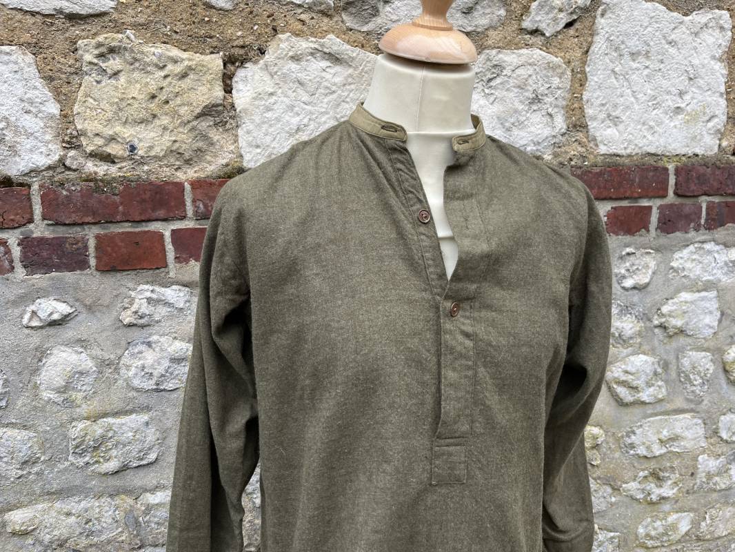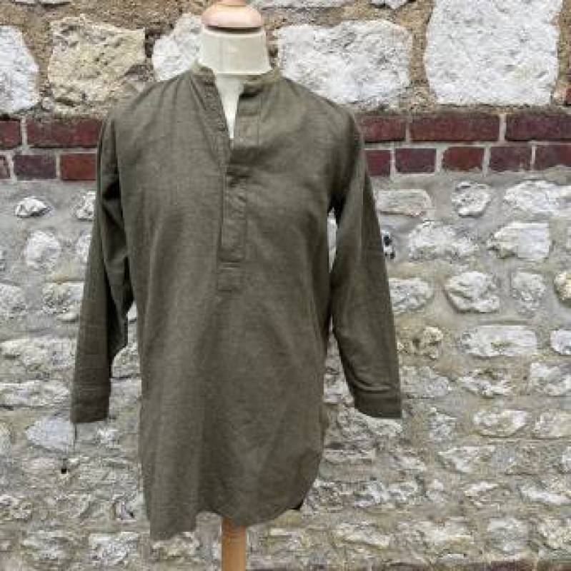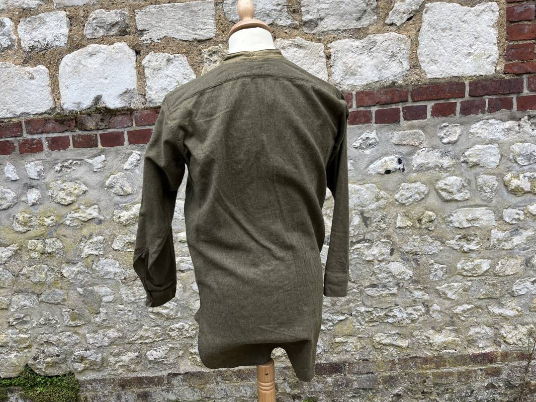 tR2S Belle chemise troupe réglementaire en flanelle kaki. Petit col droit. Fermeture mi poitrine par 3 boutons plastique kaki. Bouts des manches boutonnés. Marquages encre fabricant sur sous col Mcl HN Co Ltd 3 . Légèrement porté en parfait état. Largeur d'épaules 43cm. Longueur 90cm. Manches 60cm 1940/45. Ref 19986