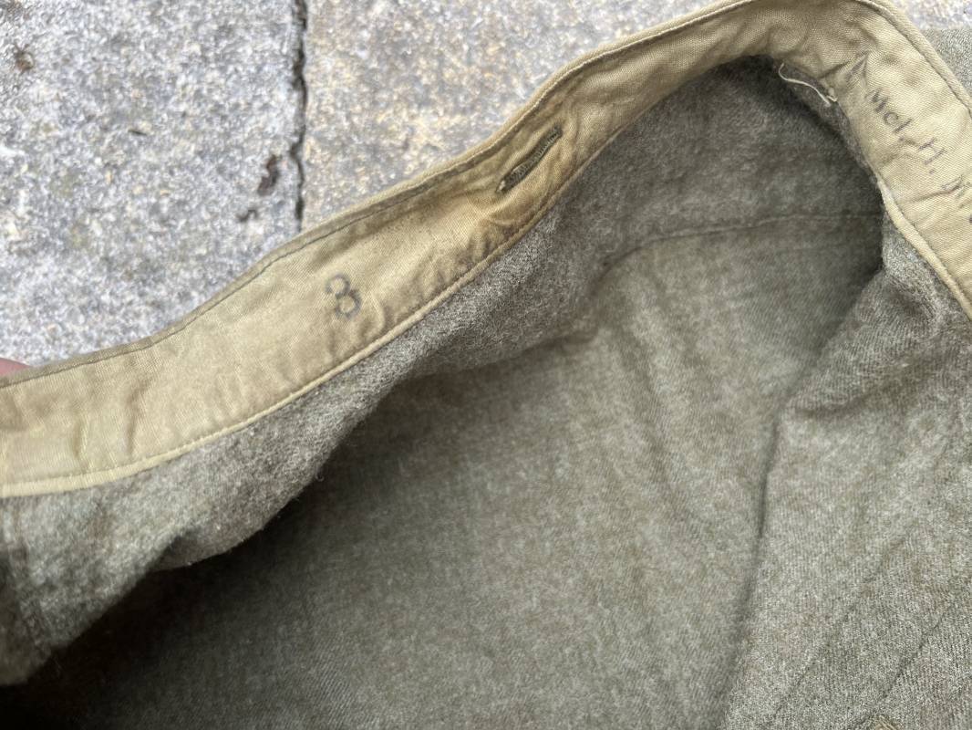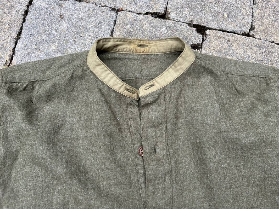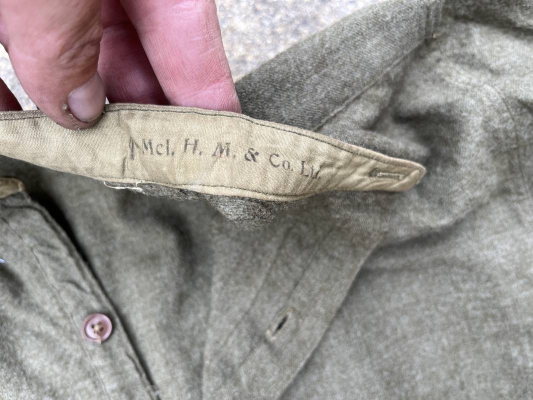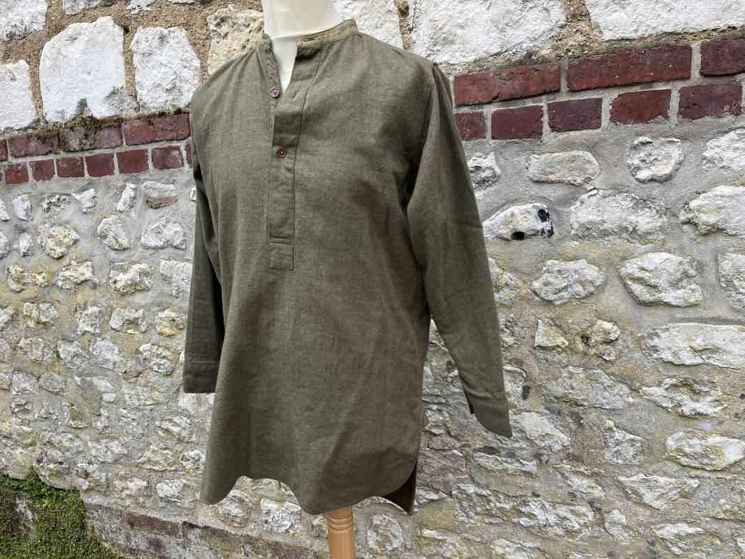 tR2S Belle chemise troupe réglementaire en flanelle kaki. Petit col droit. Fermeture mi poitrine par 3 boutons plastique kaki. Bouts des manches boutonnés. Marquages encre fabricant sur sous col Mcl HN Co Ltd 3 . Légèrement porté en parfait état. Largeur d'épaules 43cm. Longueur 90cm. Manches 60cm 1940/45. Ref 19986