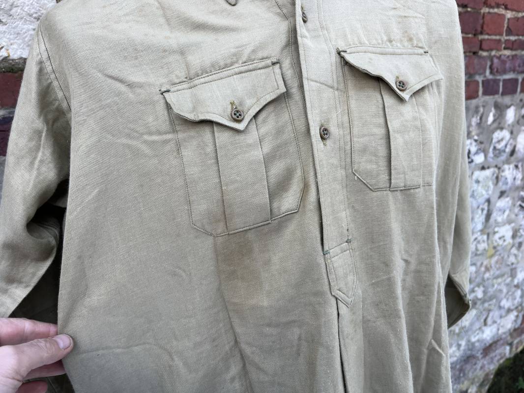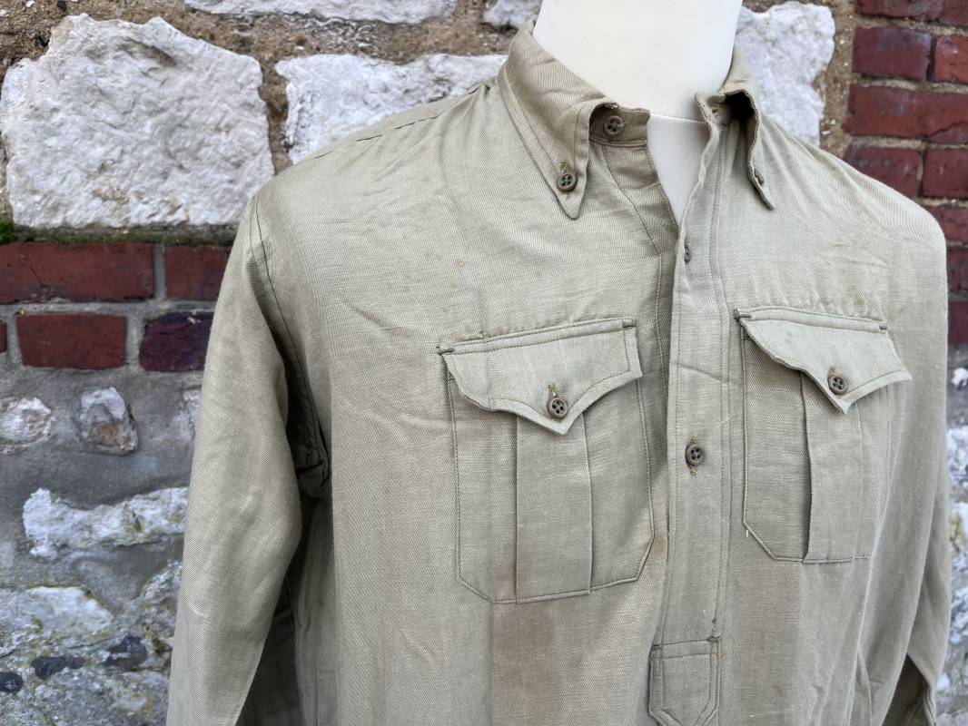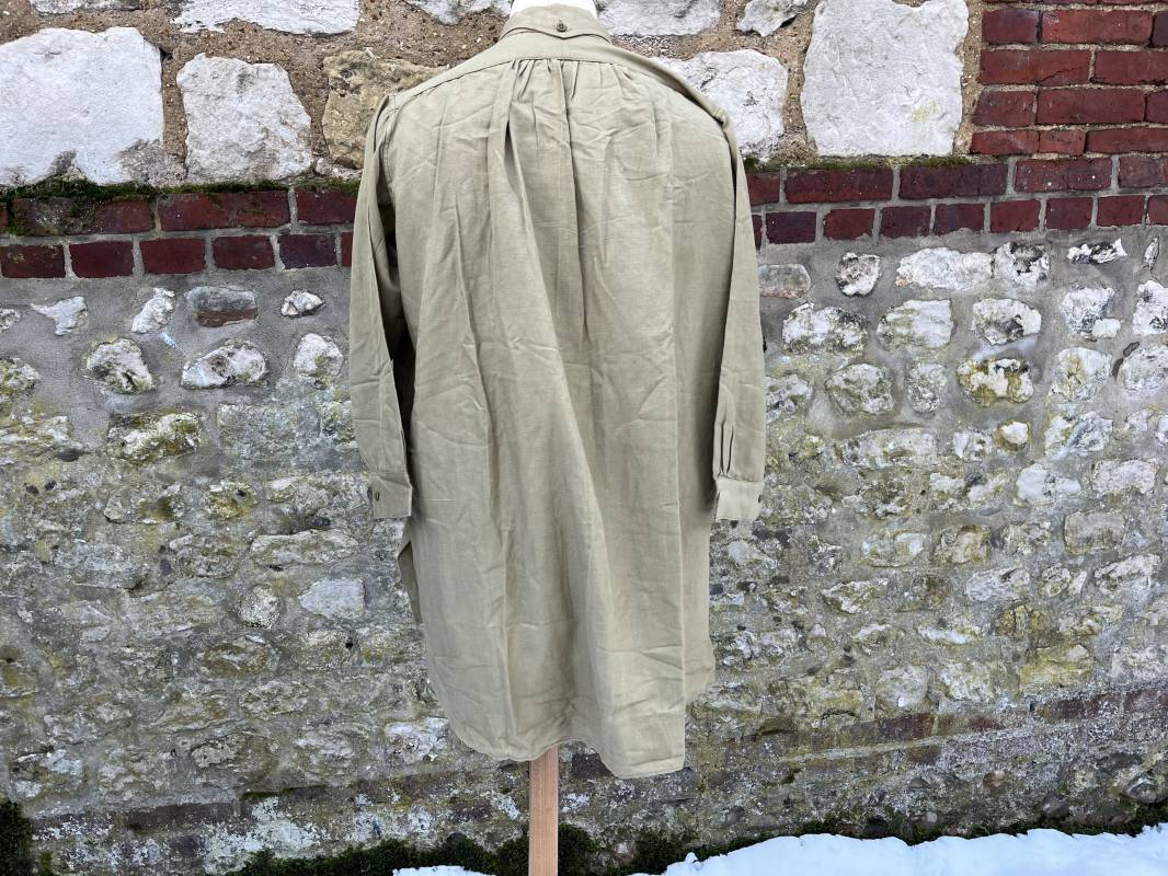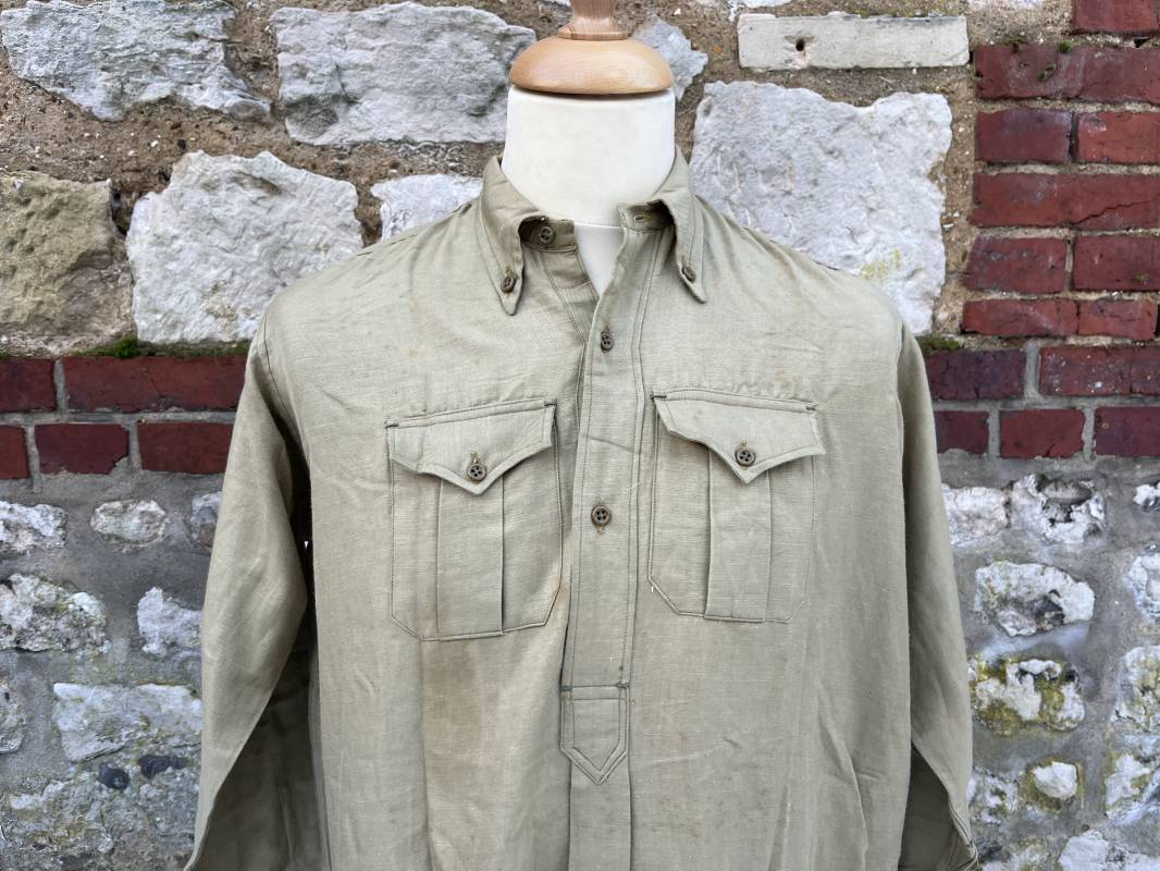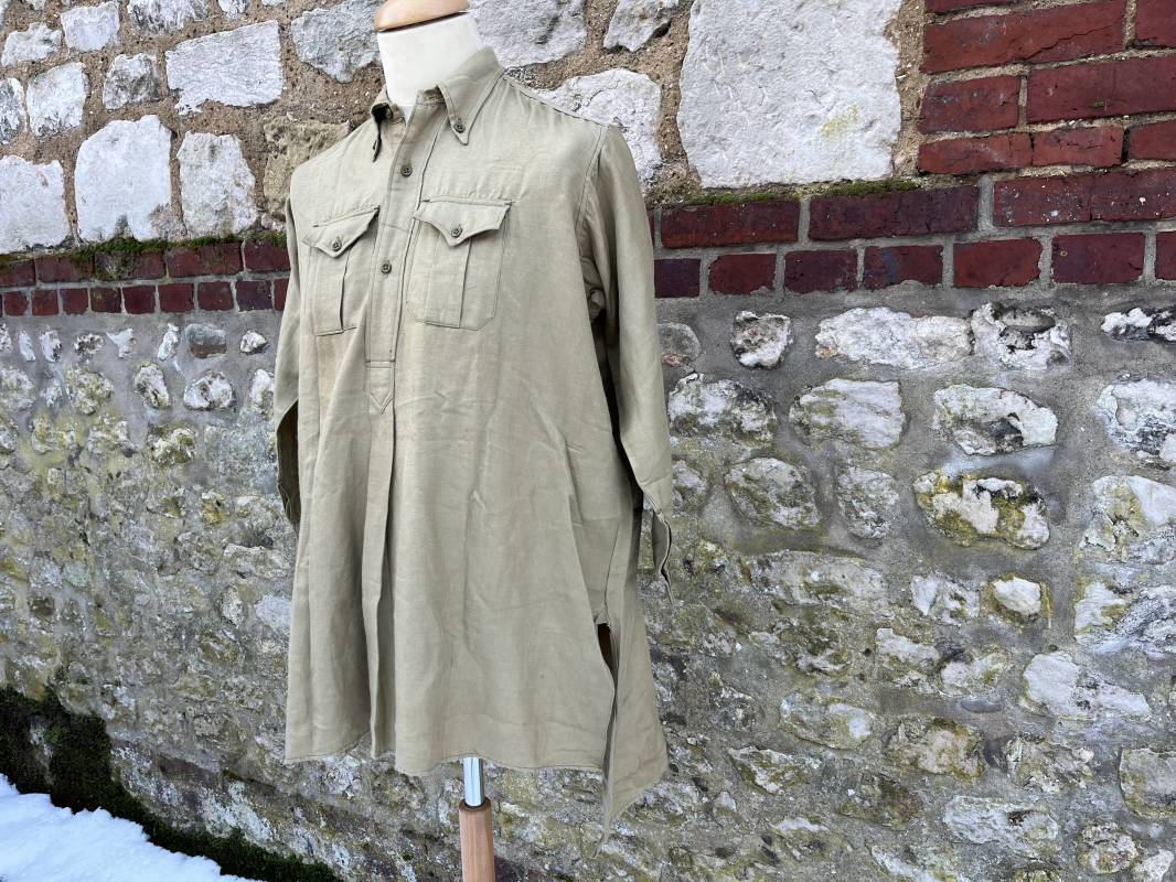 Trés belle chemise Troupe modèle 1935 en coton kaki clair . Chemise réglementaire, deux poches de poitrine. Col boutonné. Boutons en plastique cousus d'origine. Chemise lègèrement portée en superbe etat . Etiquette taille 39 au col . Largeur d'épaules 41cm. Longueur 93 cm. Manches 52 cm. 1935/40. Ref 21309