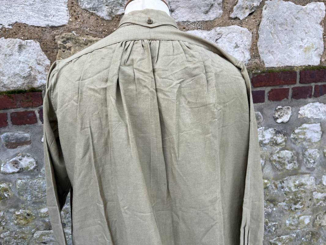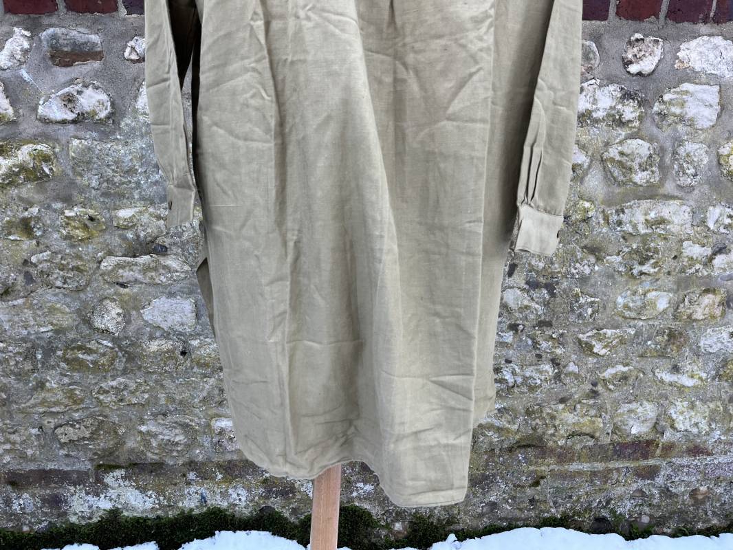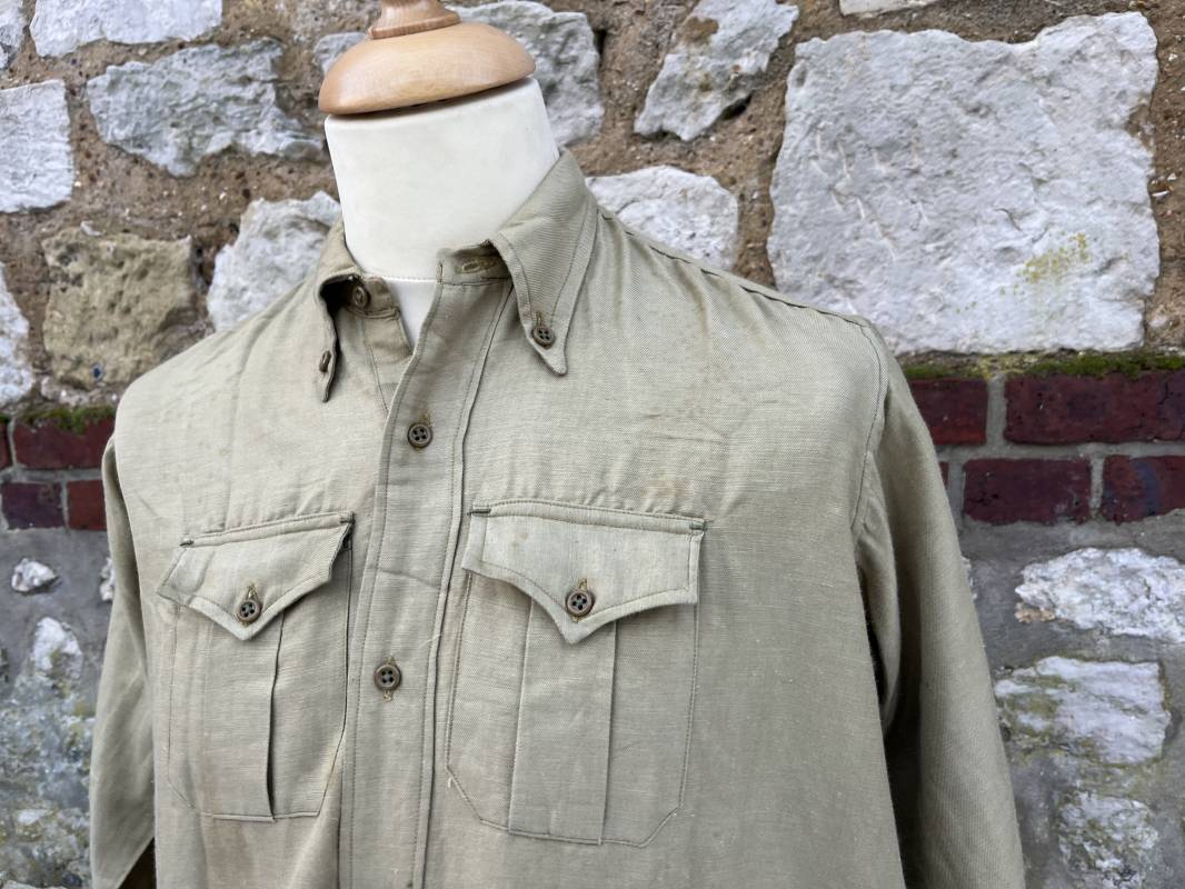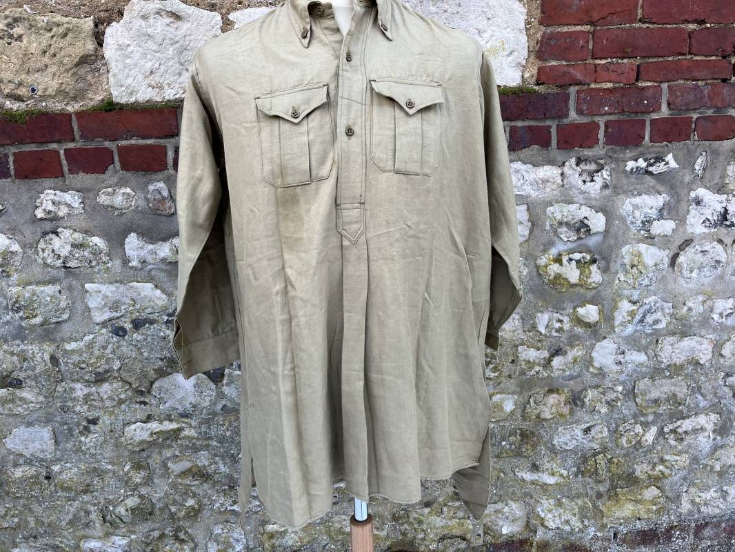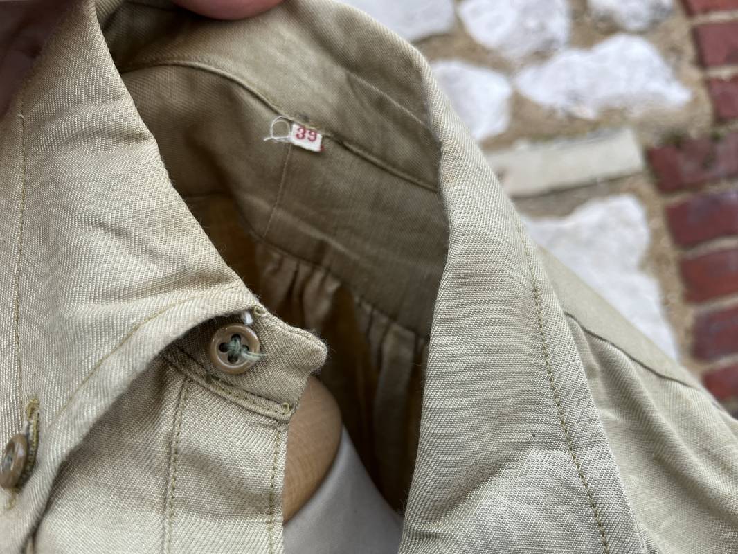 Trés belle chemise Troupe modèle 1935 en coton kaki clair . Chemise réglementaire, deux poches de poitrine. Col boutonné. Boutons en plastique cousus d'origine. Chemise lègèrement portée en superbe etat . Etiquette taille 39 au col . Largeur d'épaules 41cm. Longueur 93 cm. Manches 52 cm. 1935/40. Ref 21309
