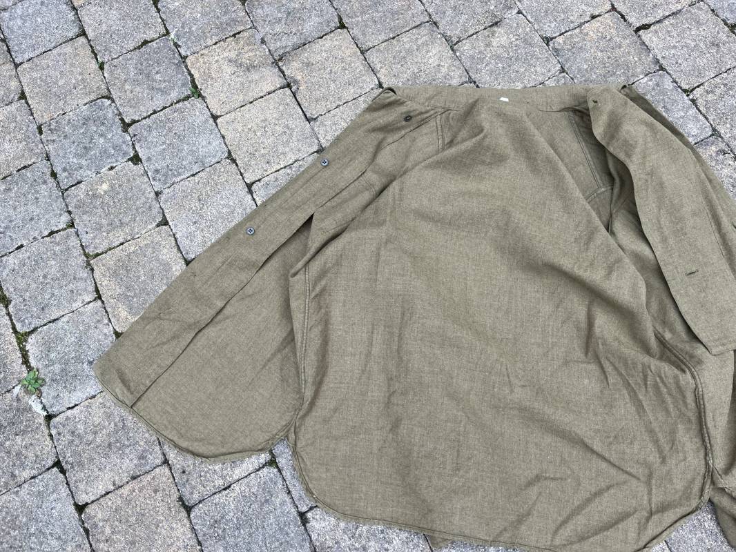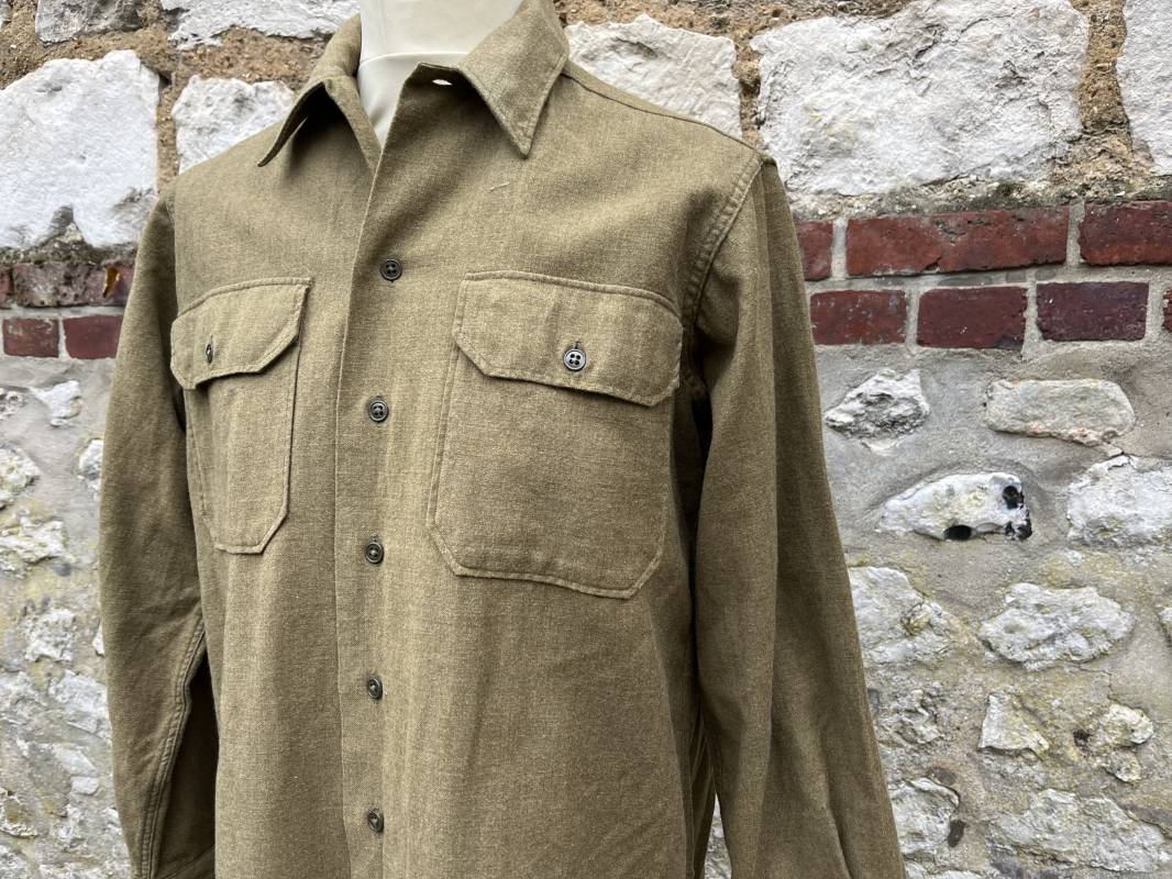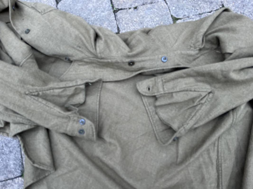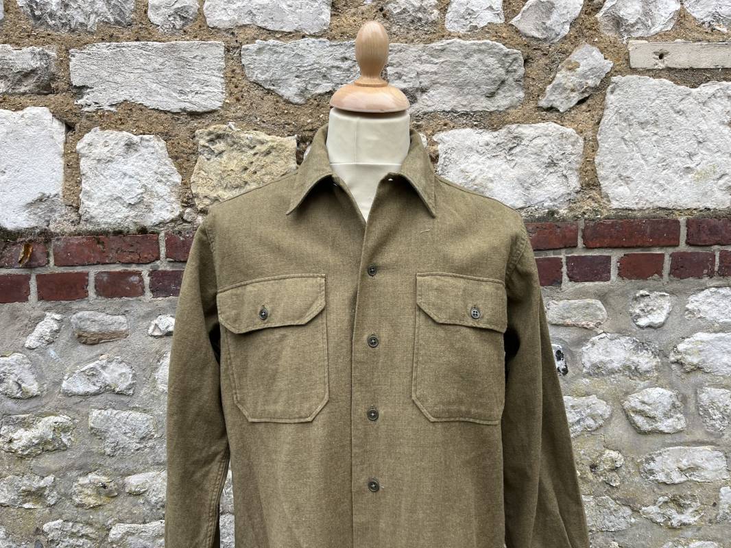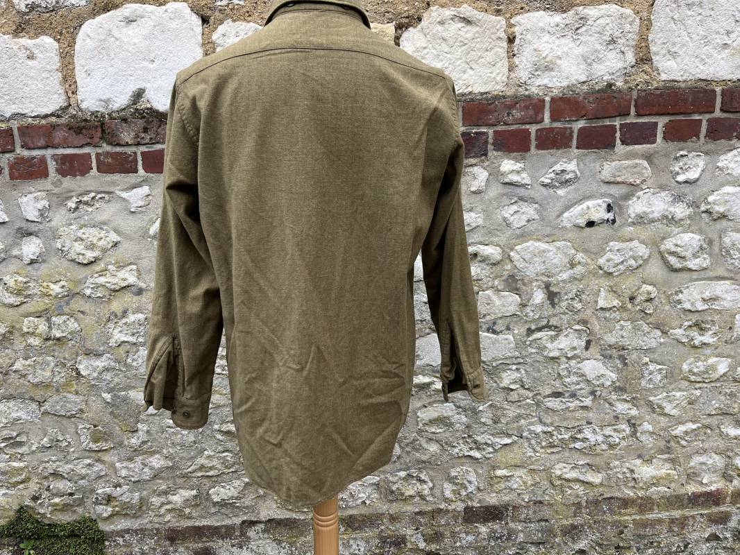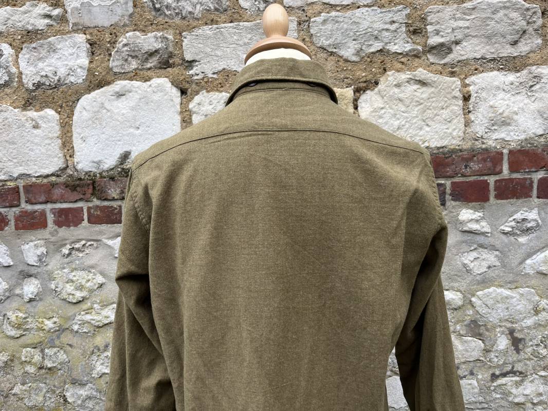 Chemise réglementaire modèle 1937 en flanelle de laine brun. Col en pointe ouvert. Deux poches de poitrine.Fermeture frontale par sept boutons, boutons plastique vert cousus d'origine. Rabat anti gaz avec plastron tissu intérieur et soufflets d'étanchéité tissu en bouts de manches. Deux boutons cousus sur le derrière du col pour la cagoule anti gaz. Etiquette taille 16 34 . Largeur épaules 45 cm , longueur 80 cm , manche 60 cm . Légèrement portée en parfait état 1942/45. Ref 21165