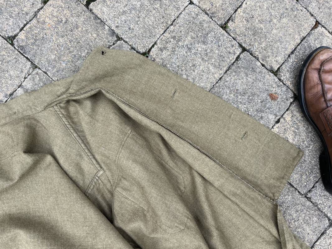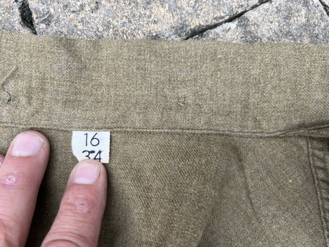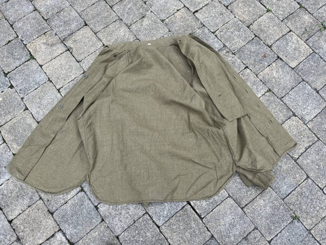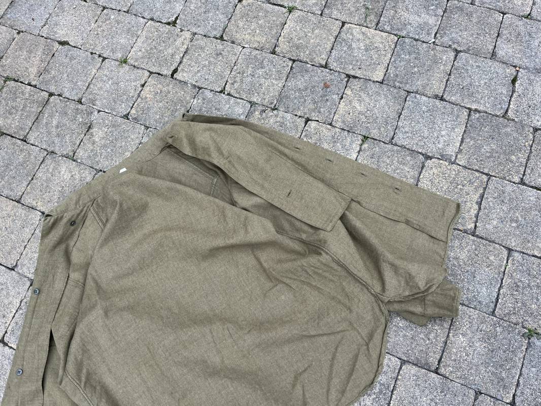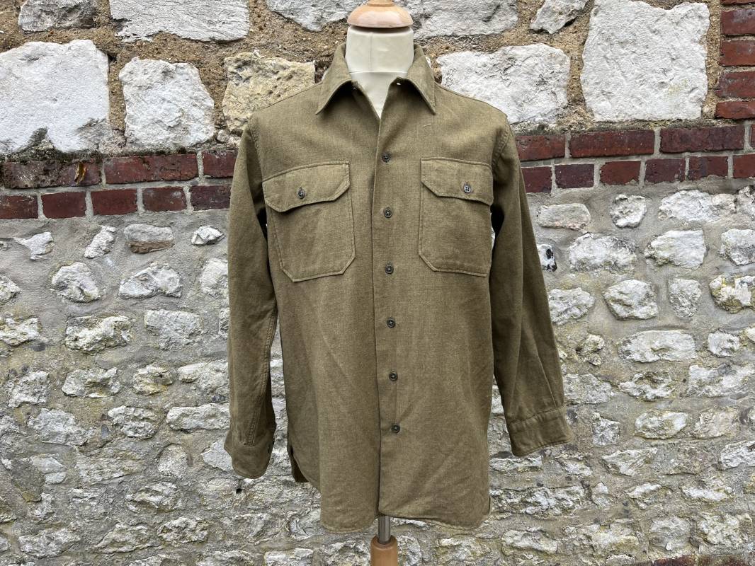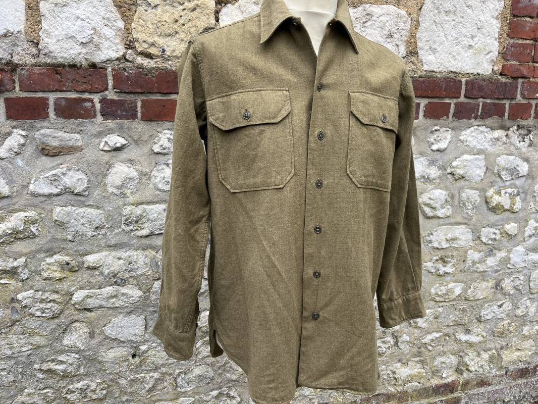 Chemise réglementaire modèle 1937 en flanelle de laine brun. Col en pointe ouvert. Deux poches de poitrine.Fermeture frontale par sept boutons, boutons plastique vert cousus d'origine. Rabat anti gaz avec plastron tissu intérieur et soufflets d'étanchéité tissu en bouts de manches. Deux boutons cousus sur le derrière du col pour la cagoule anti gaz. Etiquette taille 16 34 . Largeur épaules 45 cm , longueur 80 cm , manche 60 cm . Légèrement portée en parfait état 1942/45. Ref 21165