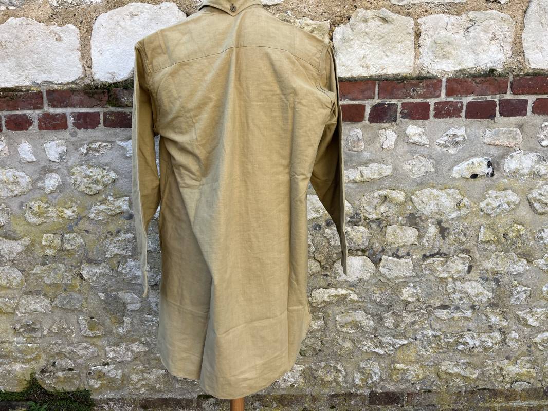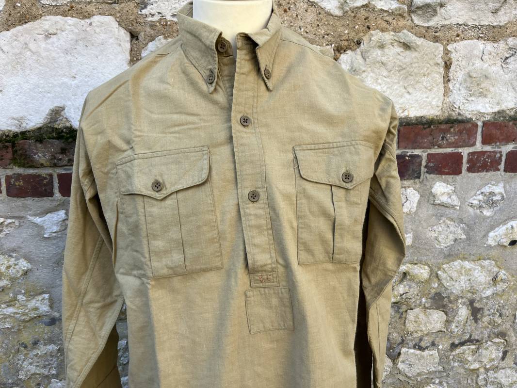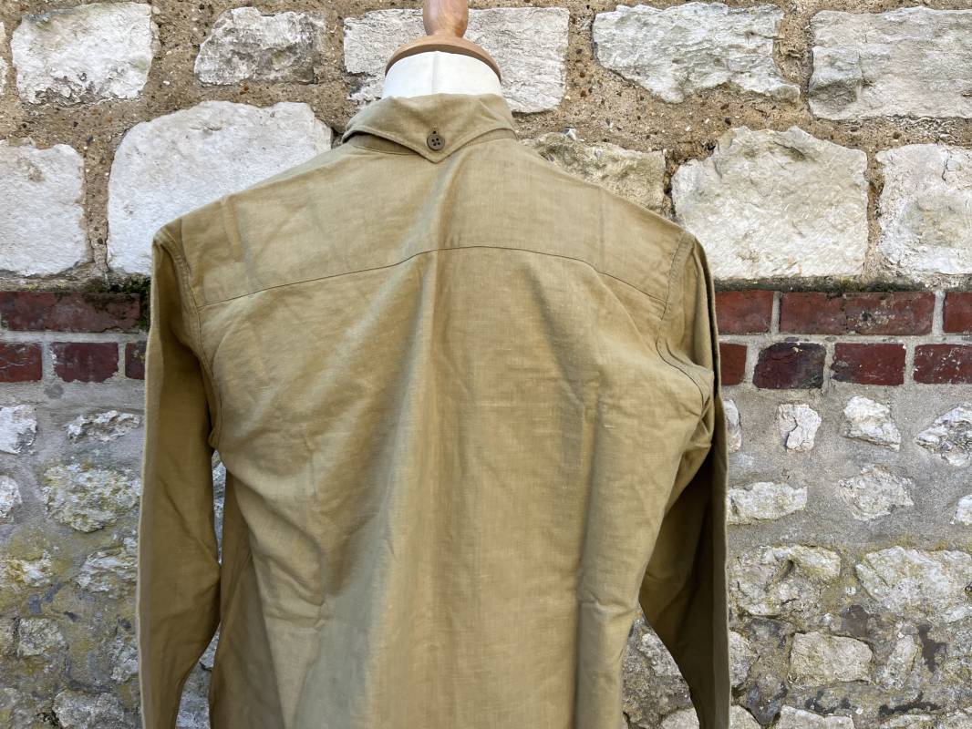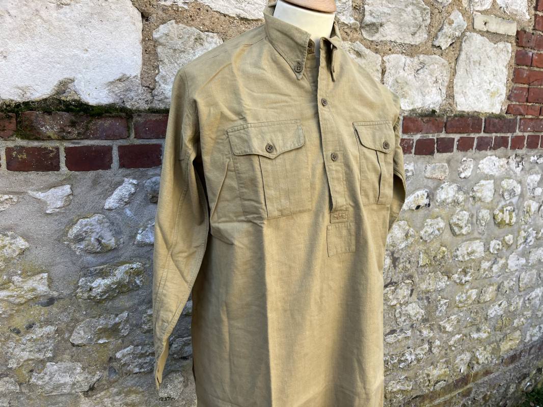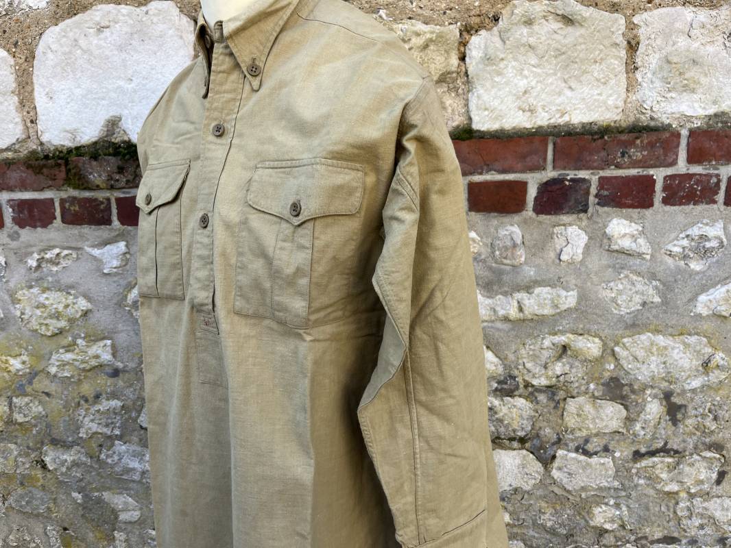 Trés belle chemise Troupe modèle 1935 en coton laineux kaki type hiver ( plus epais que les modeles coton ordinaires ) . Chemise réglementaire, deux poches de poitrine. Col boutonné. Boutons en plastique kaki cousus d'origine. Chemise dans un trés bel . Largeur d'épaules 45cm. Longueur 100 cm. Manches 58 cm. 1935/40. Chemise en tres bel etat , sans aucun défaut . Pièce définitive en collection Ref 21338