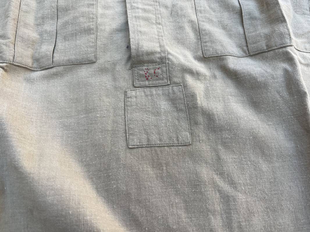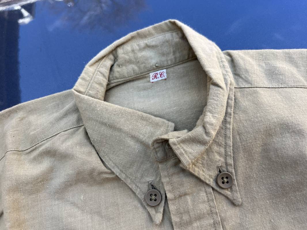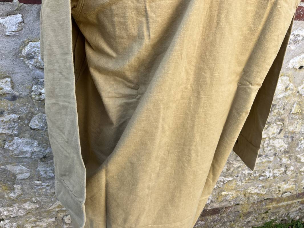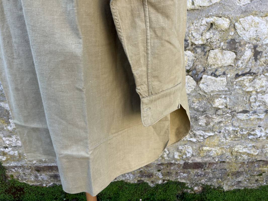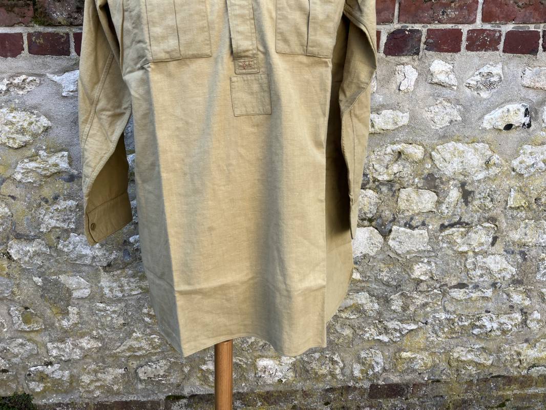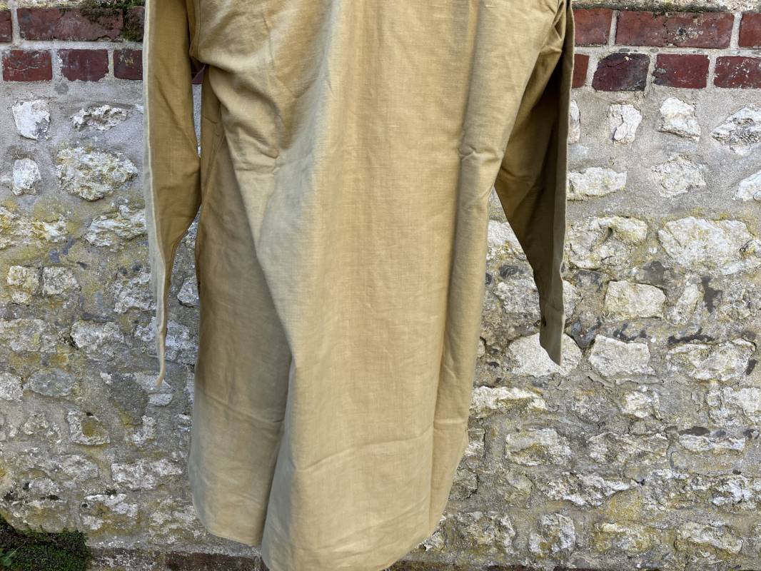 Trés belle chemise Troupe modèle 1935 en coton laineux kaki type hiver ( plus epais que les modeles coton ordinaires ) . Chemise réglementaire, deux poches de poitrine. Col boutonné. Boutons en plastique kaki cousus d'origine. Chemise dans un trés bel . Largeur d'épaules 45cm. Longueur 100 cm. Manches 58 cm. 1935/40. Chemise en tres bel etat , sans aucun défaut . Pièce définitive en collection Ref 21338