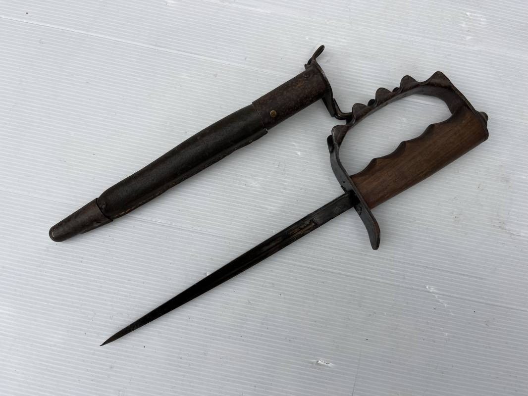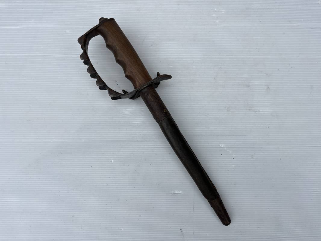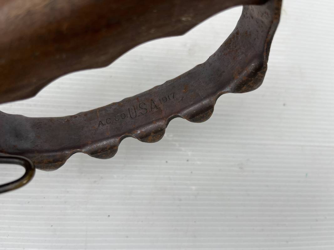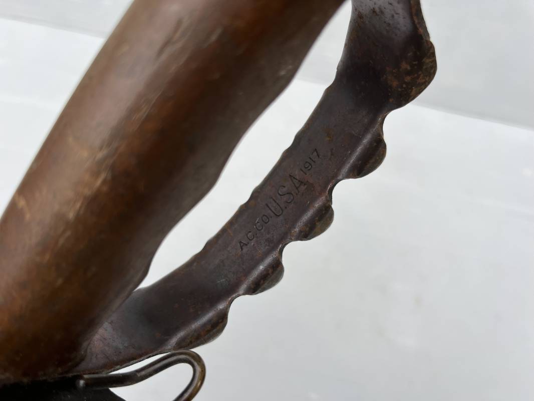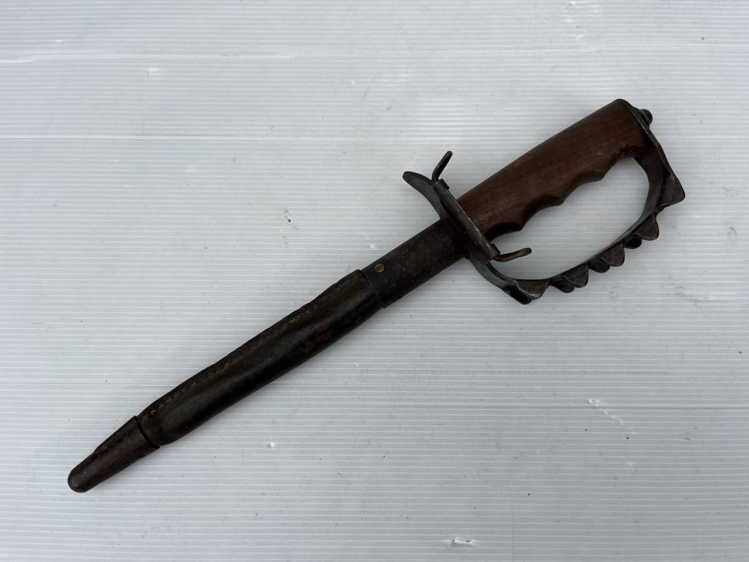 Rare couteau de tranchée Mdle 1917 du premier type avec dents seprarées du poing americain . Fabricant A C Co USA 1917 . Lame cruciforme . Manche bois . Fourreau en cuir peint en vert . Embout et chape métallique avec crochet de suspension . Bel ensemble porté en bel état 1917/18