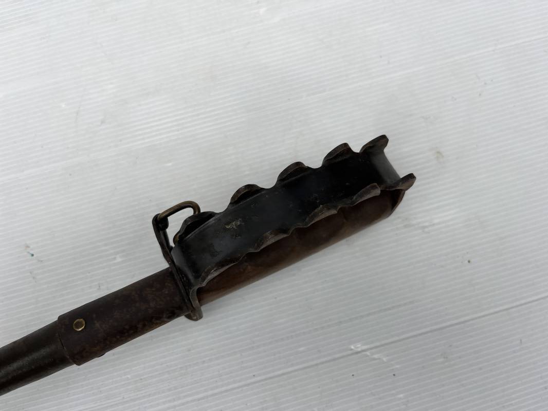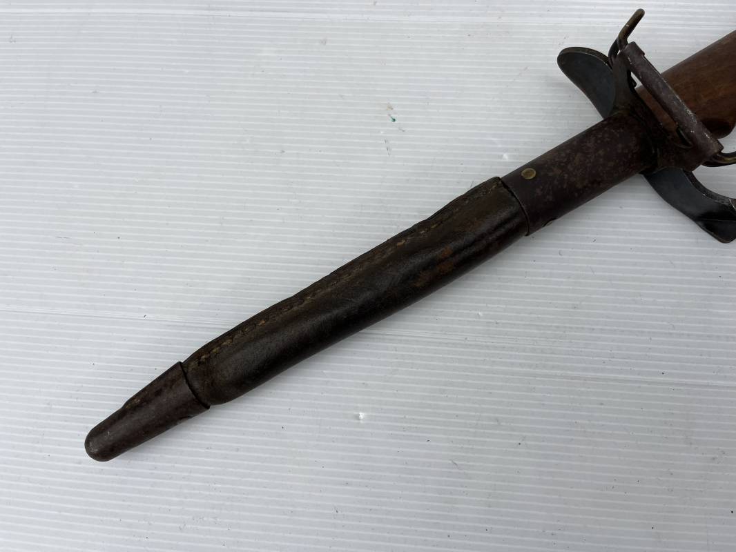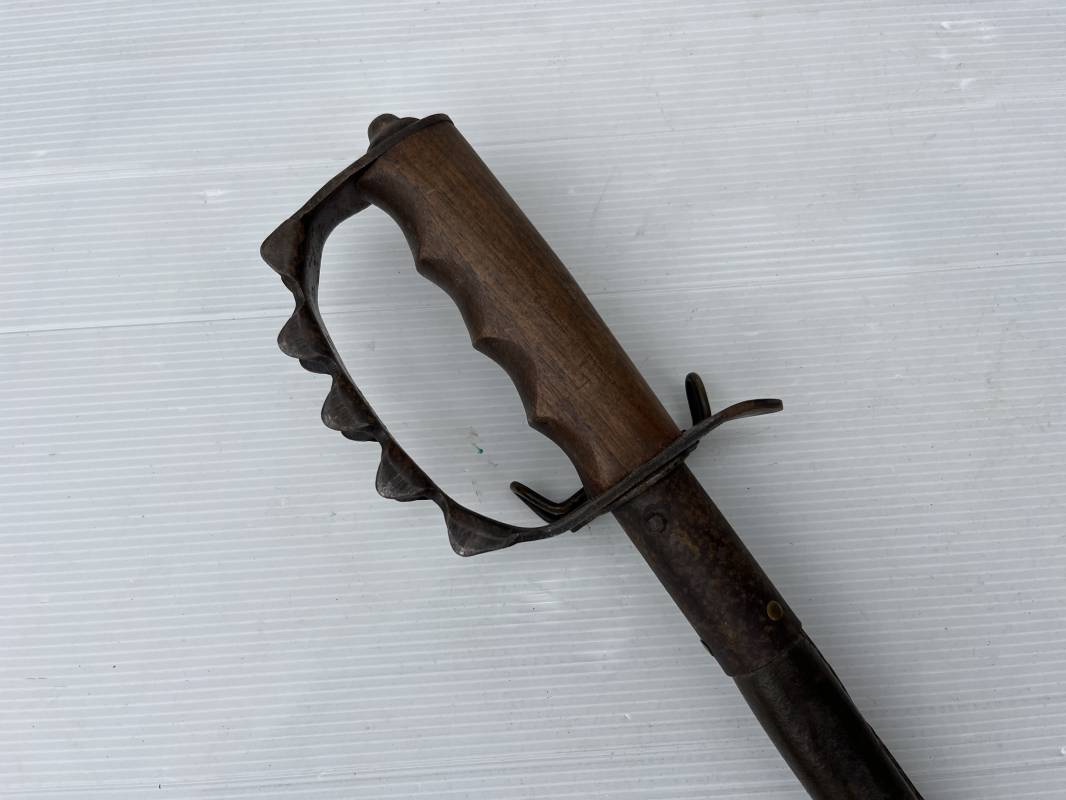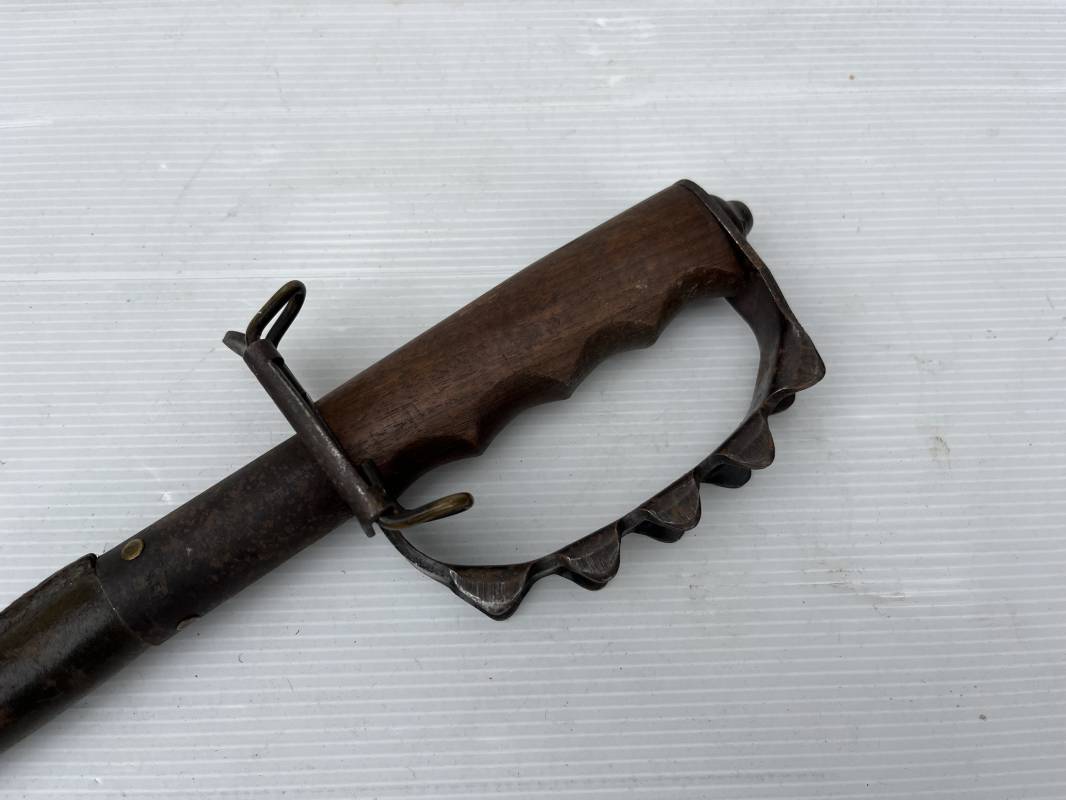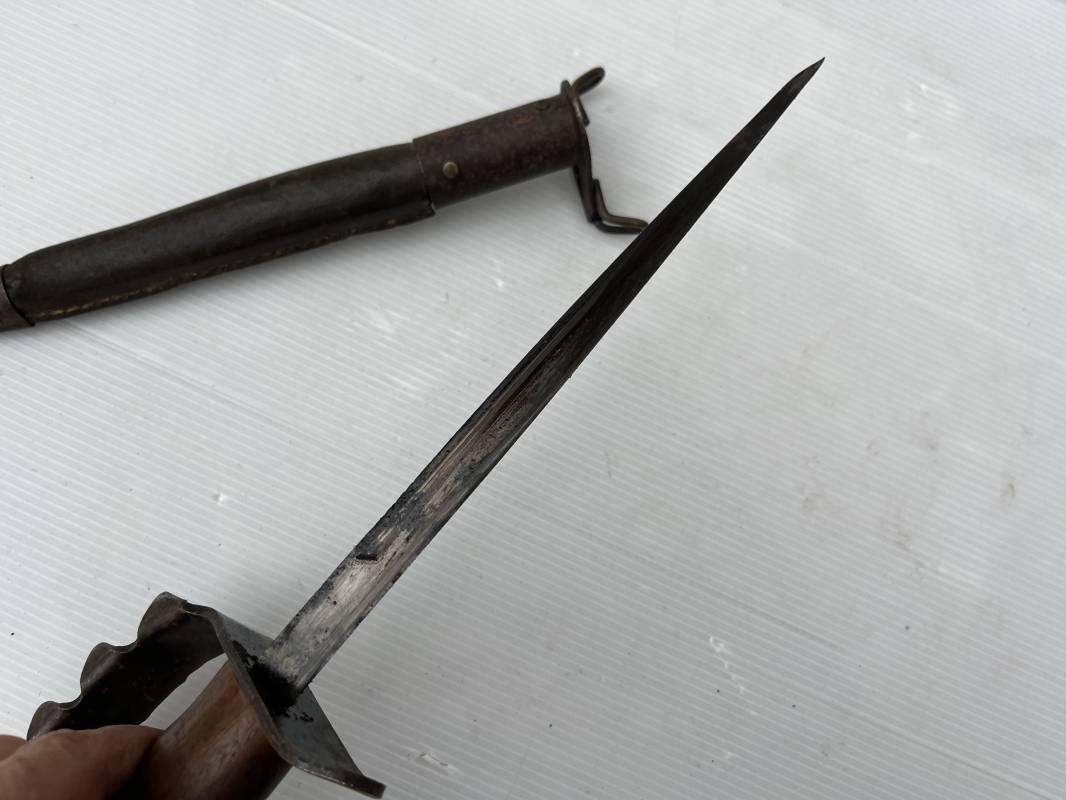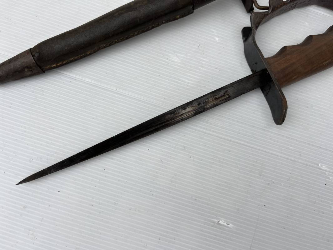Rare couteau de tranchée Mdle 1917 du premier type avec dents seprarées du poing americain . Fabricant A C Co USA 1917 . Lame cruciforme . Manche bois . Fourreau en cuir peint en vert . Embout et chape métallique avec crochet de suspension . Bel ensemble porté en bel état 1917/18