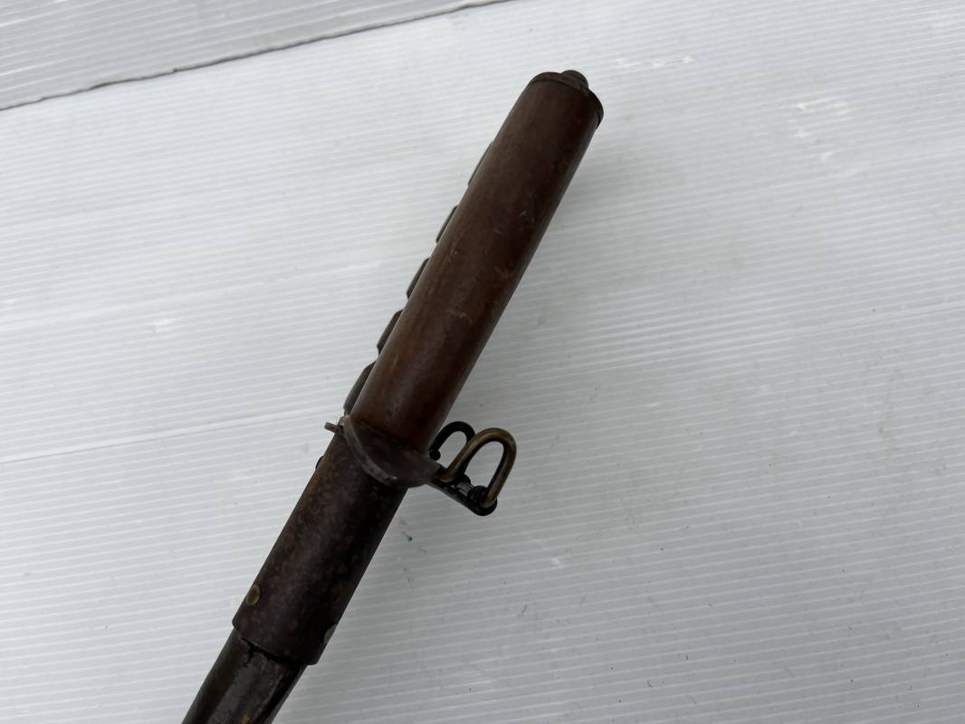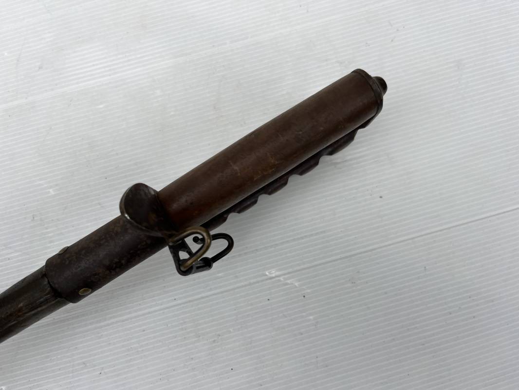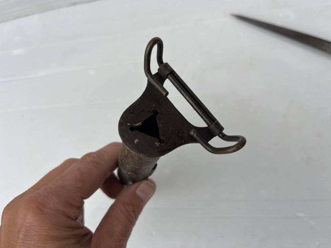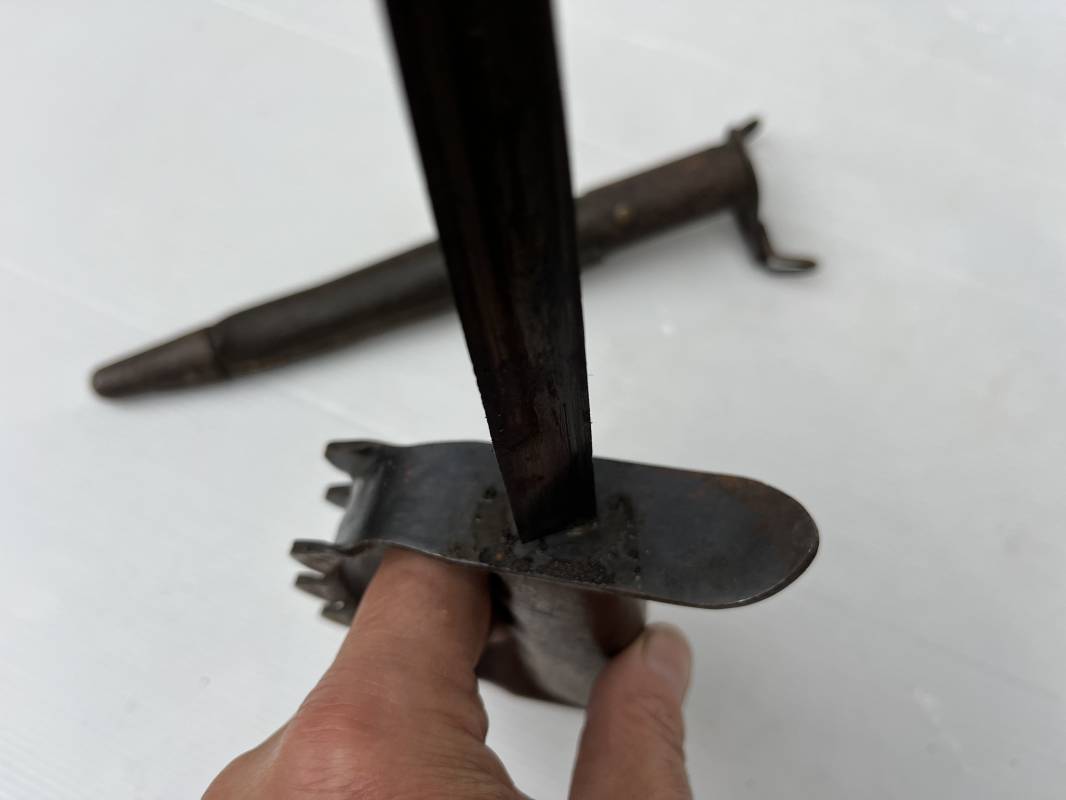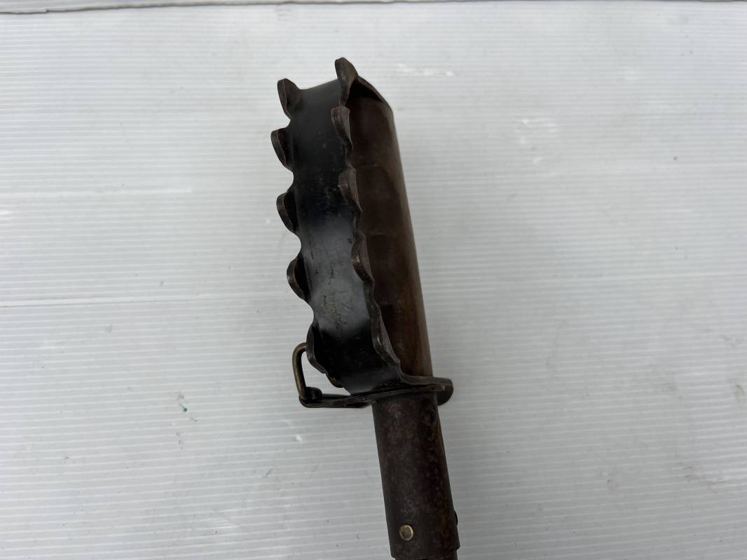 Rare couteau de tranchée Mdle 1917 du premier type avec dents seprarées du poing americain . Fabricant A C Co USA 1917 . Lame cruciforme . Manche bois . Fourreau en cuir peint en vert . Embout et chape métallique avec crochet de suspension . Bel ensemble porté en bel état 1917/18