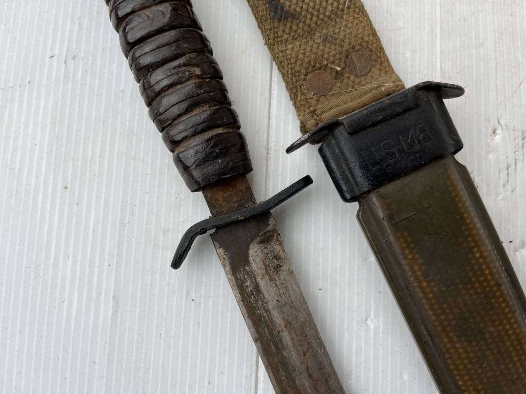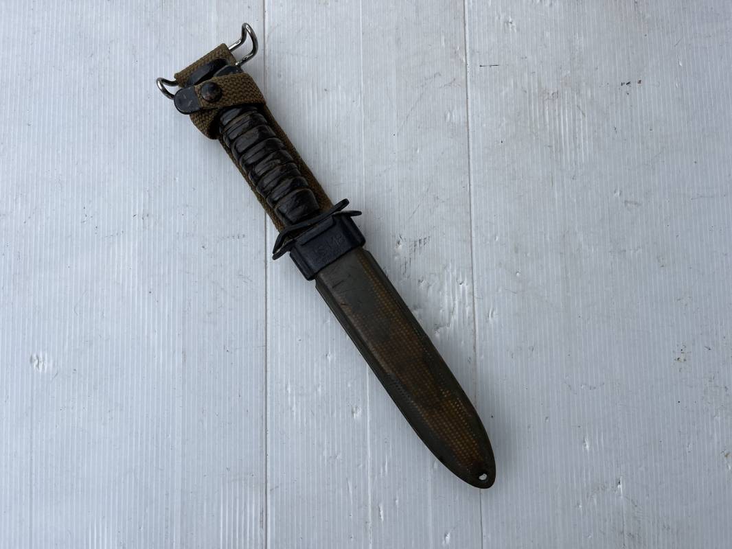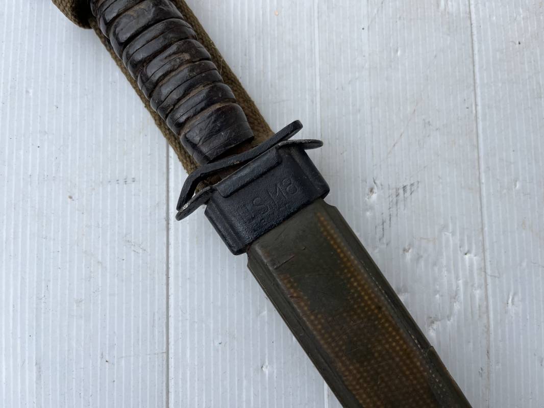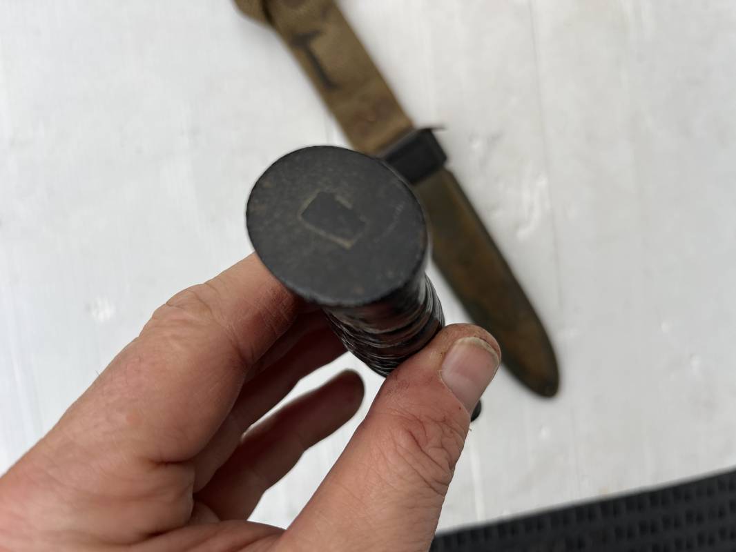 Couteau US M3 ( Knife Trench M3 ) et son fourreau USM8 . Poignée en cuir dont il manque environ 1 cm de rondin de cuir , Pommeau oval en acier avec grenade de l ordonnance corps . Lame acier avec marquage fabricant USM3 IMPERIAL .Garde acier légérement tordue . Fourreau en plastique thermoformé ( scabbard Trench knife M8 ) chape acier et marquage USM8 BMCO , passant de ceinturon en toile avec fermoir par bouton pression .Crochet fer de ceinturon Les parties en cacier saut la lame ont été peints en noir mate . 1942/43 Ref 19968
