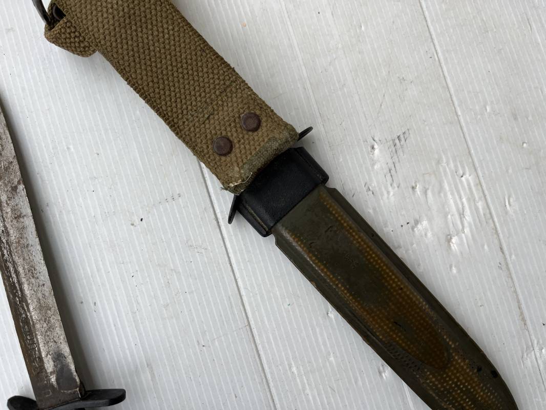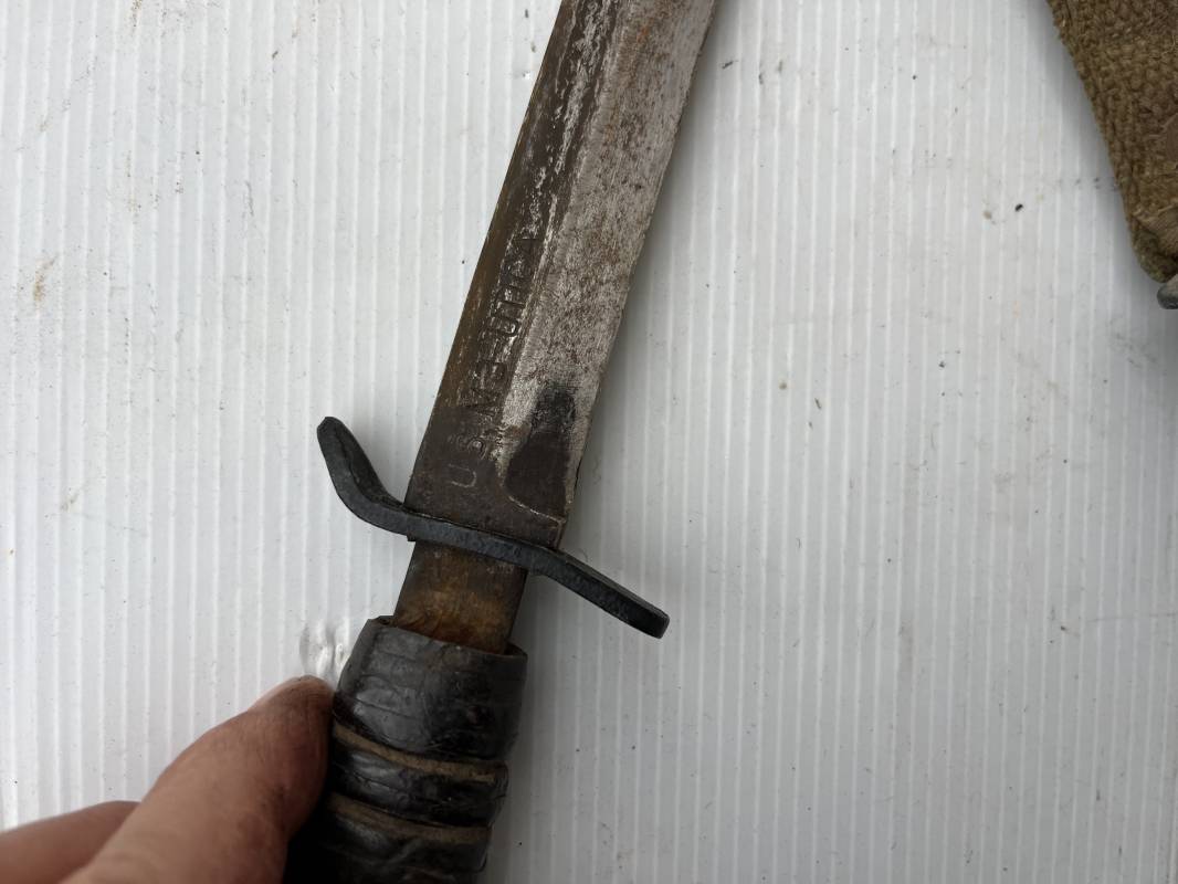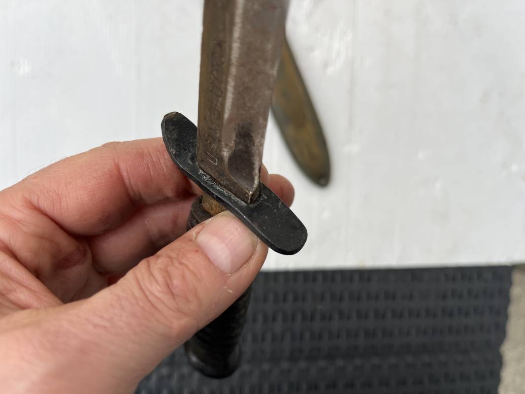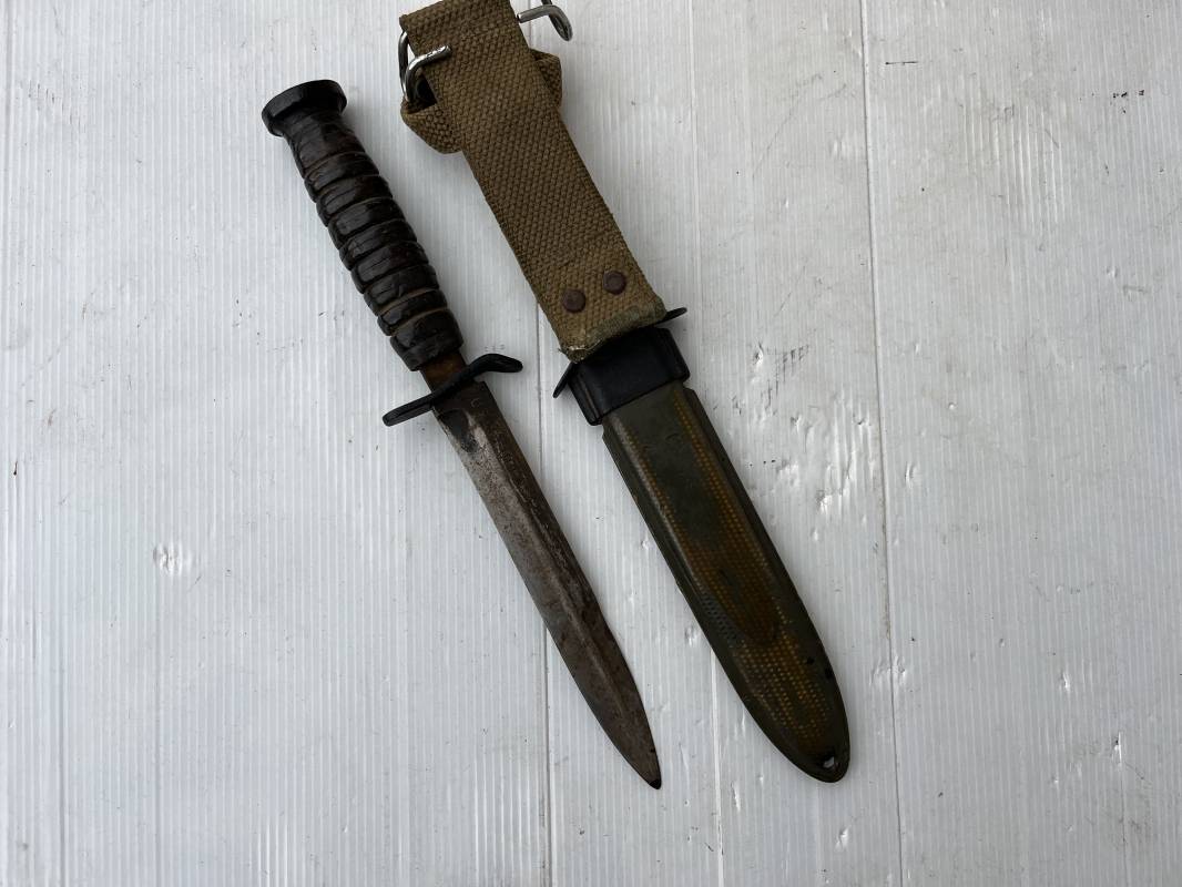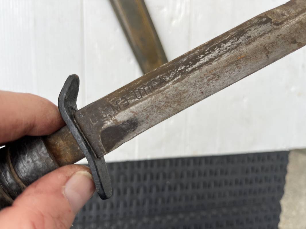 Couteau US M3 ( Knife Trench M3 ) et son fourreau USM8 . Poignée en cuir dont il manque environ 1 cm de rondin de cuir , Pommeau oval en acier avec grenade de l ordonnance corps . Lame acier avec marquage fabricant USM3 IMPERIAL .Garde acier légérement tordue . Fourreau en plastique thermoformé ( scabbard Trench knife M8 ) chape acier et marquage USM8 BMCO , passant de ceinturon en toile avec fermoir par bouton pression .Crochet fer de ceinturon Les parties en cacier saut la lame ont été peints en noir mate . 1942/43 Ref 19968