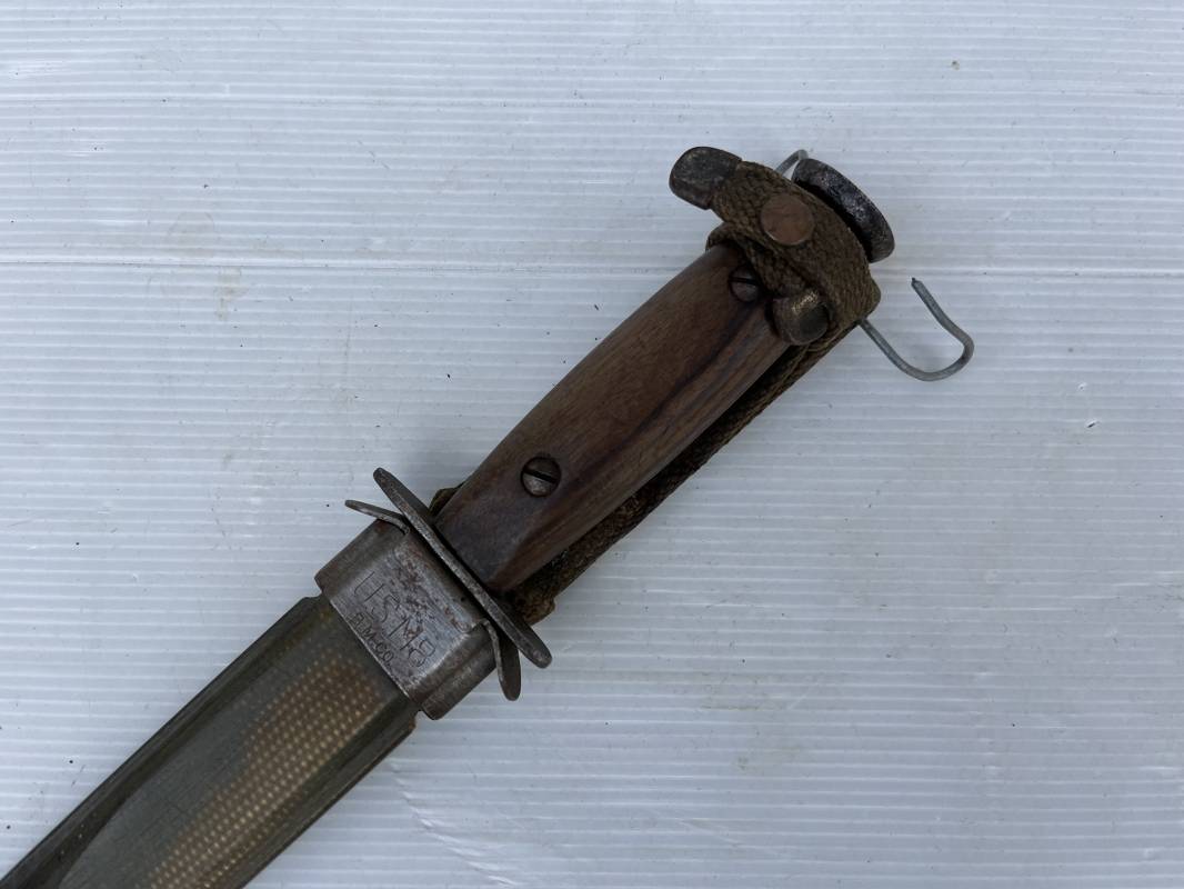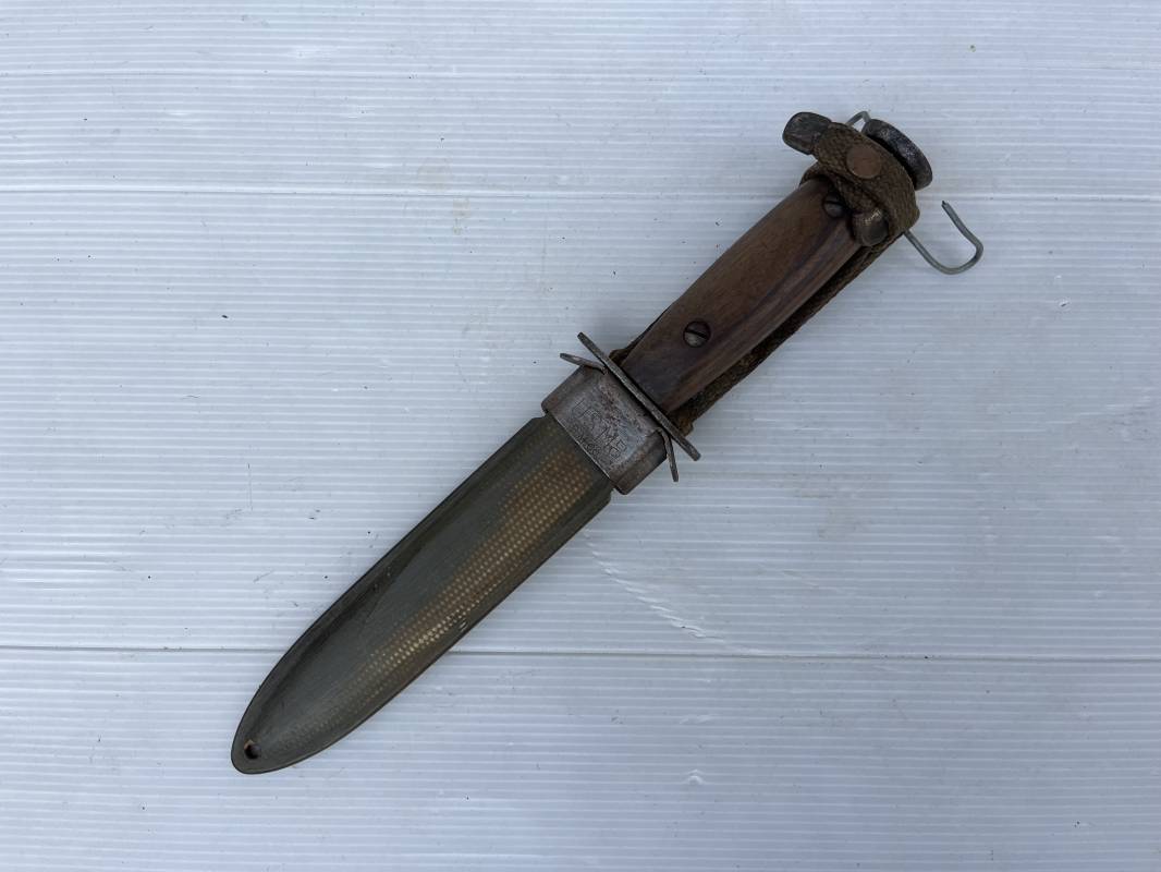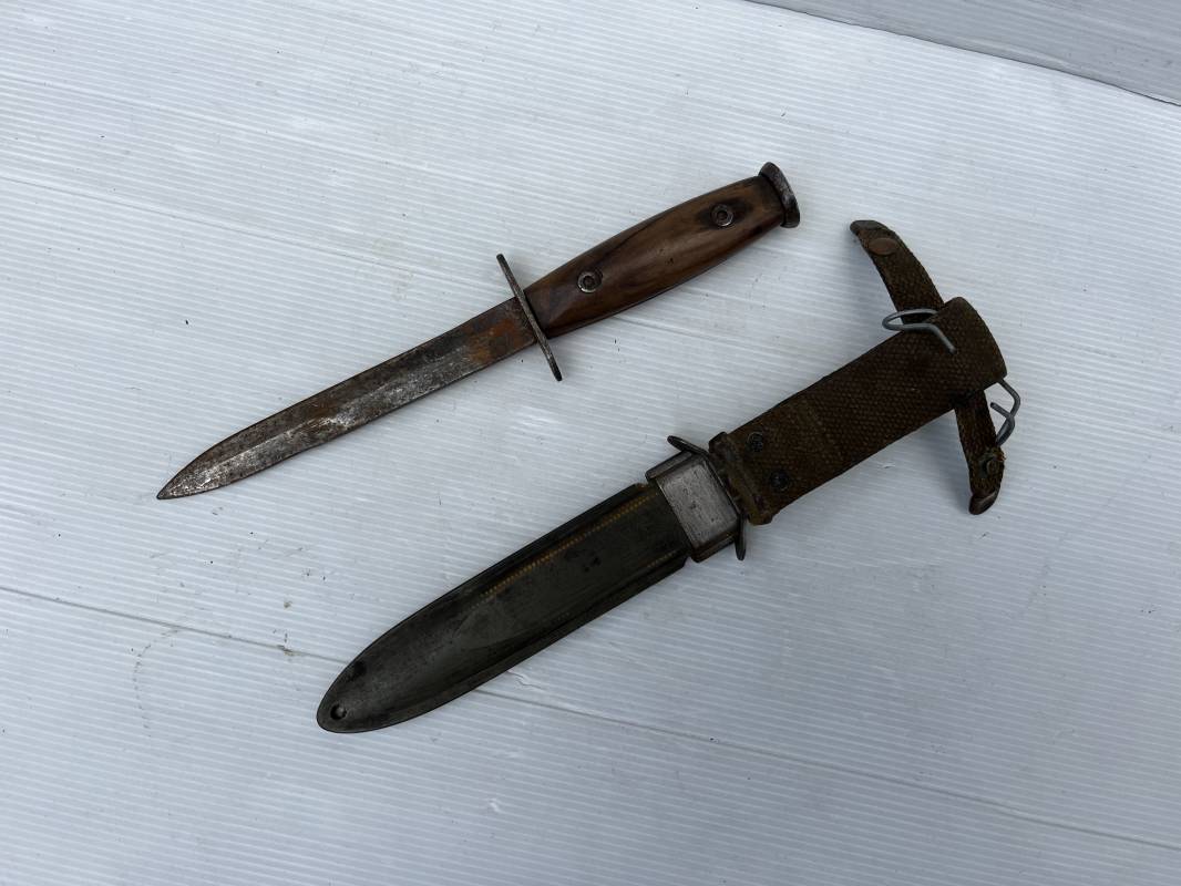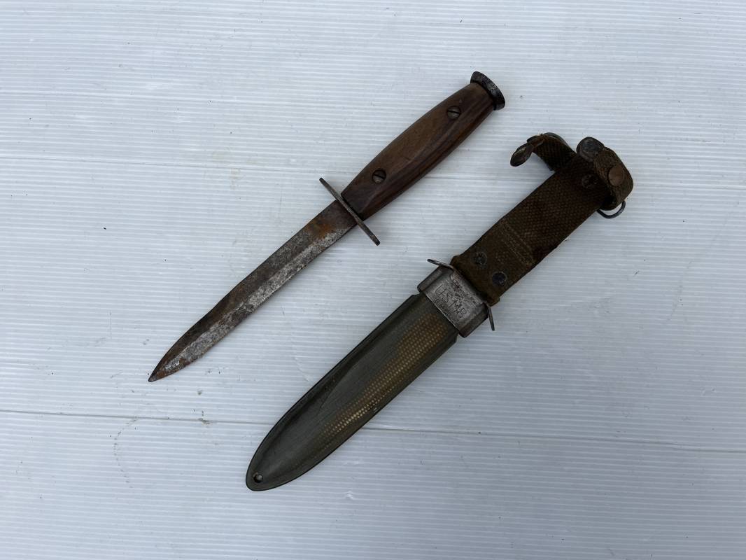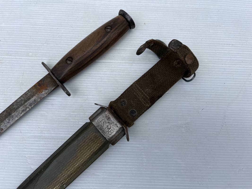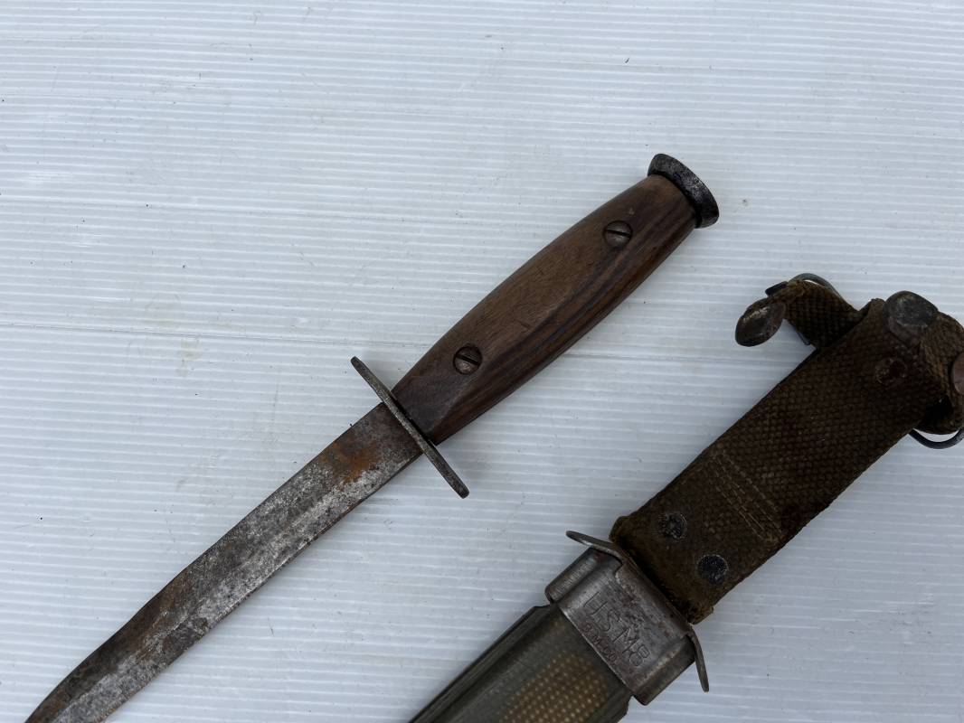 Rare couteau USM3 et fourreau M8 modifié extréme Orient . Couteau USM3 modifié avec remplacement de la poignée cuir par du nois . Fixation par deux visses . Pommeau acir oval Garde plate , lame du couteau USM3 Fourreau USM8 en plastique Thermoformé , chape en metal marquée USM8 BM Co . Passant de ceinturon en toile et fermoir a pression . Crochet fer du modéle francais pour le port au ceinturon . Poignard de combat peu courant typique des modele utilisé en Extrème Orient 1945/50 Ref 21212