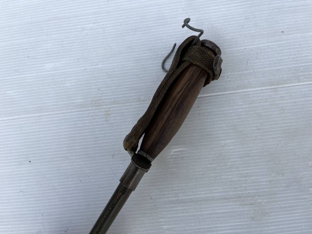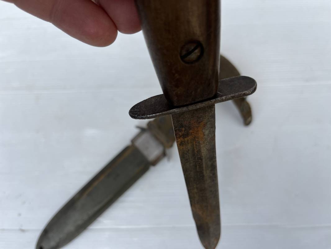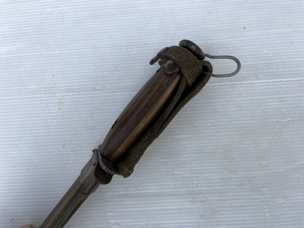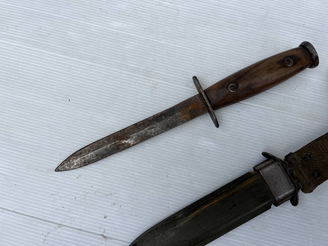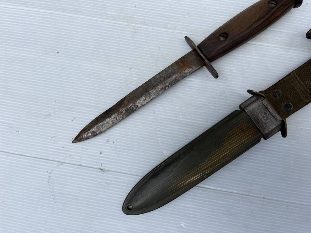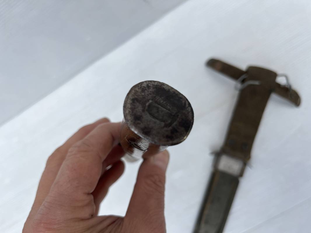 Rare couteau USM3 et fourreau M8 modifié extréme Orient . Couteau USM3 modifié avec remplacement de la poignée cuir par du nois . Fixation par deux visses . Pommeau acir oval Garde plate , lame du couteau USM3 Fourreau USM8 en plastique Thermoformé , chape en metal marquée USM8 BM Co . Passant de ceinturon en toile et fermoir a pression . Crochet fer du modéle francais pour le port au ceinturon . Poignard de combat peu courant typique des modele utilisé en Extrème Orient 1945/50 Ref 21212