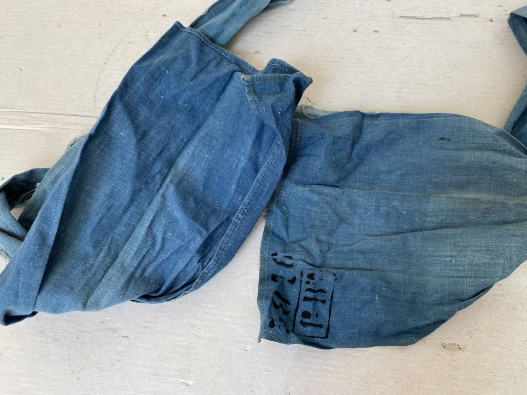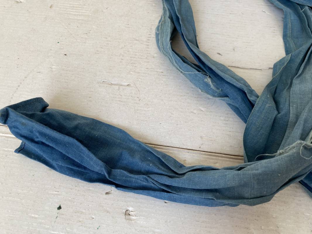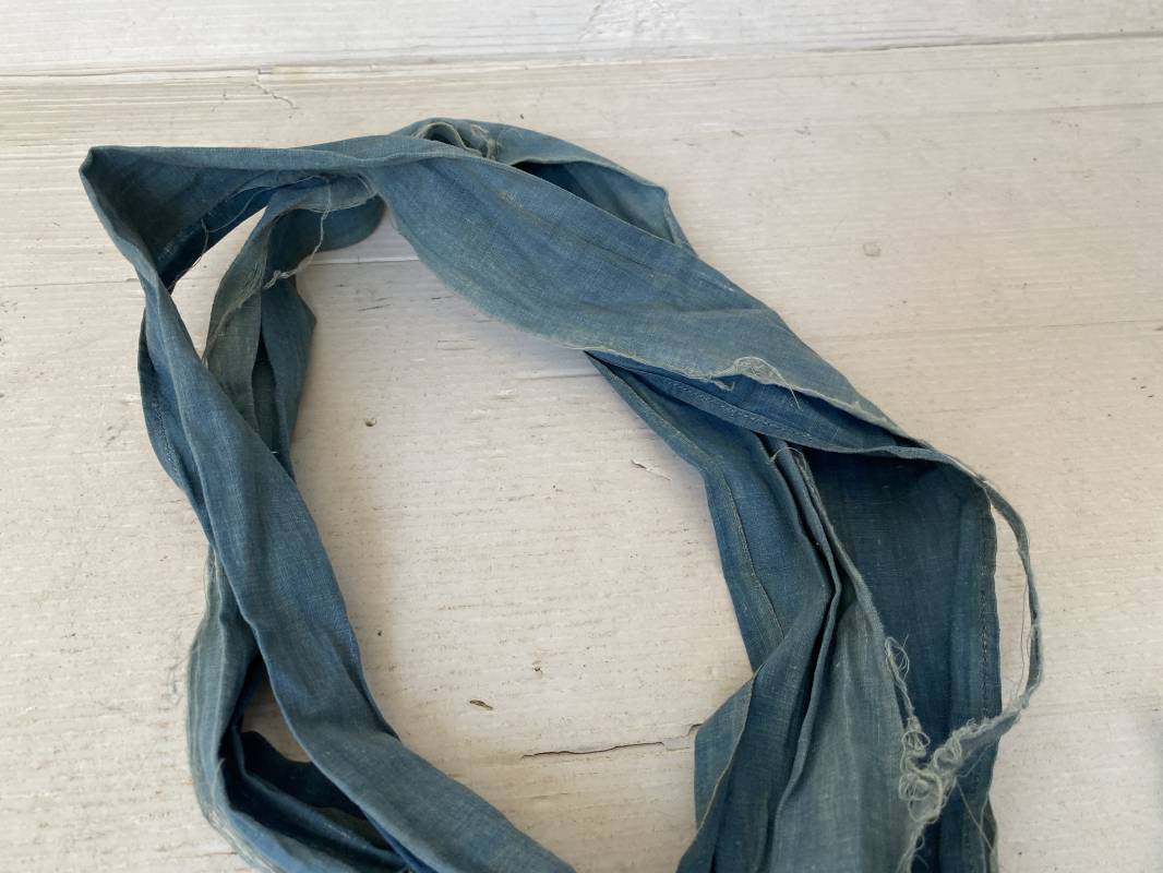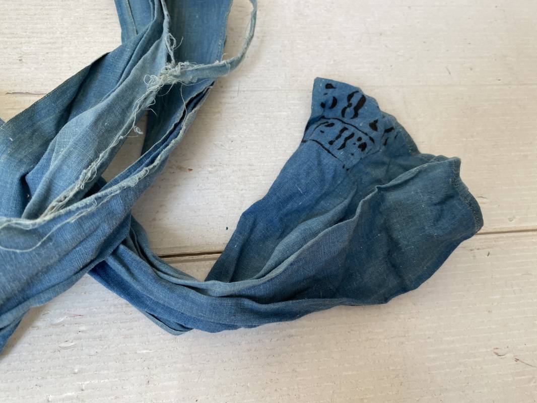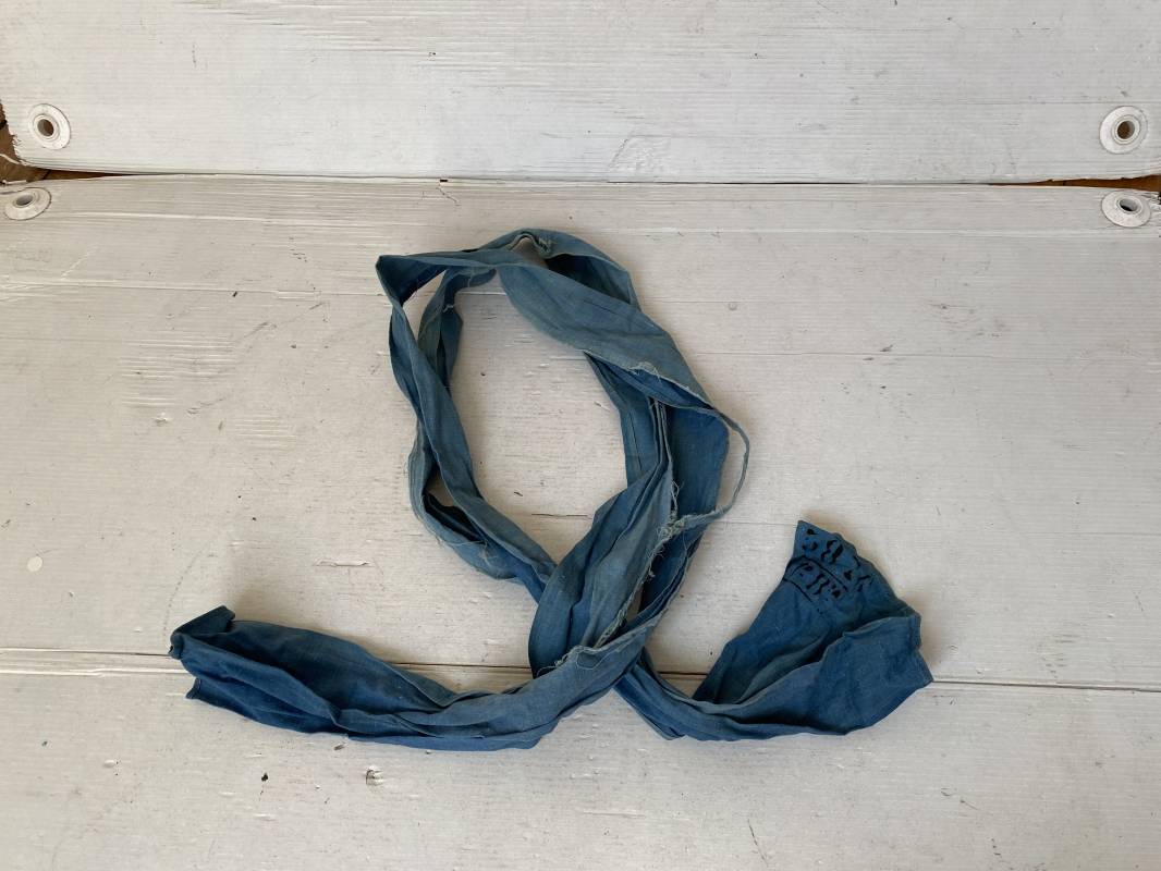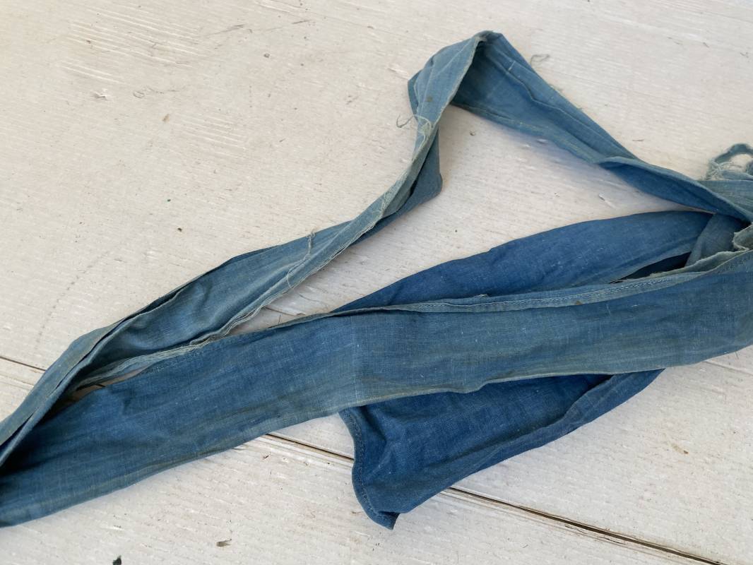 Rare cravate/tour de cou réglementaire troupe en toile calicot bleu horizon. Longueur 117cm. Largeur 20cm. Tampon encre noir matricule et affectations 1ere Batterie. Cravate portée avec traces et usure. Coupée en deux sur la longueur par frottement. Rare sous col pour poilu . 100 % dans son jus et intouché . Peu courant . 1915/18. Ref 16305