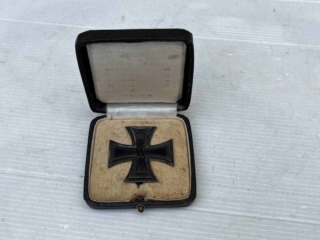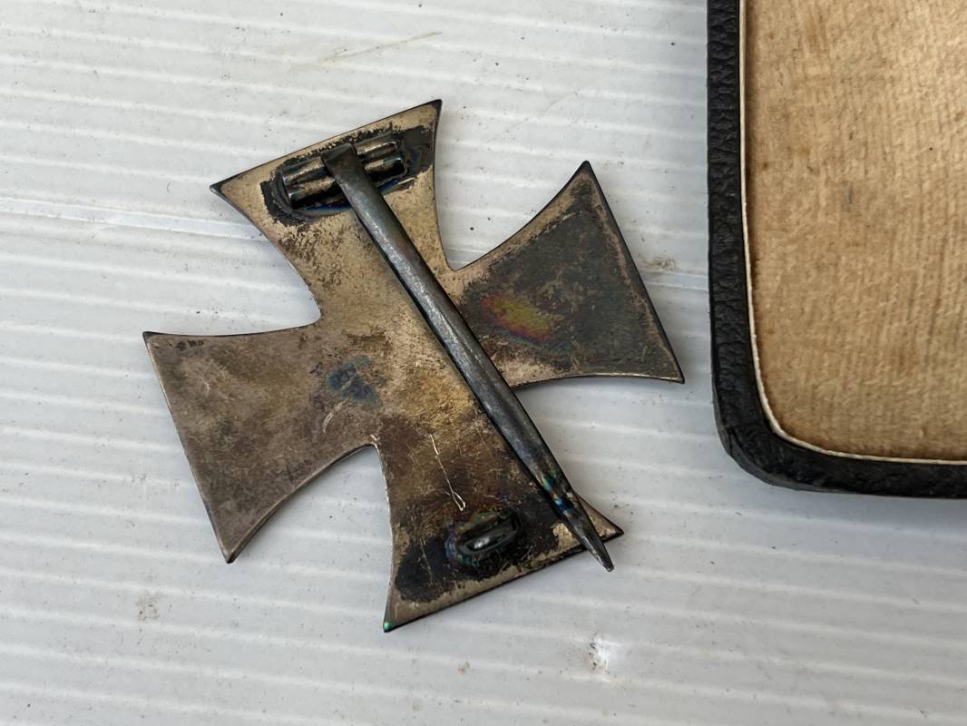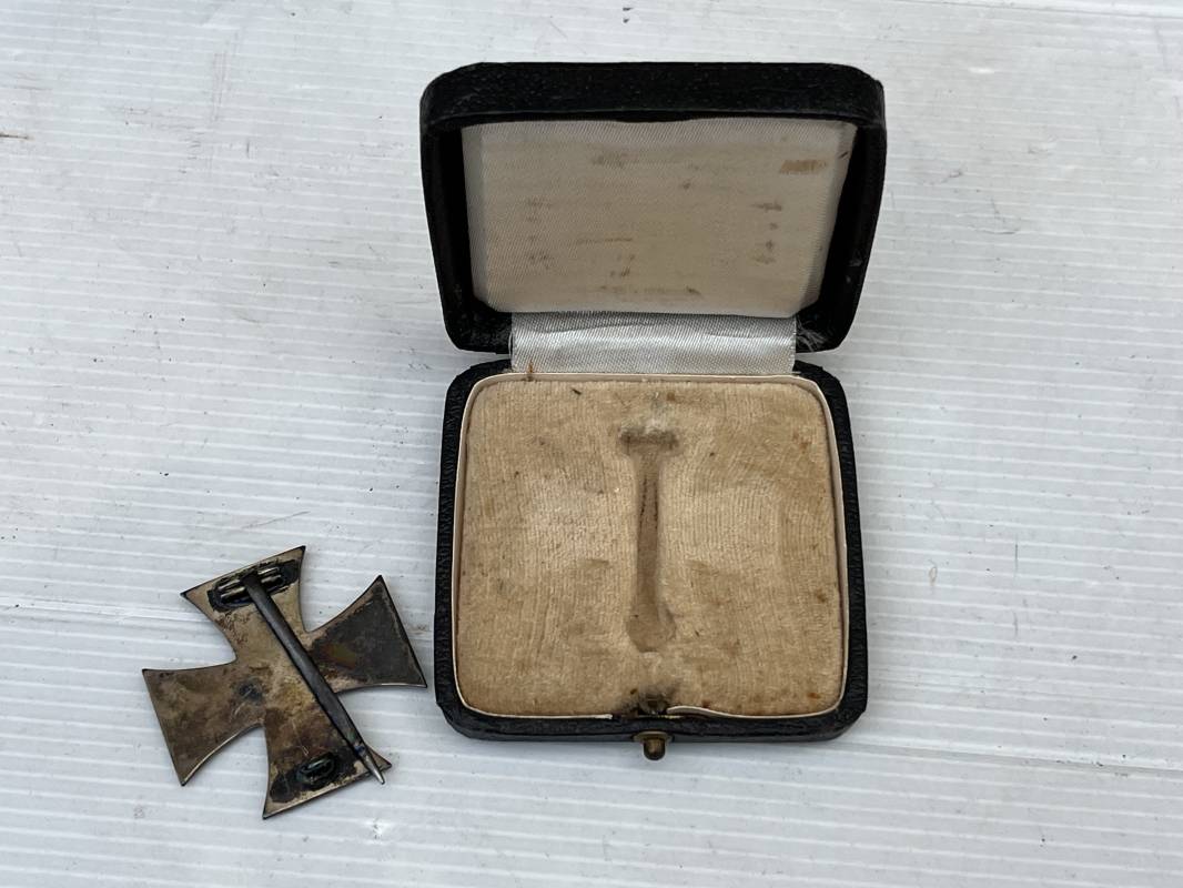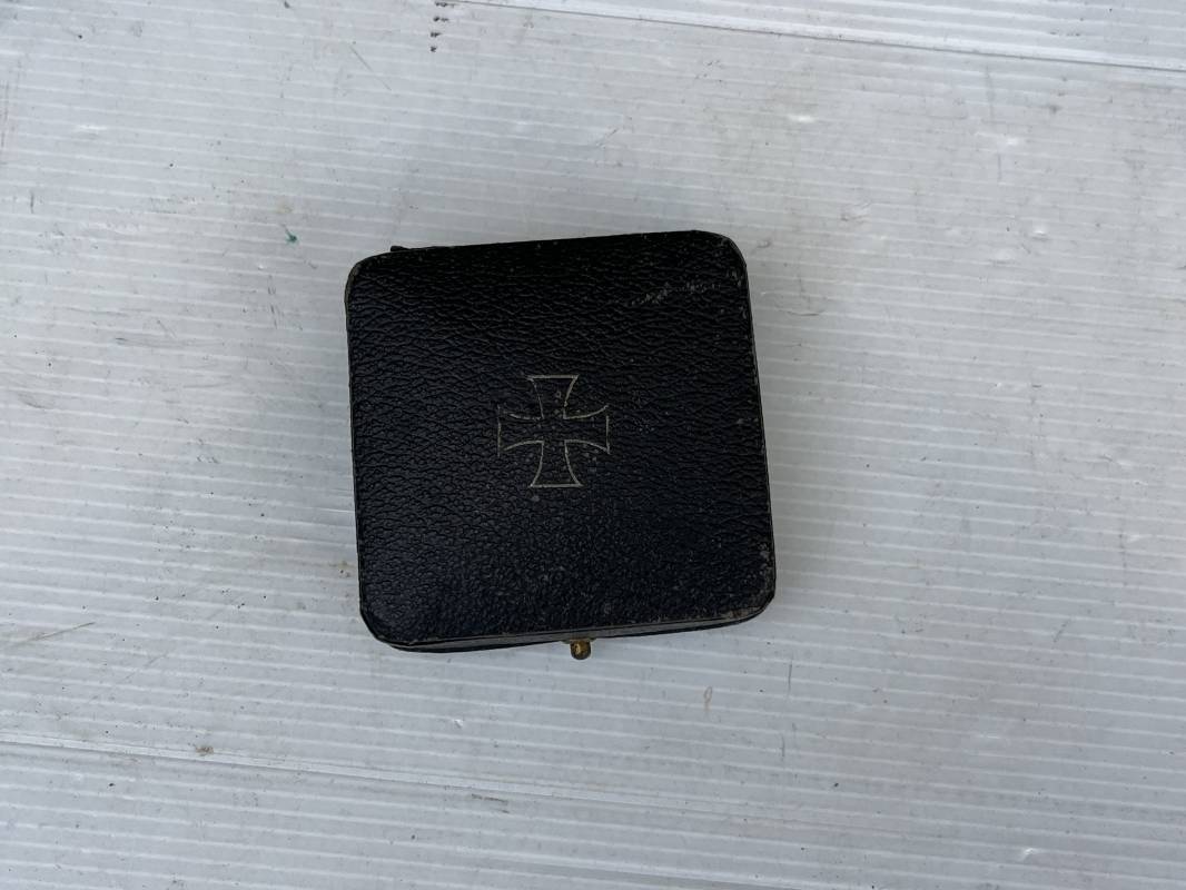 Belle croix de fer Première classe 1914 et son boitier . Croix de fer ; Fabrication en trois parties. Belle patine argent. Peinture noire mate d'origine. Marquage au dos "KO "( Klein & Quenzer Oberstein) . Attache et crochet d'origines. Belle forme plate. Porté en bon état . Boitier en carton recouvert papier noir , croix sur le dessus , bouton poussoir . Intérieur doublé en velours et soie de couleur créme . Bel ensemble 100 % nature trouvé en succession familkiale en Allemagne 1914/18 Ref . Ref 21161