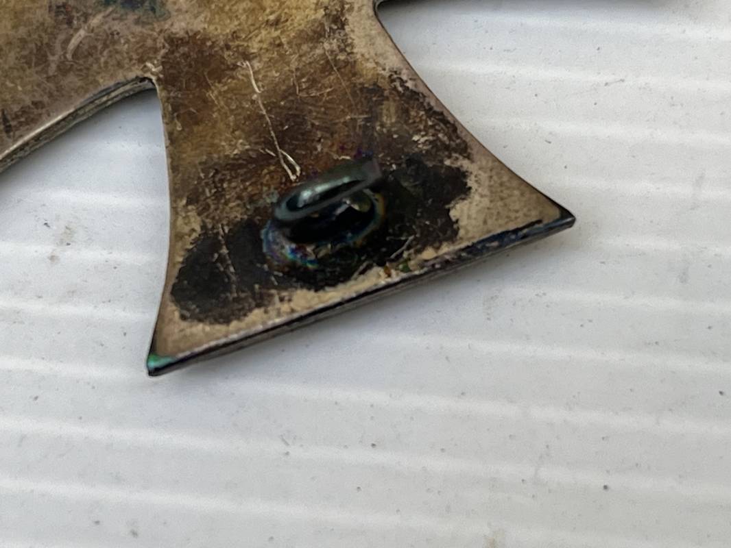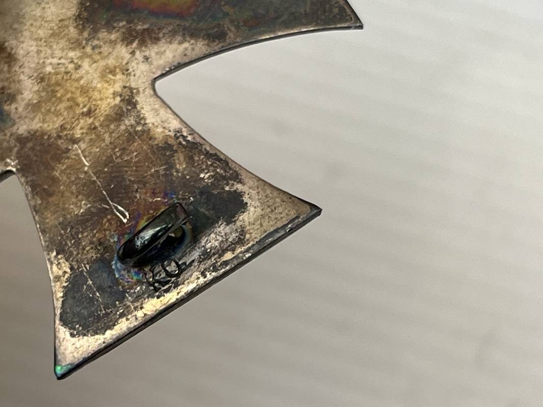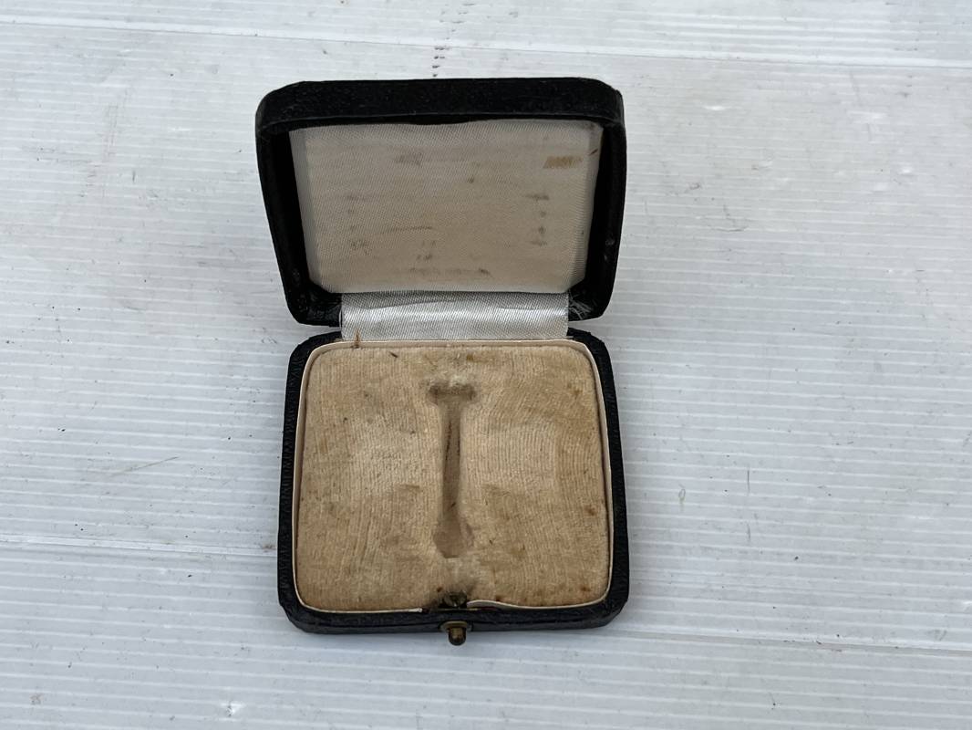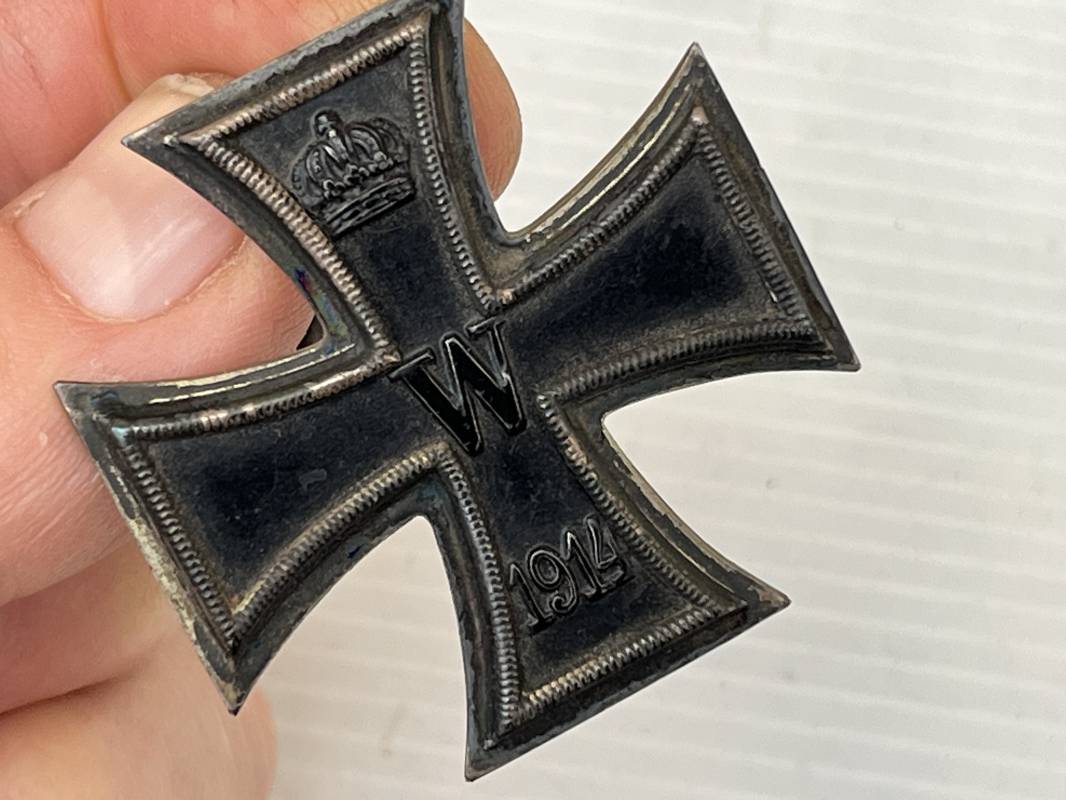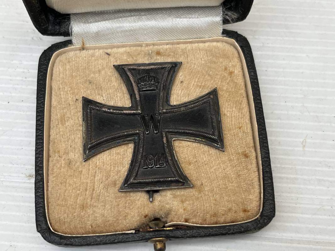 Belle croix de fer Première classe 1914 et son boitier . Croix de fer ; Fabrication en trois parties. Belle patine argent. Peinture noire mate d'origine. Marquage au dos "KO "( Klein & Quenzer Oberstein) . Attache et crochet d'origines. Belle forme plate. Porté en bon état . Boitier en carton recouvert papier noir , croix sur le dessus , bouton poussoir . Intérieur doublé en velours et soie de couleur créme . Bel ensemble 100 % nature trouvé en succession familkiale en Allemagne 1914/18 Ref . Ref 21161