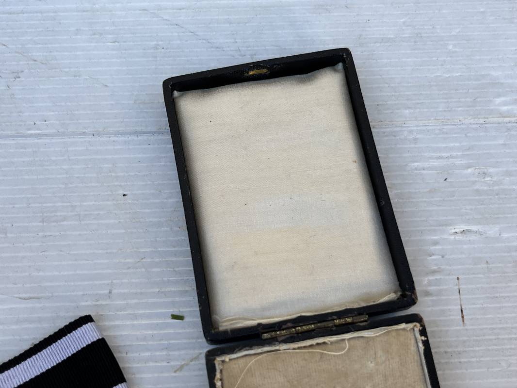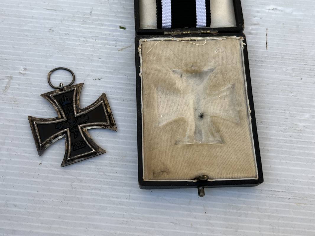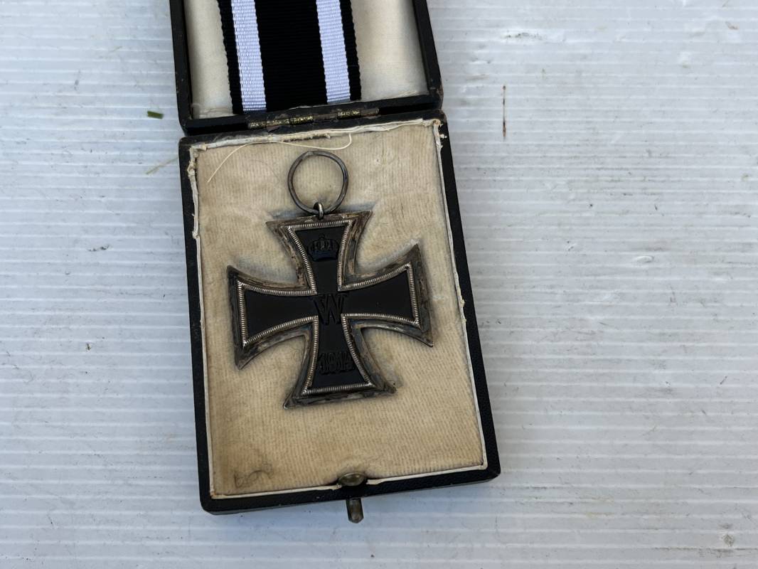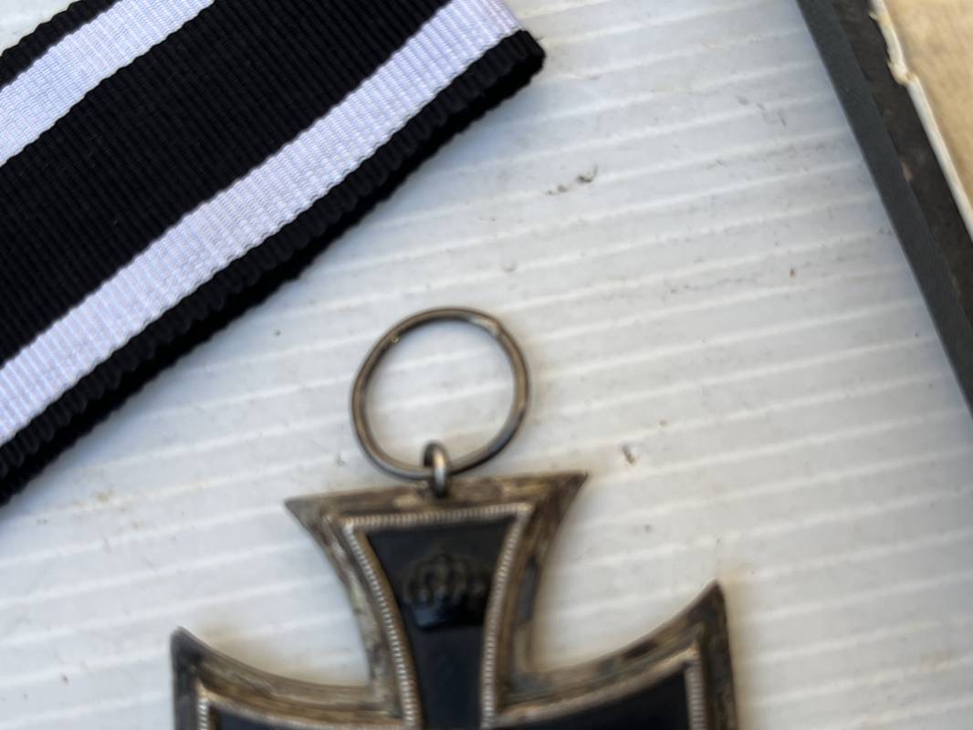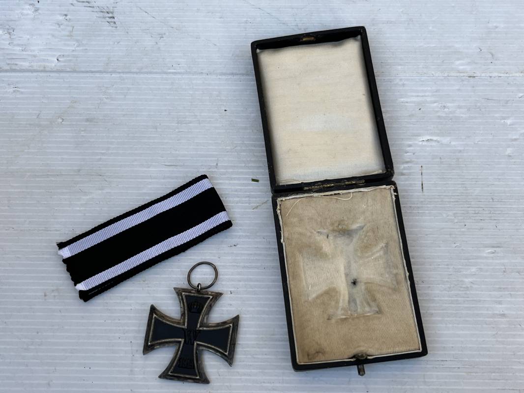 Belle croix de fer de 2éme classe 1914 et son boitier . Croix de fer avec peinture noire mate d origine , fabrication en plusieur parties . Anneau metallique . Ruban d origine . Boitier en carton recob=vert papier noir , bouton pussoir . Intérieur doublé en velours et soie de couleur créme . Bel ensemble trouvé en succession familiale en Allemagne Ref 21430