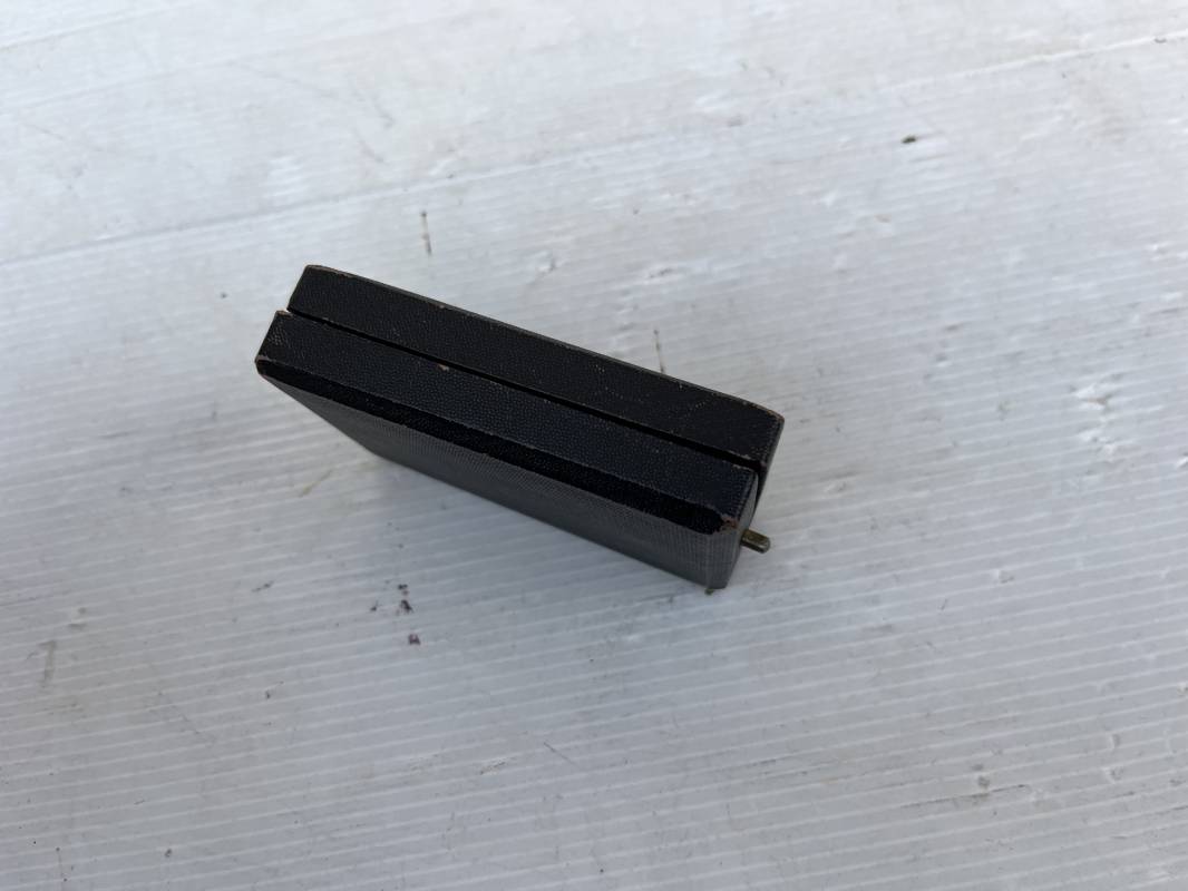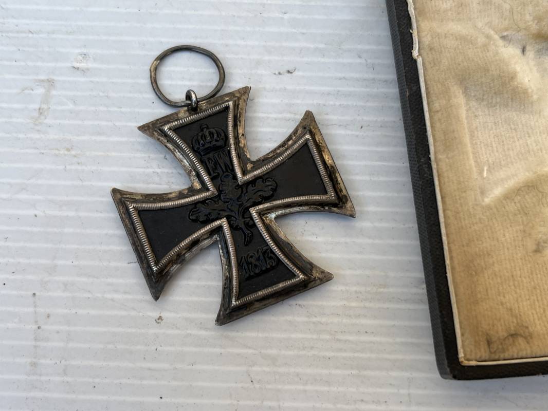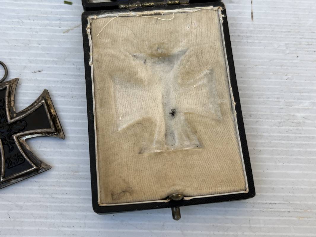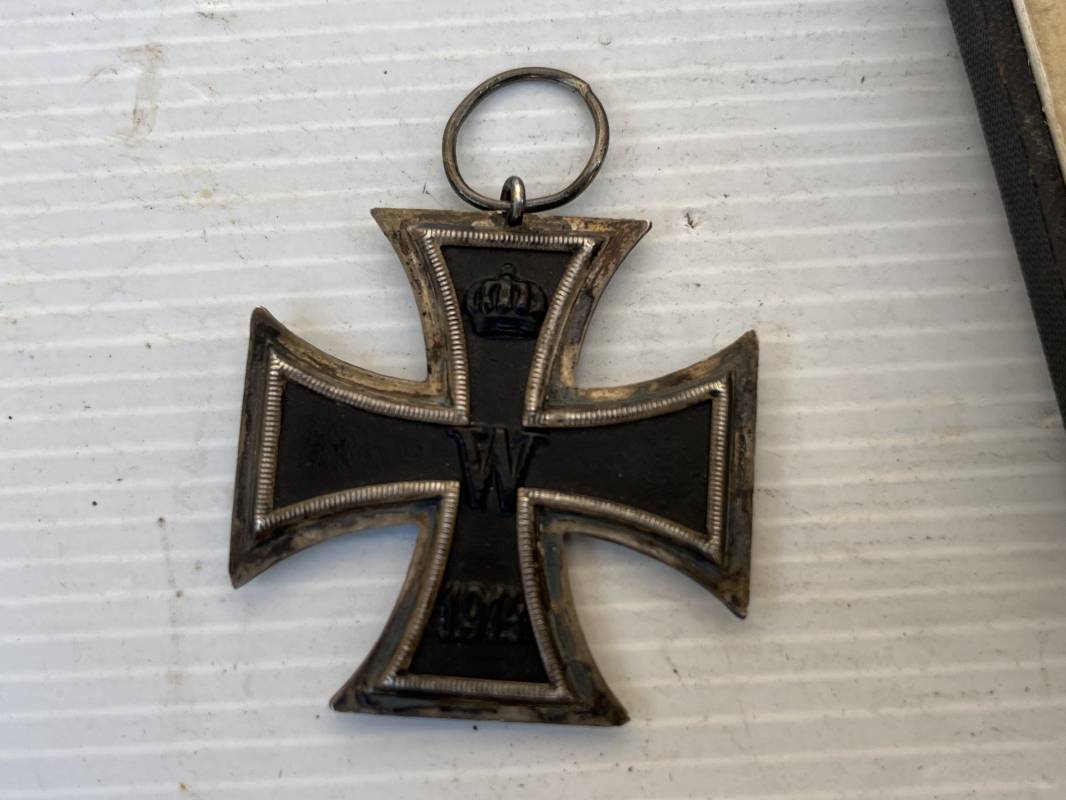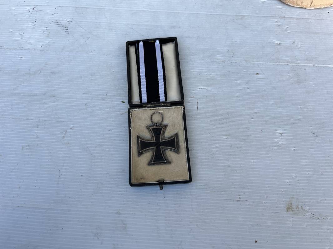 Belle croix de fer de 2éme classe 1914 et son boitier . Croix de fer avec peinture noire mate d origine , fabrication en plusieur parties . Anneau metallique . Ruban d origine . Boitier en carton recob=vert papier noir , bouton pussoir . Intérieur doublé en velours et soie de couleur créme . Bel ensemble trouvé en succession familiale en Allemagne Ref 21430