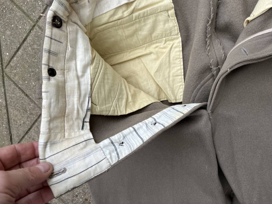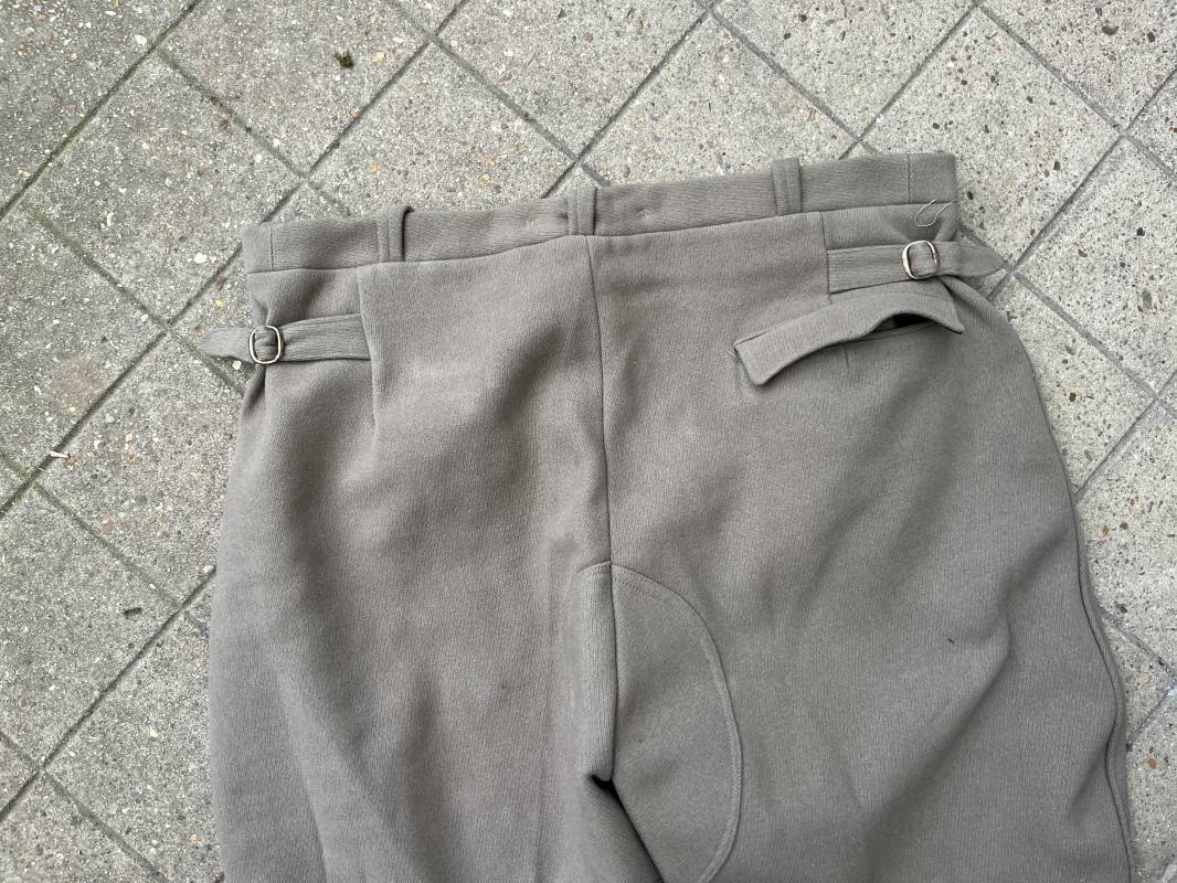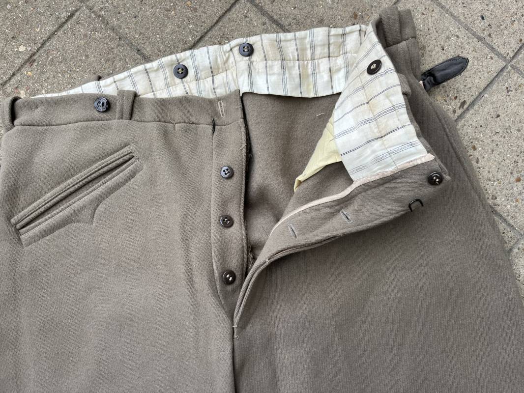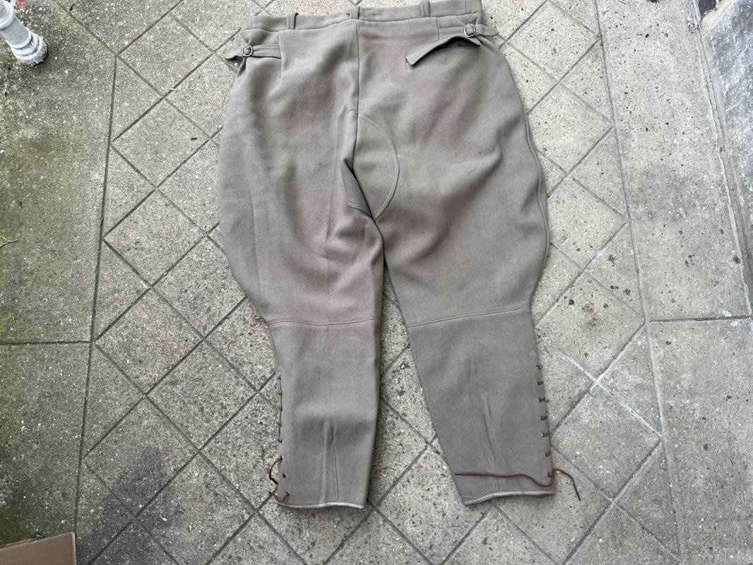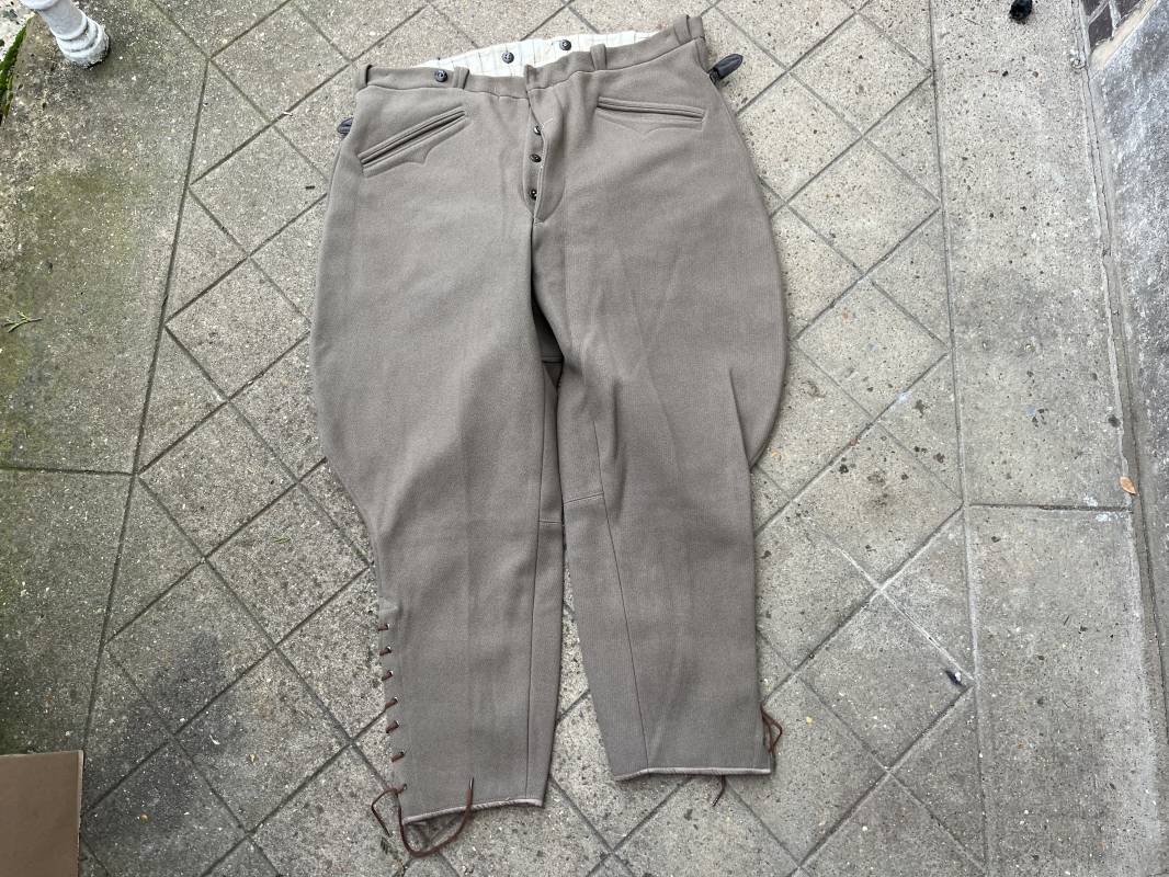 Très belle culotte modéle 1929 'mastic' d'un officier . Culotte en épaisse gabardine de couleur mastic . Trois poches dont une fessière . Passants tissu de ceinturon. Crochet métallique de braguette. Passants tissu de serrage de taille. Boutons plastique kaki .Bas de jambes avec lacets et oeillets metalliques lacets coton d'origines . Intérieur doublé en satinette rayée . Culotte légèrement portée en parfait état. Taille 48 . Longueur 96cm 1935/40. Ref 19333