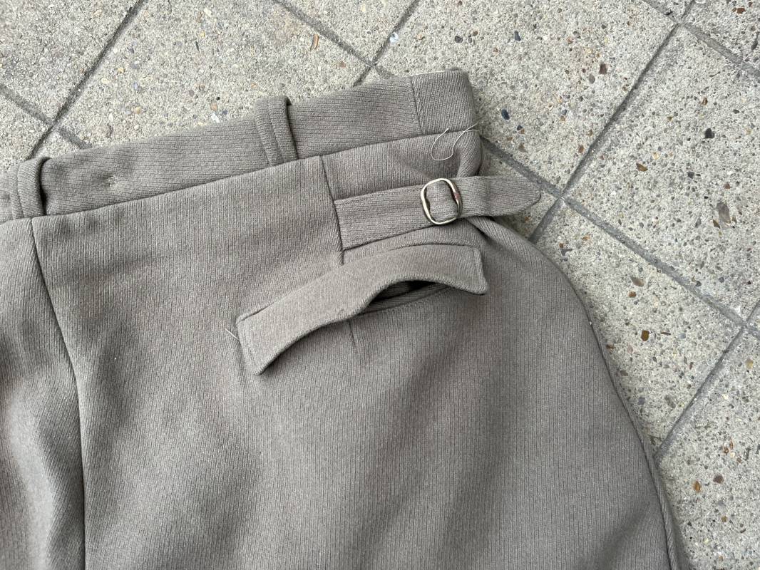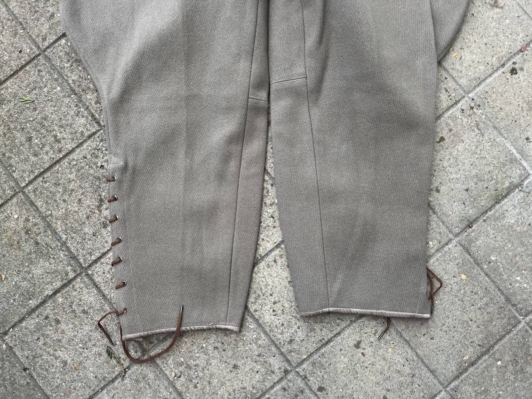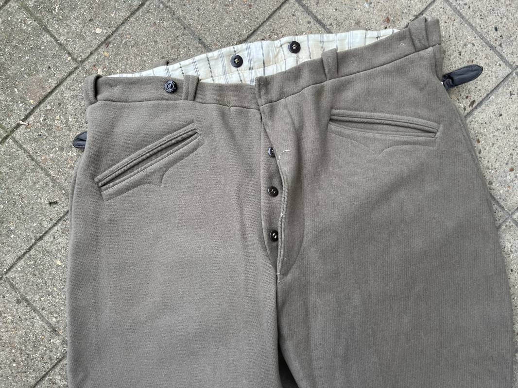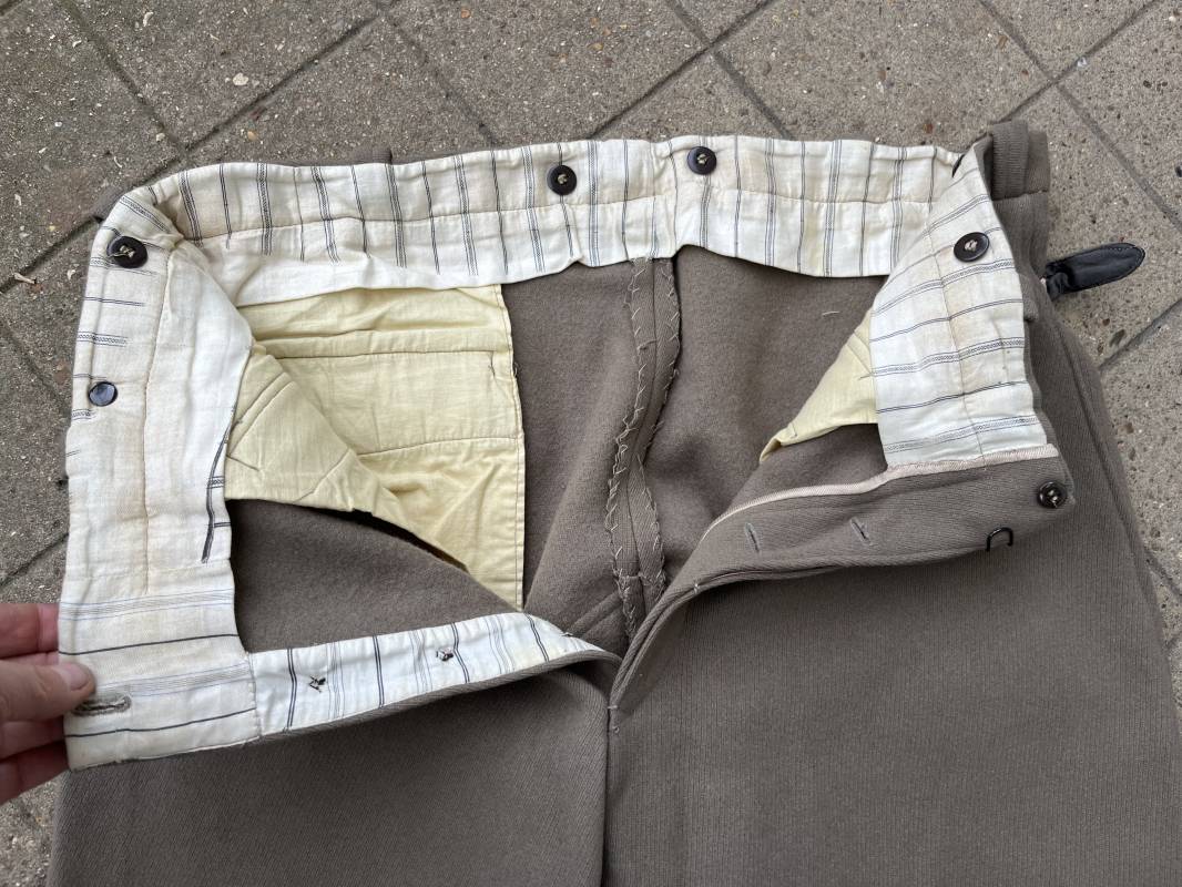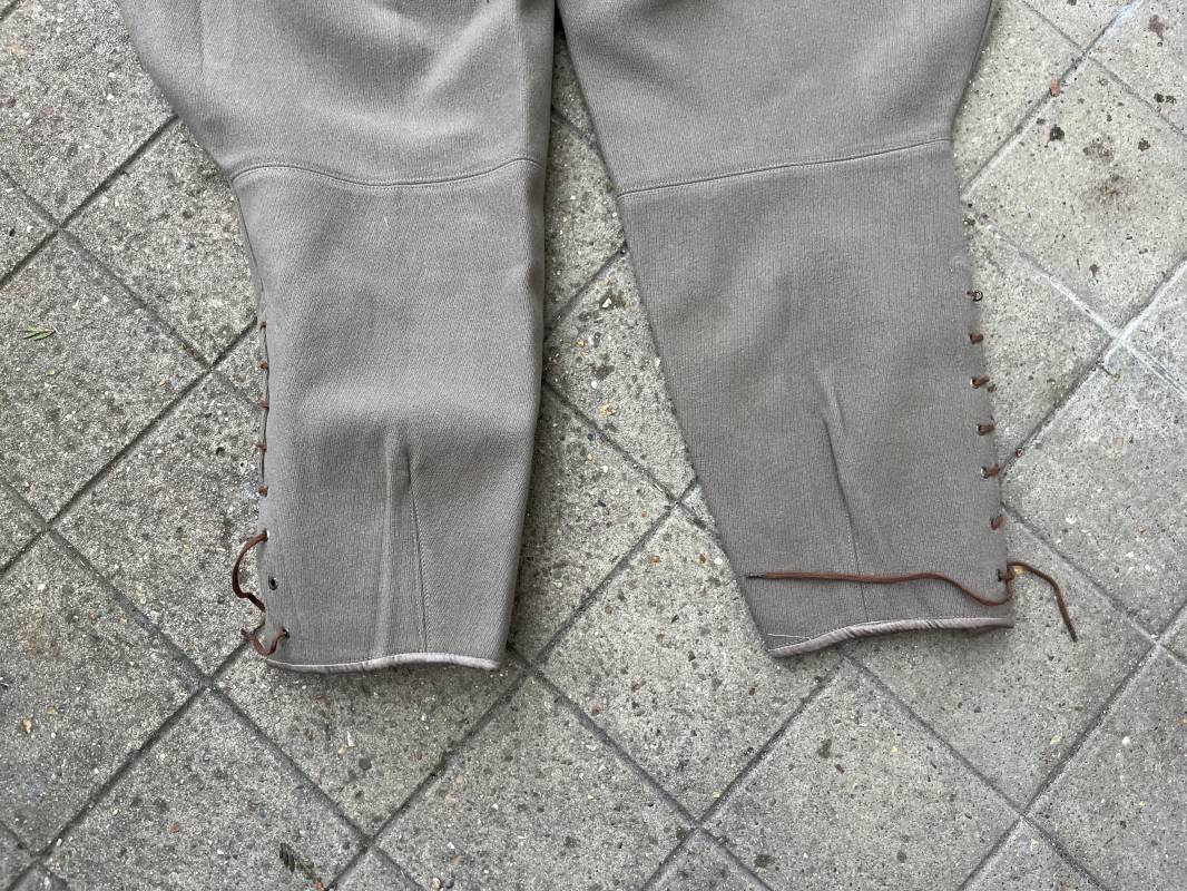 Très belle culotte modéle 1929 'mastic' d'un officier . Culotte en épaisse gabardine de couleur mastic . Trois poches dont une fessière . Passants tissu de ceinturon. Crochet métallique de braguette. Passants tissu de serrage de taille. Boutons plastique kaki .Bas de jambes avec lacets et oeillets metalliques lacets coton d'origines . Intérieur doublé en satinette rayée . Culotte légèrement portée en parfait état. Taille 48 . Longueur 96cm 1935/40. Ref 19333