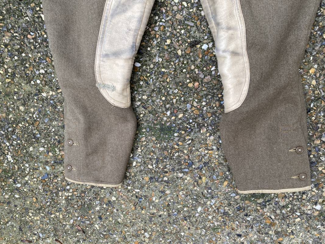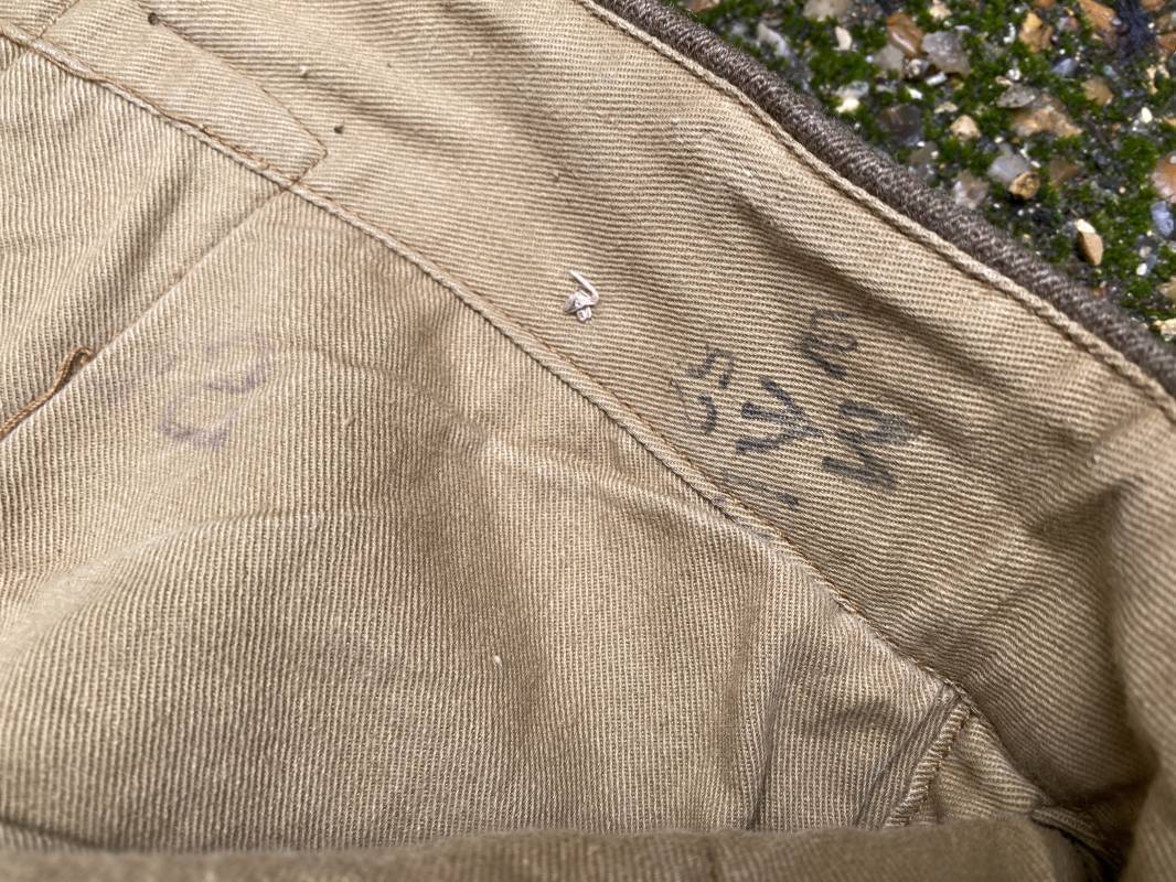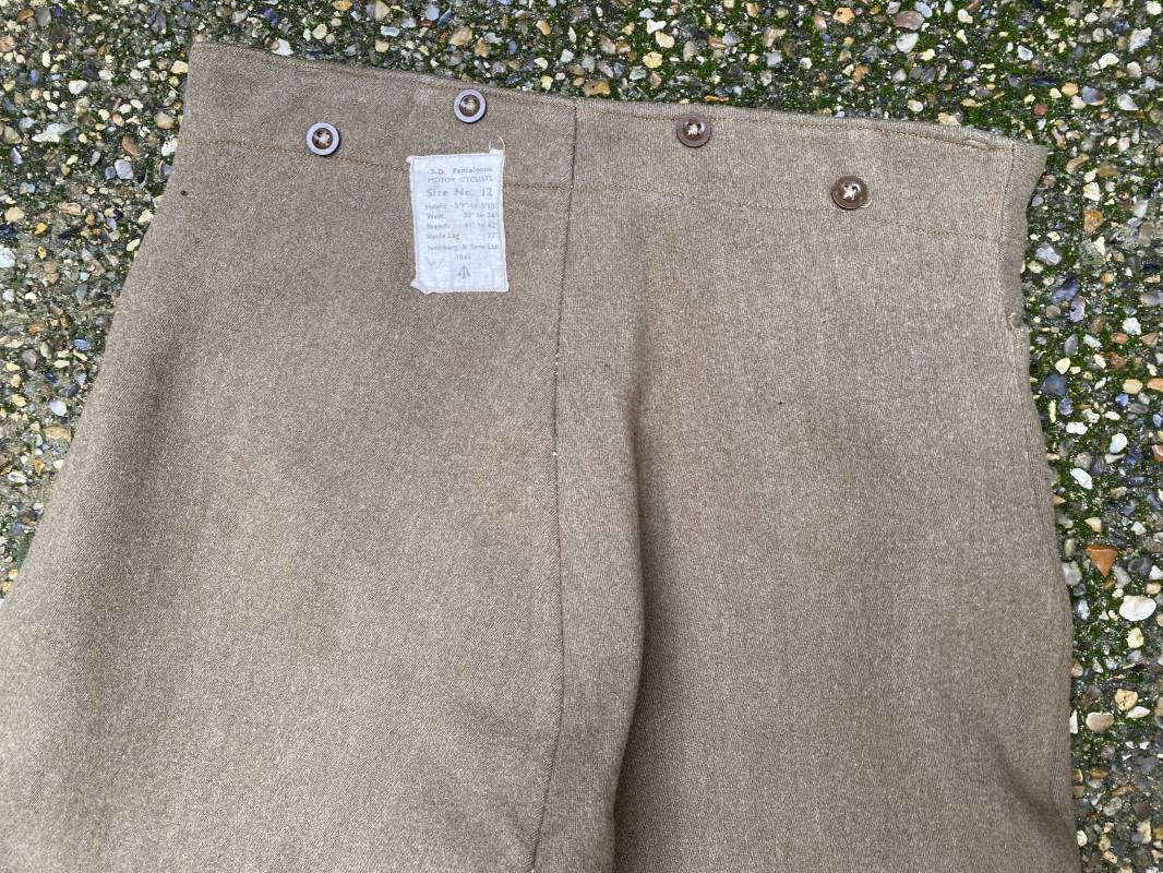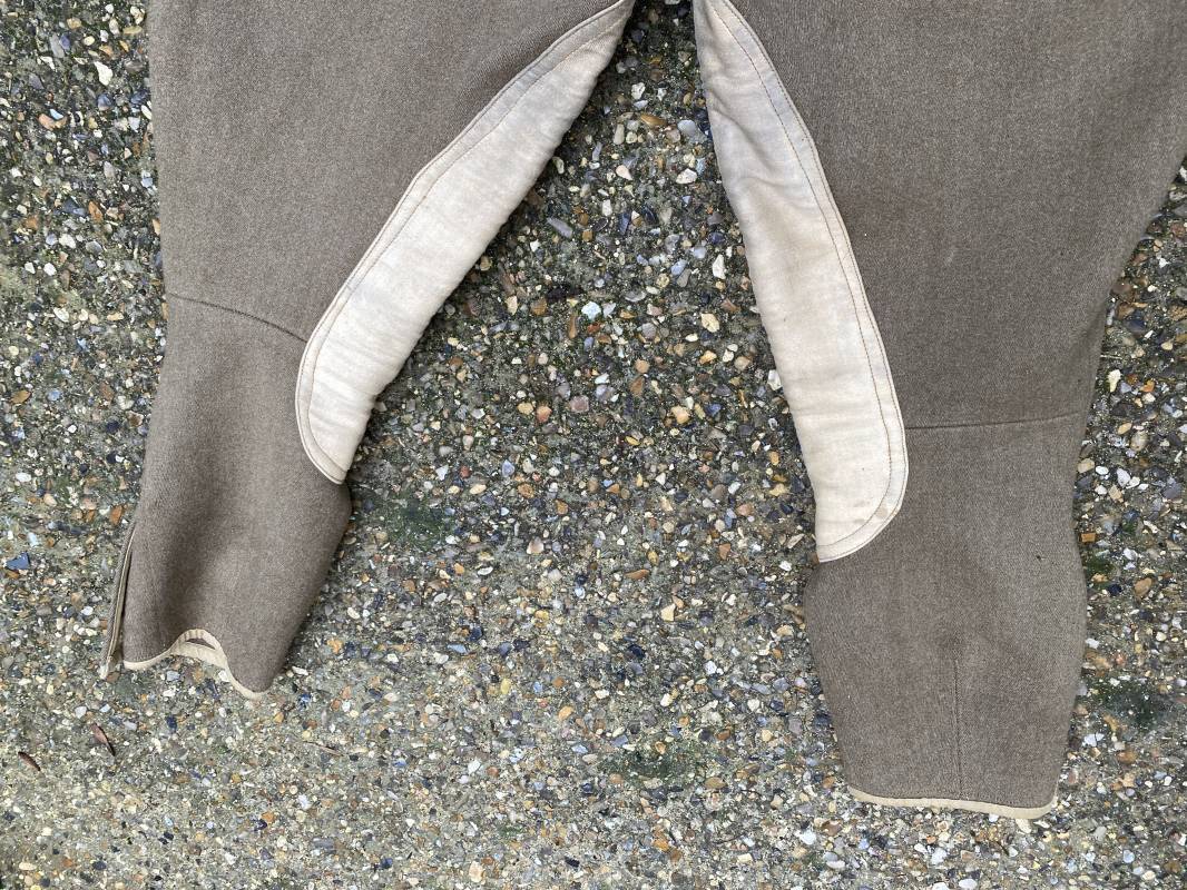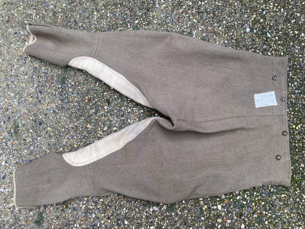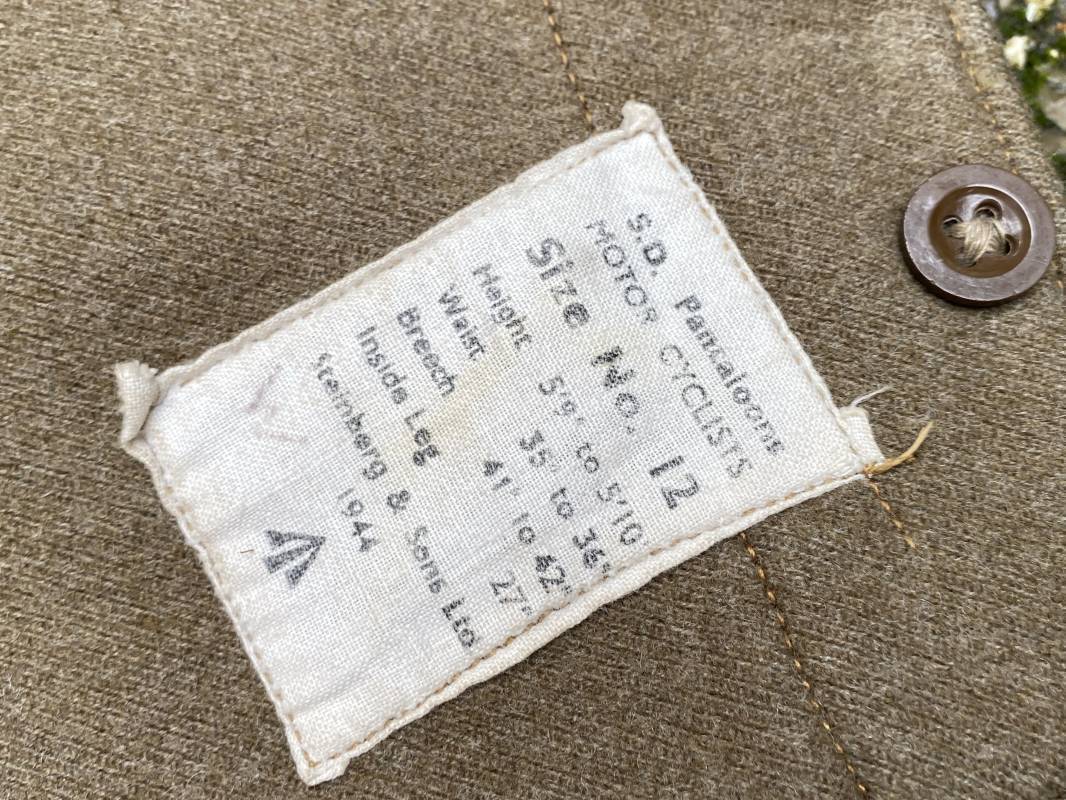 Trés belle Culotte d un motocycliste des troupes motorisées Britannique en gabardine kaki. Culotte de dotation "Pantaloons Motor Cyclists". Boutons en plastique marron cousus d'origine. Deux poches latérales en biais. Poche à pansement. Bas des jambes boutonnés. Renforts en toile beige à l'entre deux jambes. Intérieur doublé en coton beige. Tampon encre noir WD code M (année 1944) taille 44. Longueur 100cm. Etiquette fabricant taille 12 daté 1944. Culotte légèrement portée en parfait état. Ref 17000