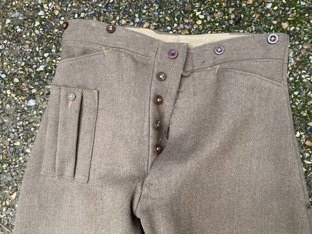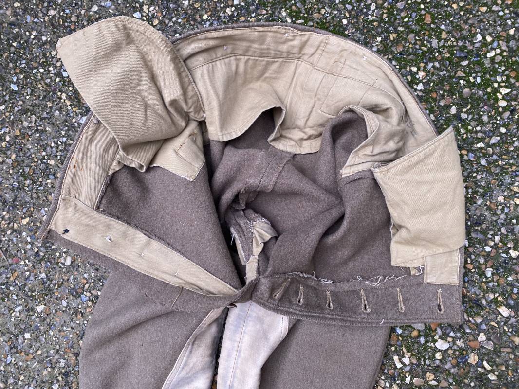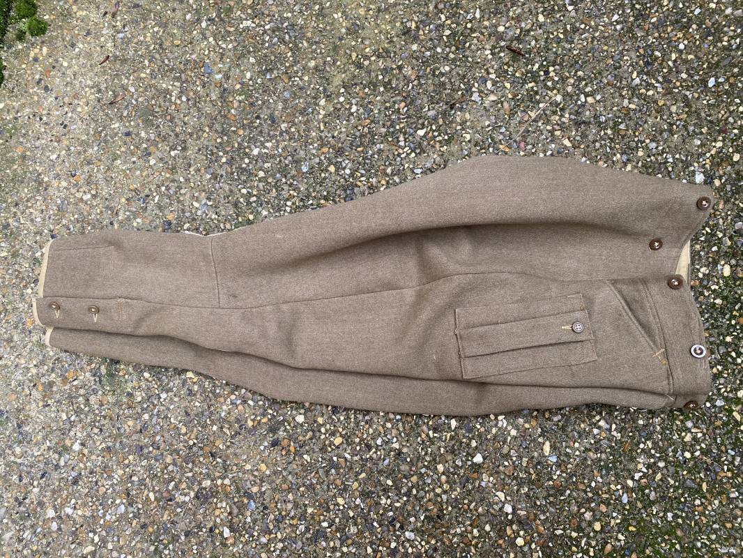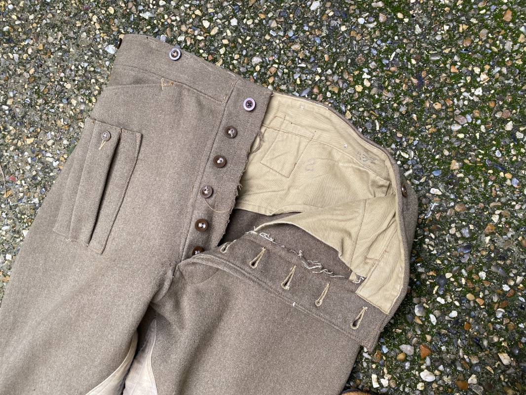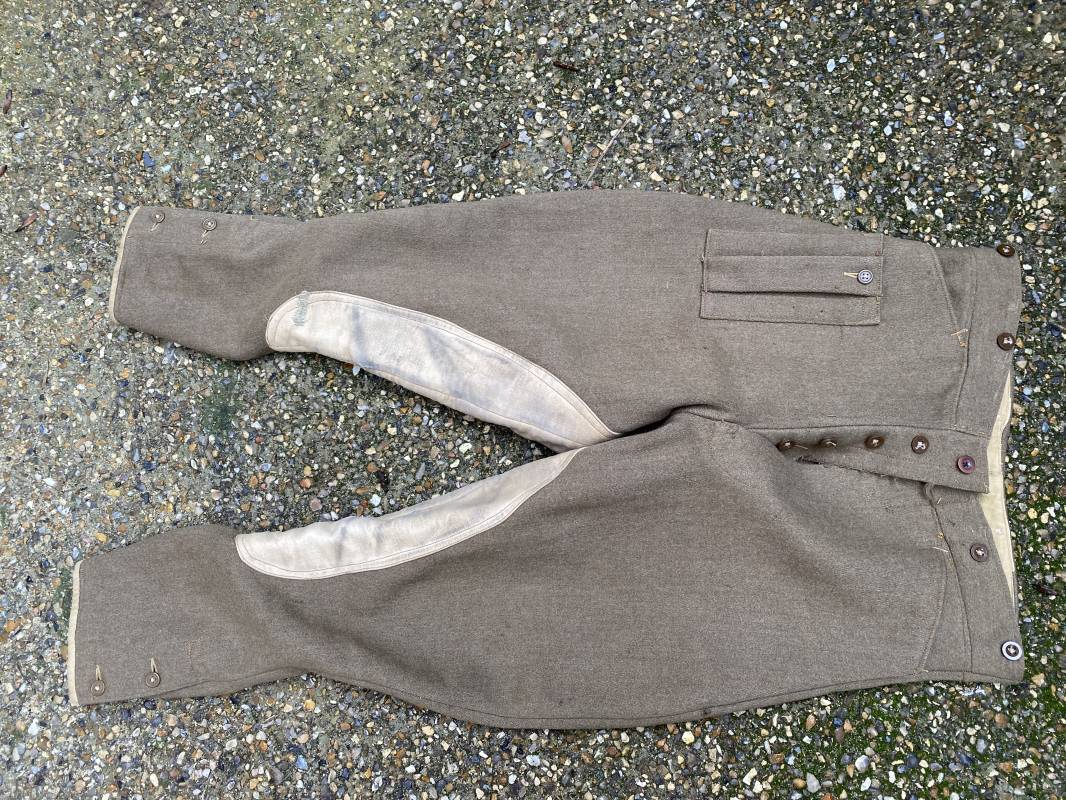 Trés belle Culotte d un motocycliste des troupes motorisées Britannique en gabardine kaki. Culotte de dotation "Pantaloons Motor Cyclists". Boutons en plastique marron cousus d'origine. Deux poches latérales en biais. Poche à pansement. Bas des jambes boutonnés. Renforts en toile beige à l'entre deux jambes. Intérieur doublé en coton beige. Tampon encre noir WD code M (année 1944) taille 44. Longueur 100cm. Etiquette fabricant taille 12 daté 1944. Culotte légèrement portée en parfait état. Ref 17000