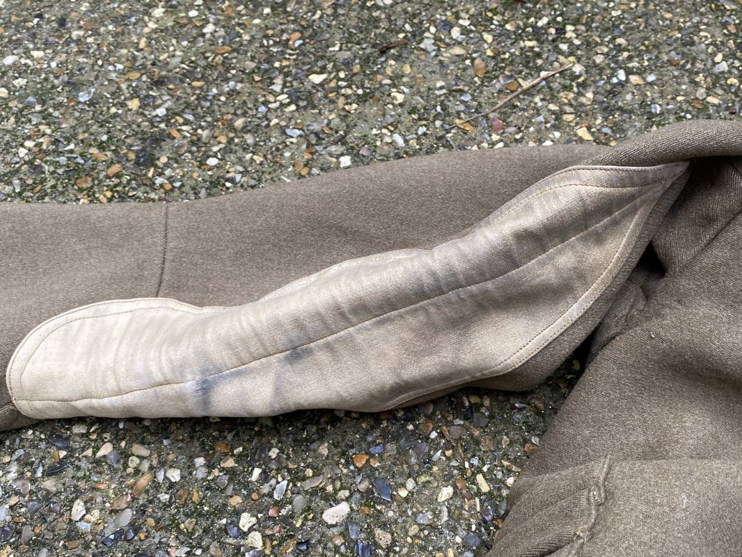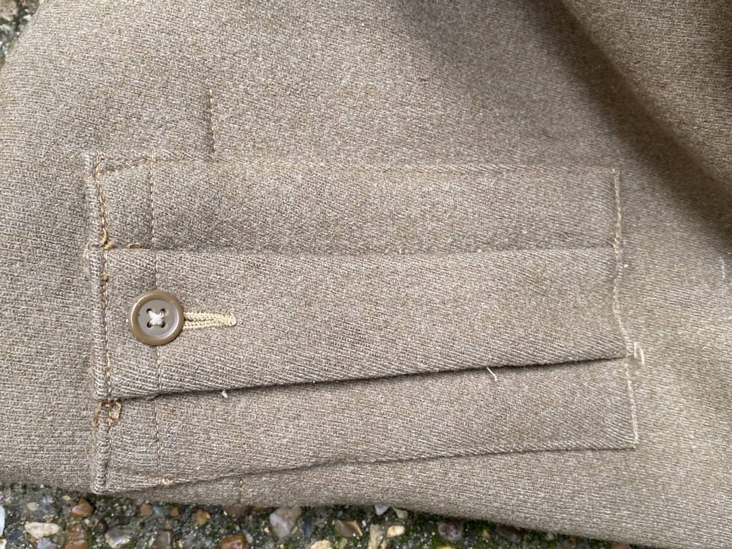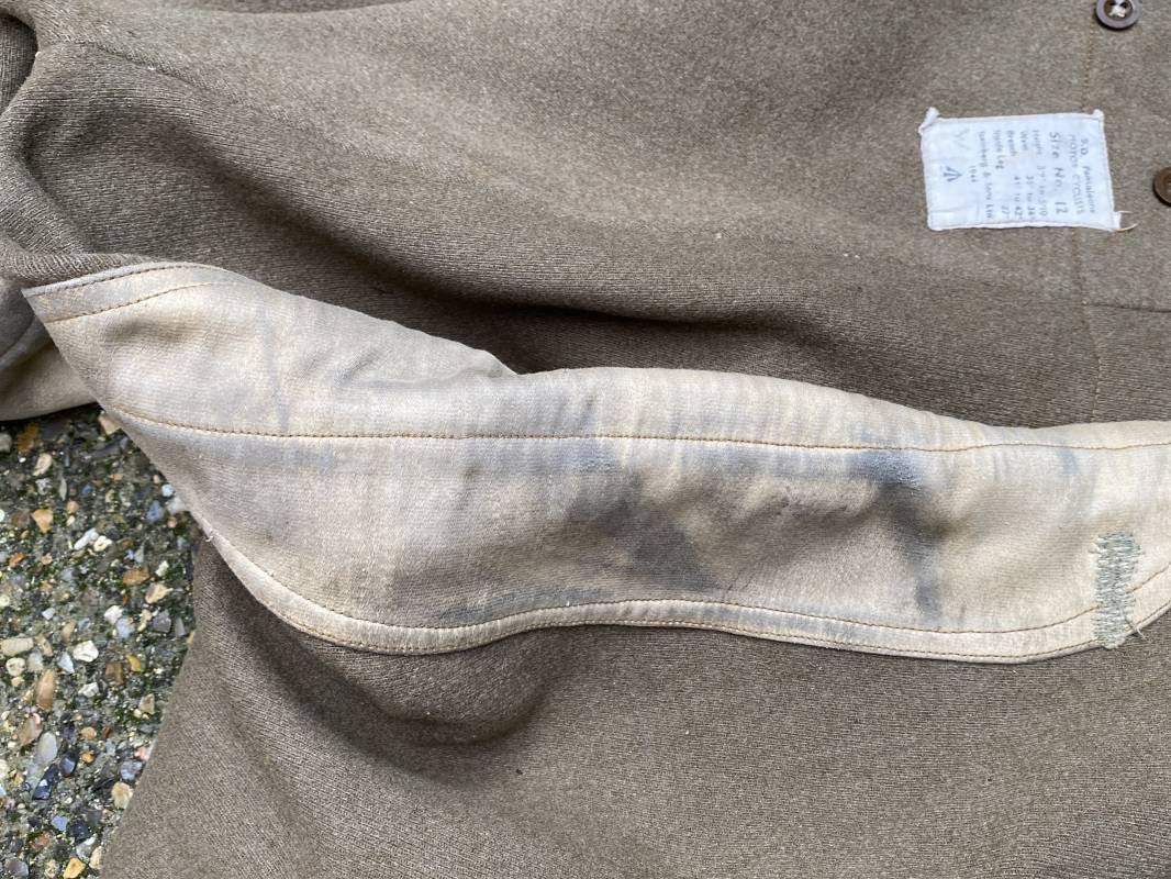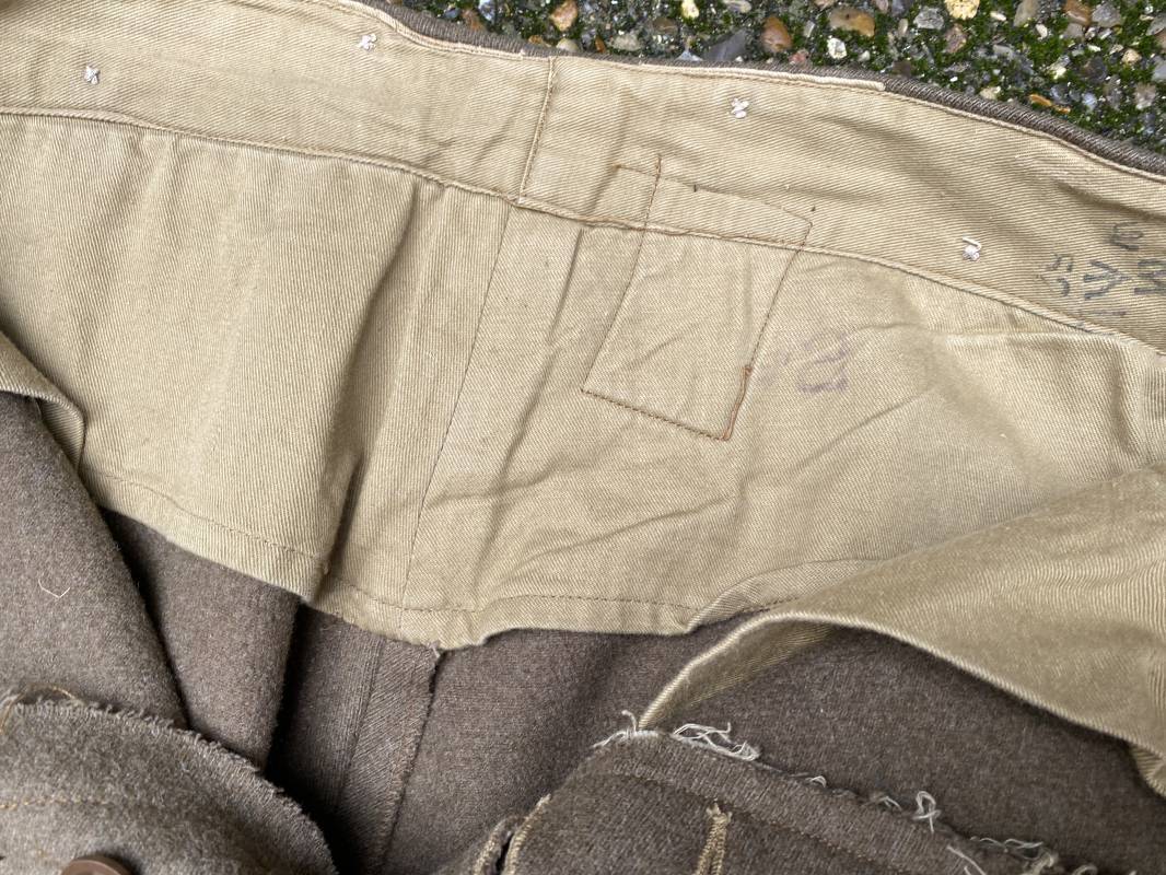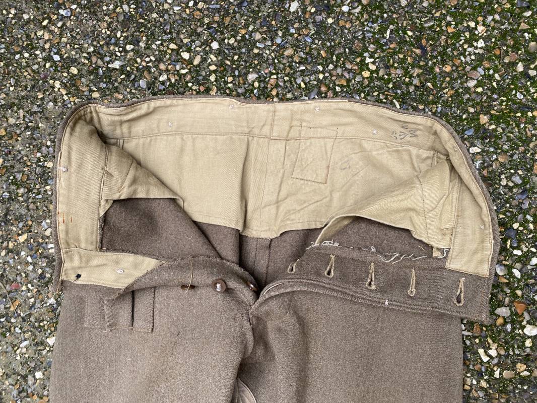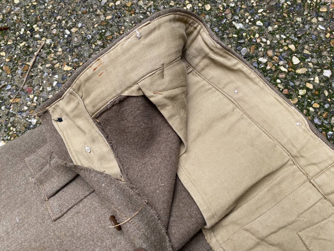 Trés belle Culotte d un motocycliste des troupes motorisées Britannique en gabardine kaki. Culotte de dotation "Pantaloons Motor Cyclists". Boutons en plastique marron cousus d'origine. Deux poches latérales en biais. Poche à pansement. Bas des jambes boutonnés. Renforts en toile beige à l'entre deux jambes. Intérieur doublé en coton beige. Tampon encre noir WD code M (année 1944) taille 44. Longueur 100cm. Etiquette fabricant taille 12 daté 1944. Culotte légèrement portée en parfait état. Ref 17000