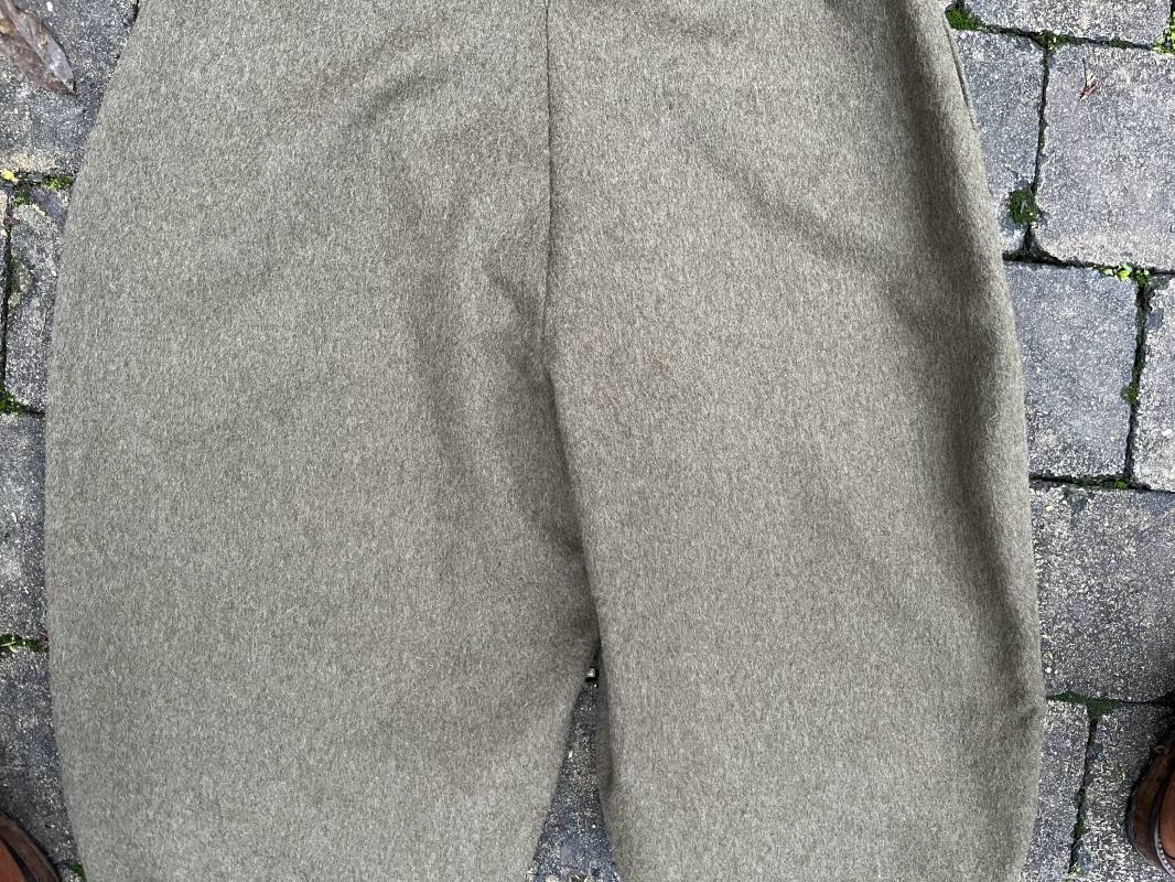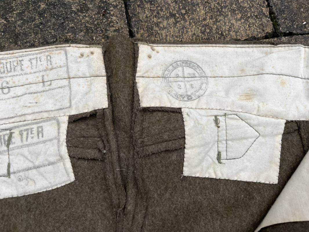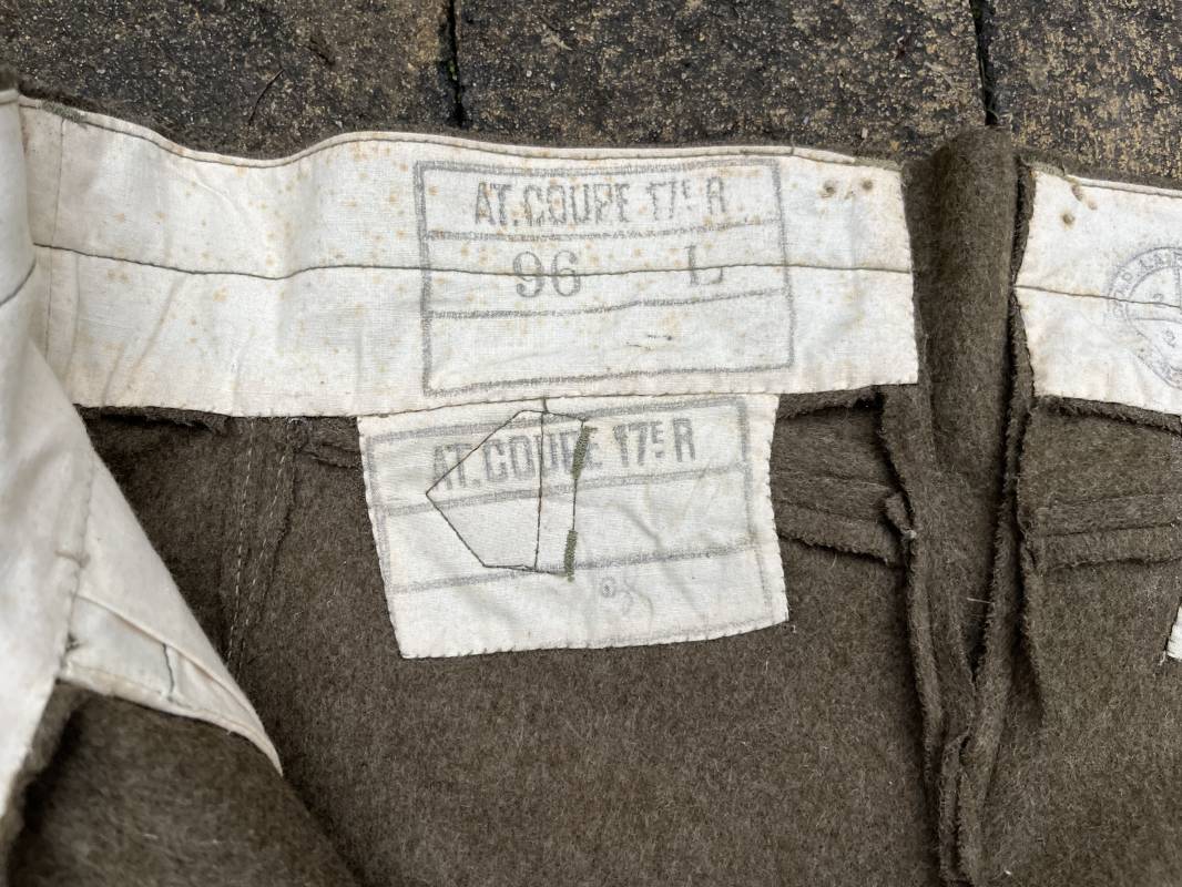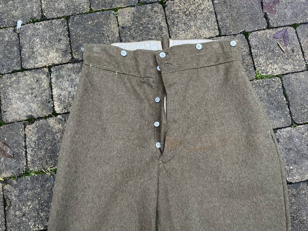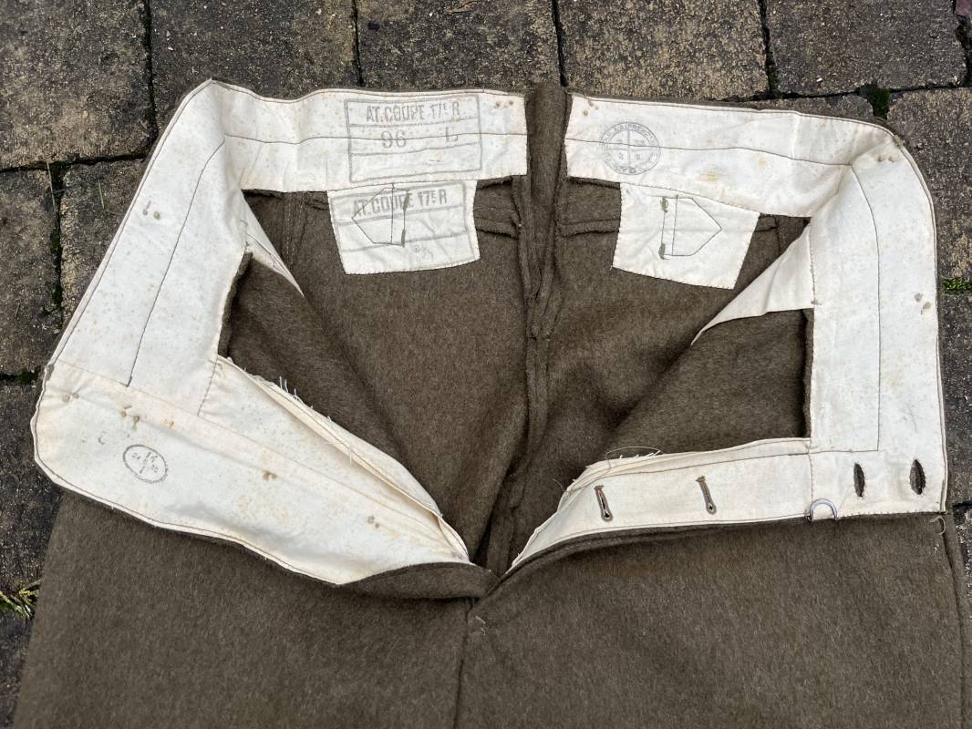 Rare pantalon culotte modéle 1915/27 des troupes à pied d Afrique . Culotte de dotation en drap kaki . Deux poches latérales et poche a gousset . De forme droite sur les cotés et les coutures d entre jambe et arrondie au niveau des manchettes . Manchettes en toile de coton blanc avec fermeture a 3 boutons . Deux boutons de ceinture et trois de bragettes , crochet metallique d ebraguette . Boutons alu equipements militaires cousus d 'origine . Martingale dans le dos . Boutons de bretelles . Aucun passant de ceinturon ( particulier a la culotte d afrique ) Intérieur doublé en coton blanc . Tampon rond fabricant a lyon . Taile 96 L Tampon oval de réception daté 24 06 1935 . Taille 46 Longueur 110 cm . Drap trés frais cette culotte est en superbe état . Uniforme définitif en colection . Rare culotte de tirailleur en 1935/40 Peu courant Ref 21230