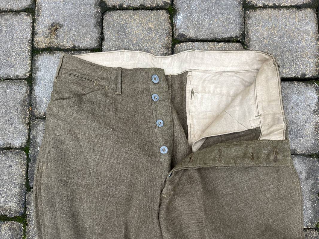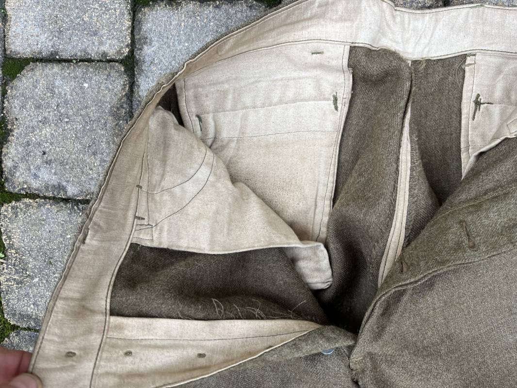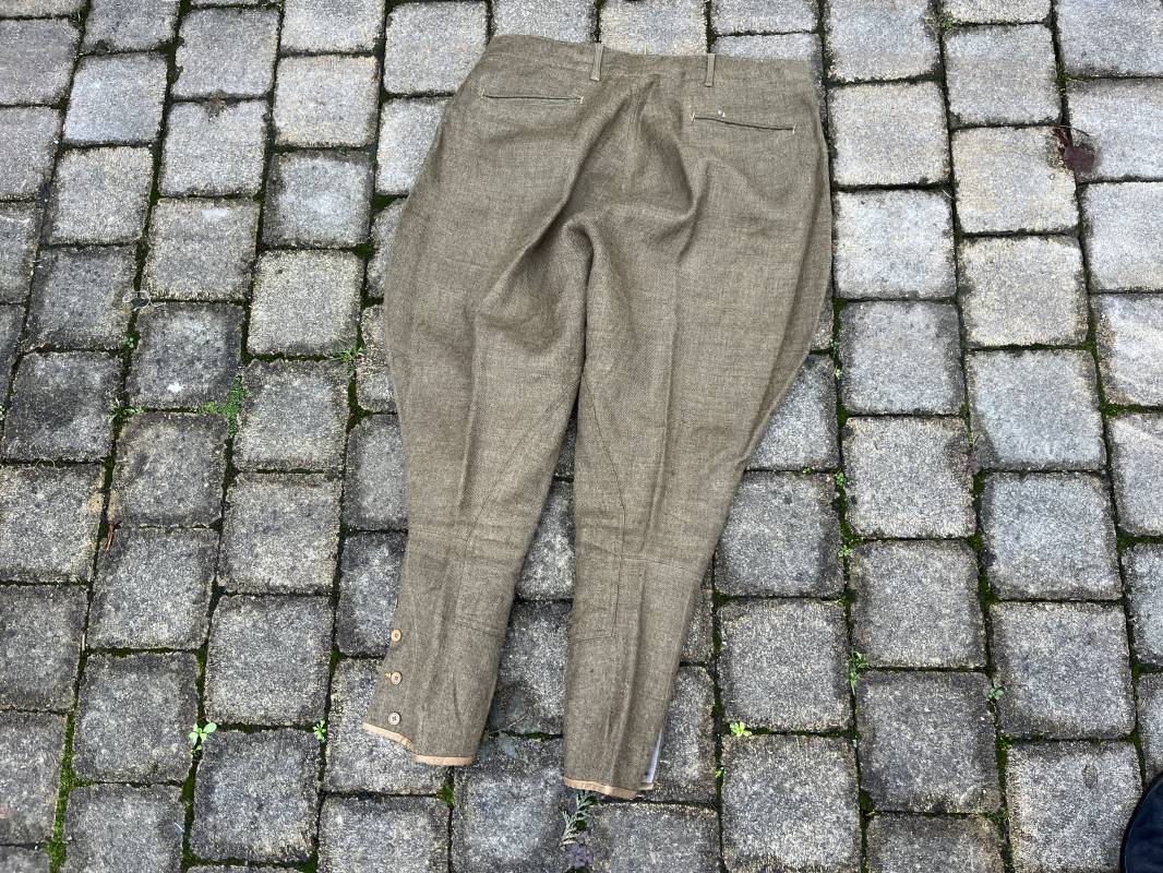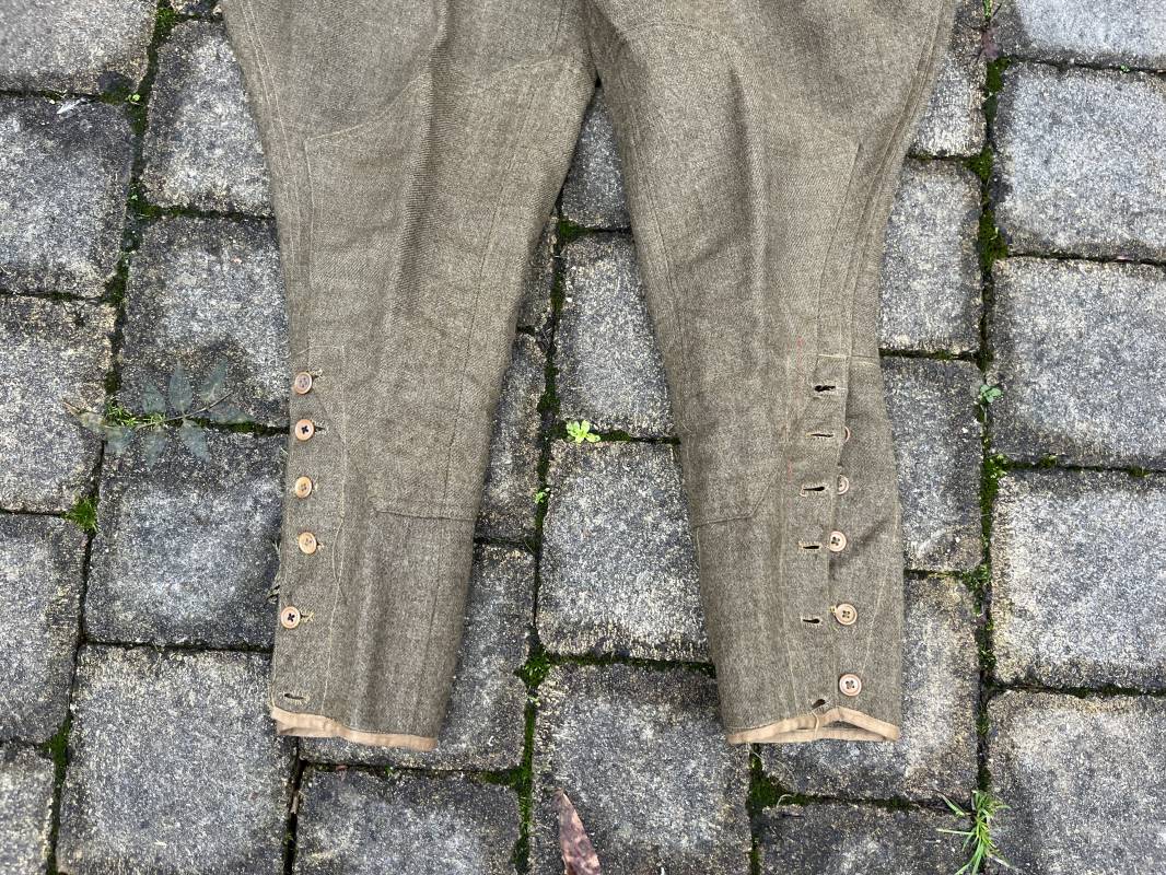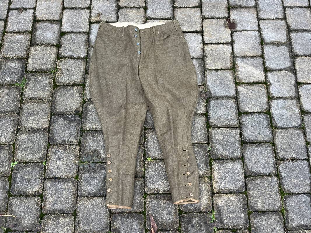 Trés belle culotte troupe américaine modéle 1912 en drap kaki . Culotte réglementaire . Passants tissu de ceinturon , poche a gousset . Deux poches en bias . Deux poches fessières . Boutons métalliques marqués USA cousus d'origine . Bas de jambes a boutons . Intérieur doublé coton blanc . Etiquette cousue sur poche intérieure avec marquage fabricant Henry Sonneborn 15 May 1918 . Drap trés frais . Culotte trés legerement portée en superbe état . Aucun défaut . Taille 42 Longueur 94 cm . 1917/18 Ref 21730