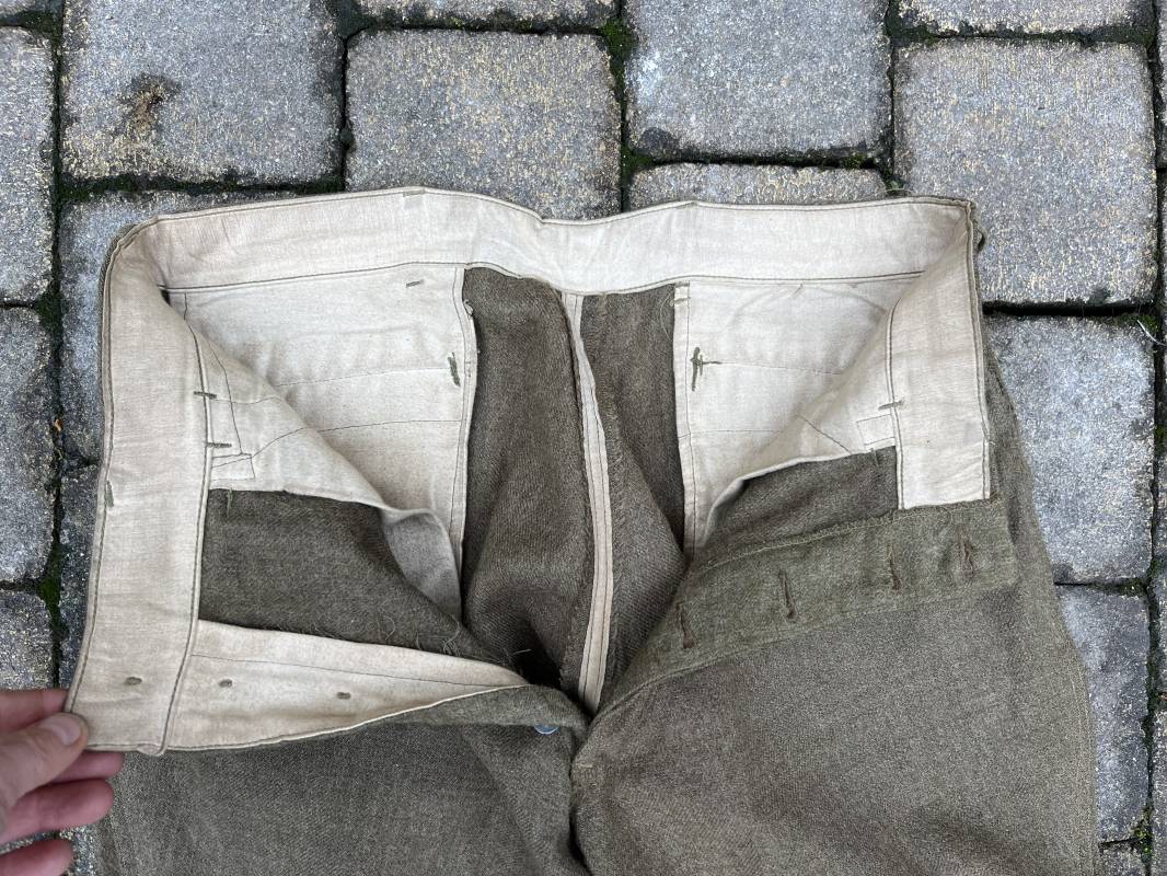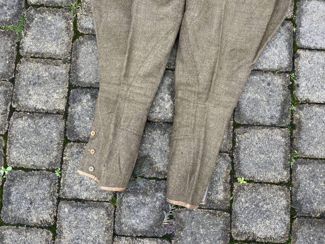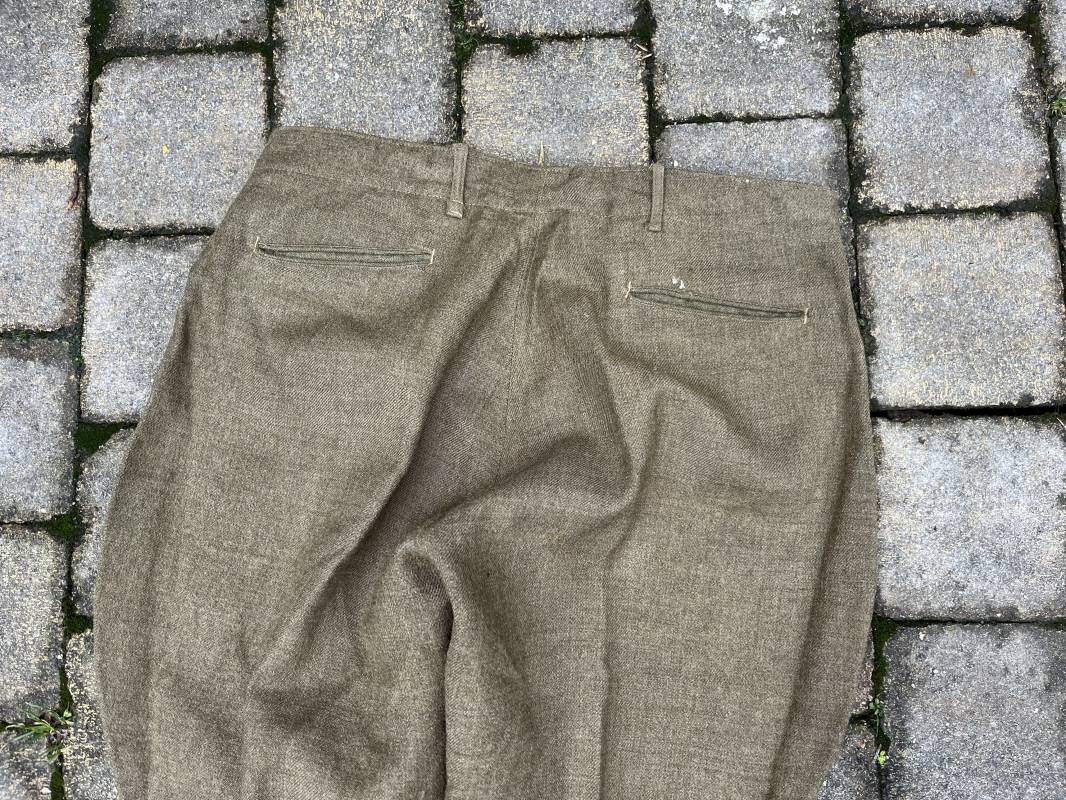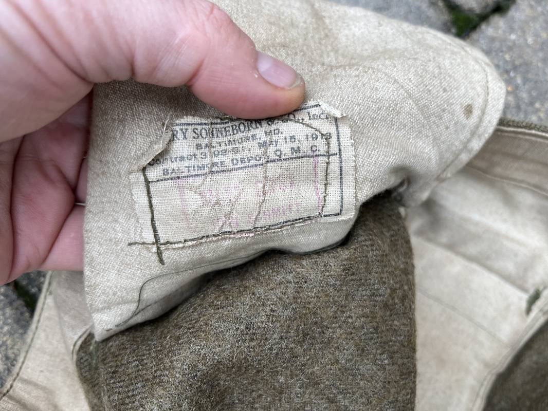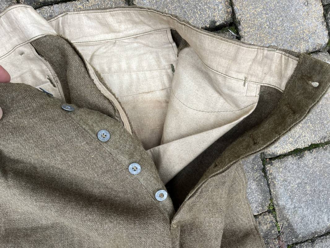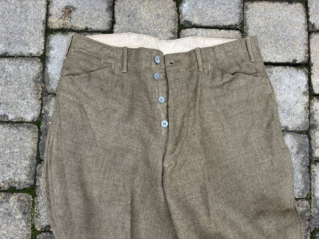 Trés belle culotte troupe américaine modéle 1912 en drap kaki . Culotte réglementaire . Passants tissu de ceinturon , poche a gousset . Deux poches en bias . Deux poches fessières . Boutons métalliques marqués USA cousus d'origine . Bas de jambes a boutons . Intérieur doublé coton blanc . Etiquette cousue sur poche intérieure avec marquage fabricant Henry Sonneborn 15 May 1918 . Drap trés frais . Culotte trés legerement portée en superbe état . Aucun défaut . Taille 42 Longueur 94 cm . 1917/18 Ref 21730