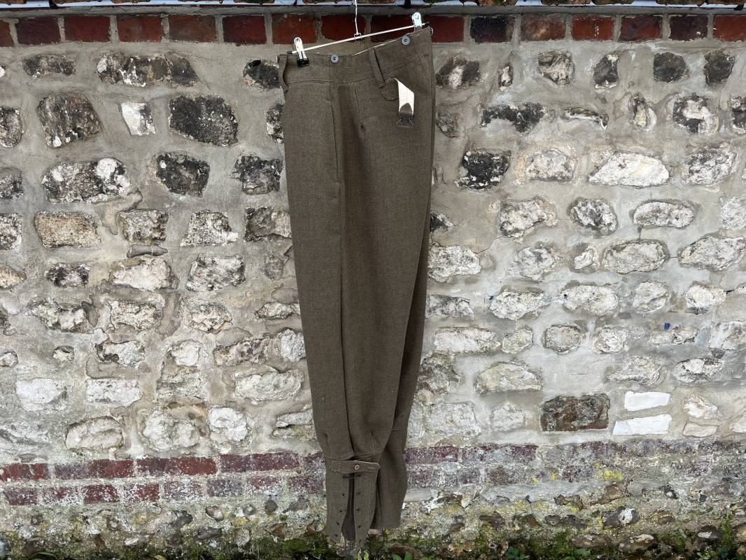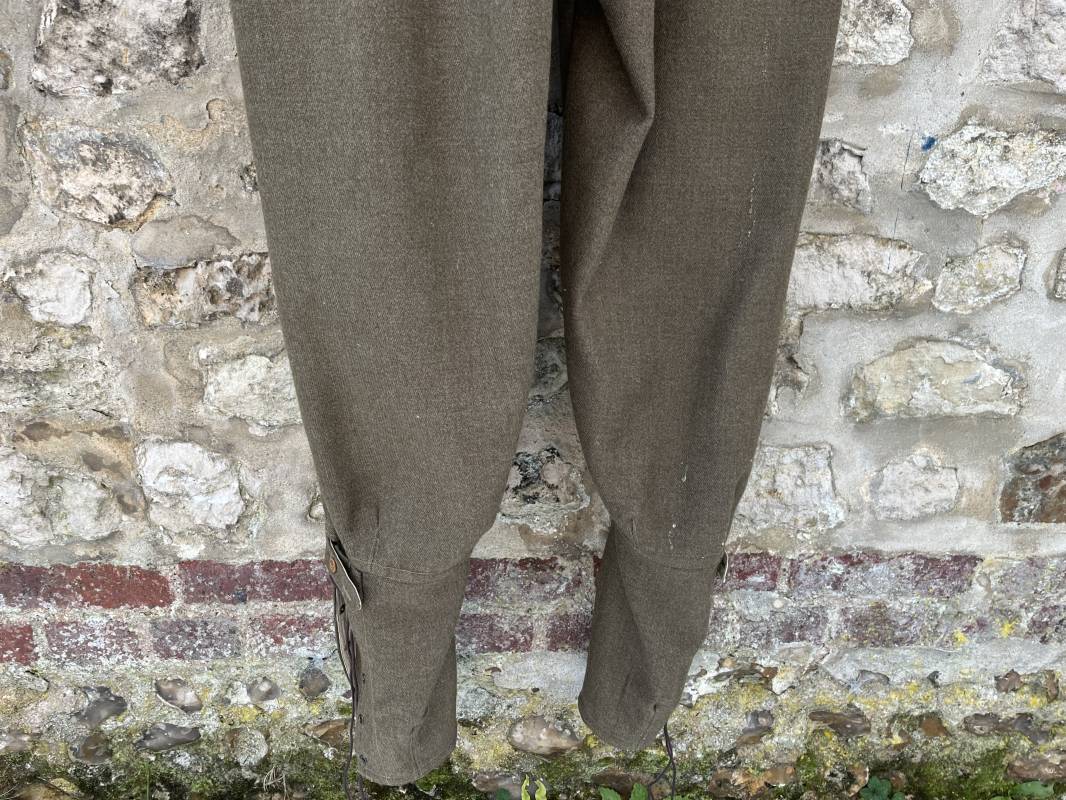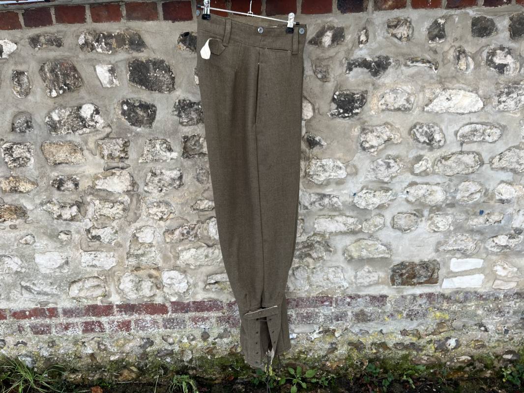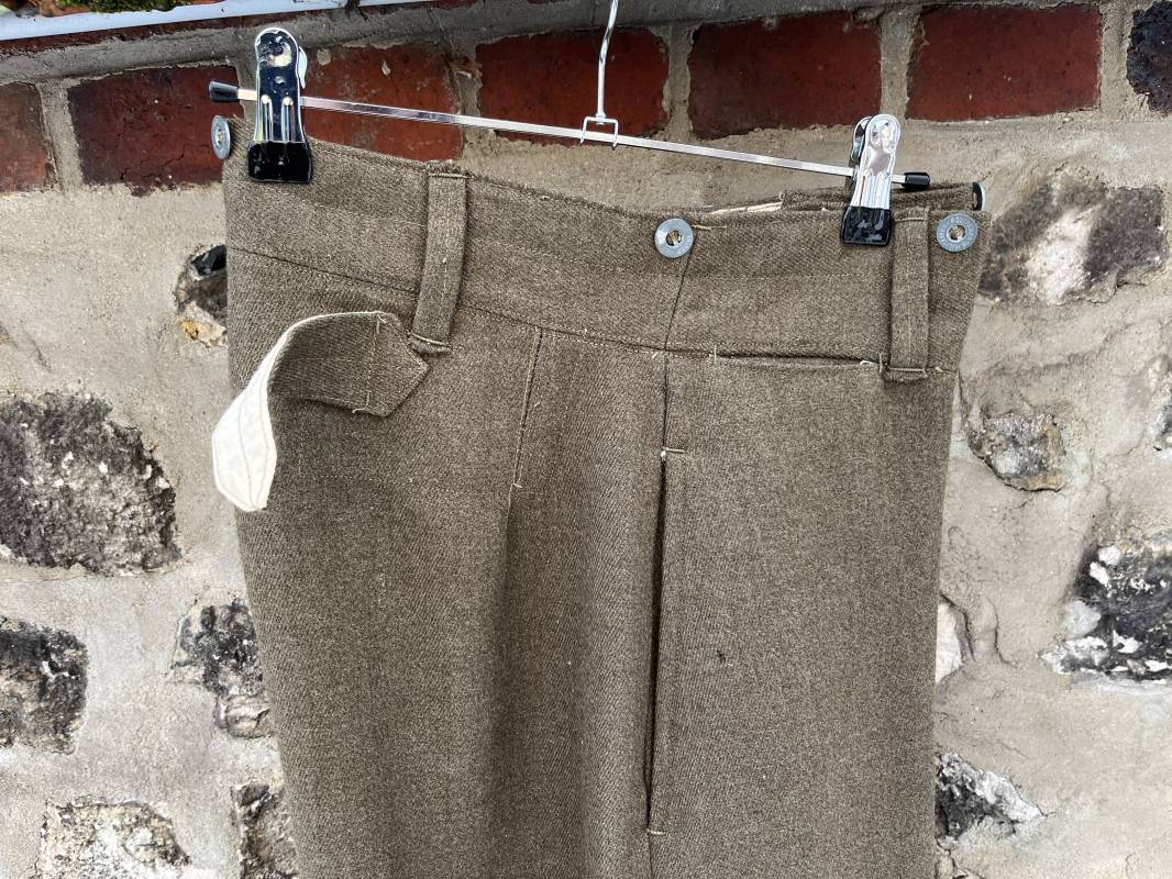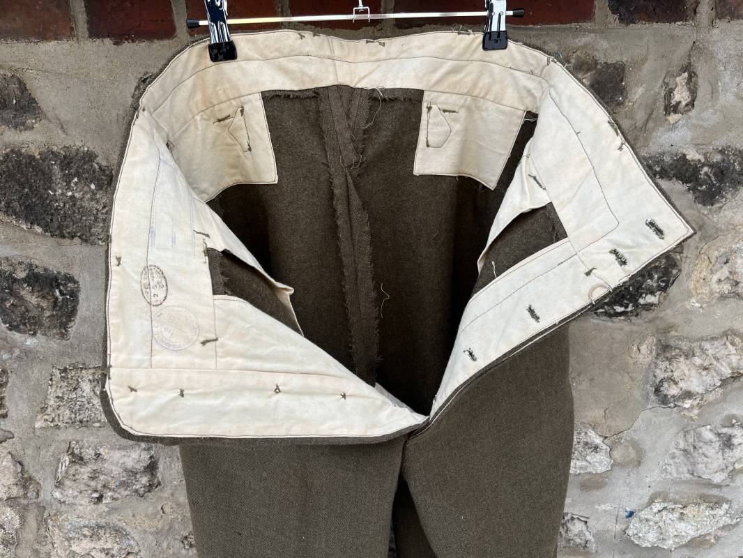 Trés belle culotte troupe modèle 1938 en gabardine kaki. Culotte réglementaire dite "golf". Passants de ceinturon en tissu. Boutons 'équipements militaires'. Crochet métallique de braguette. Deux poches latérales, poche à gousset. Martingale avec boutons alu. Bas des jambes à lacets. Lacets d'origines en coton kaki . Des deux pattes de serrage en drap et boutons sous genoux . Intèrieur doublé en coton blanc. Tampon rond fabricant . Daté 1940 Taille 88 M . Taille 42. Longueur 117 cm .Culotte trés lègèrement portée en trés bel état . Culotte définitive en collection 1939/40. Ref 21107