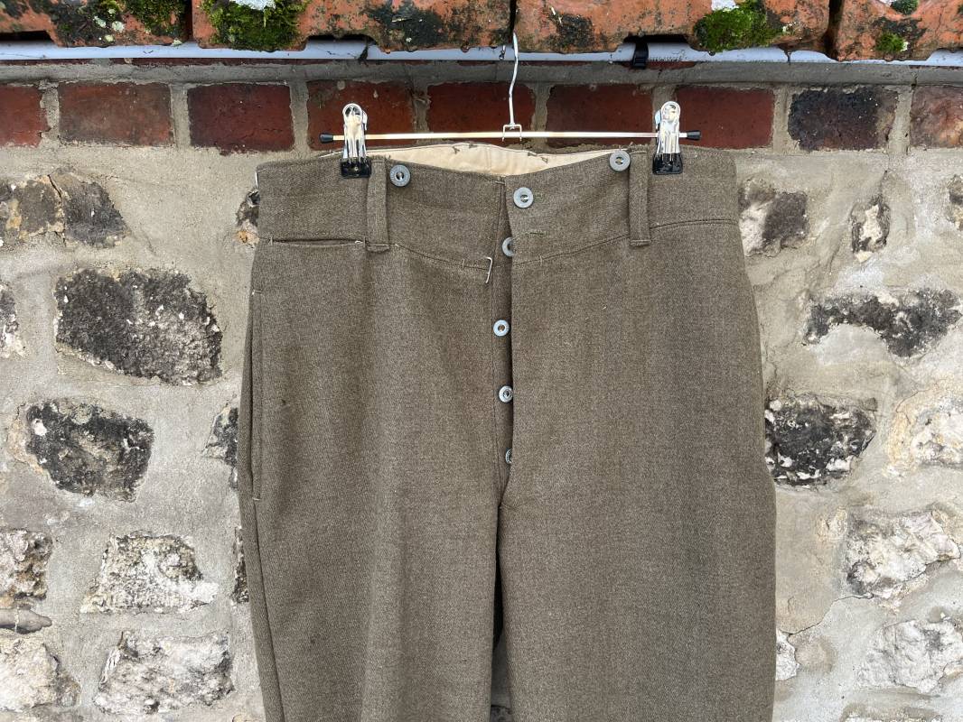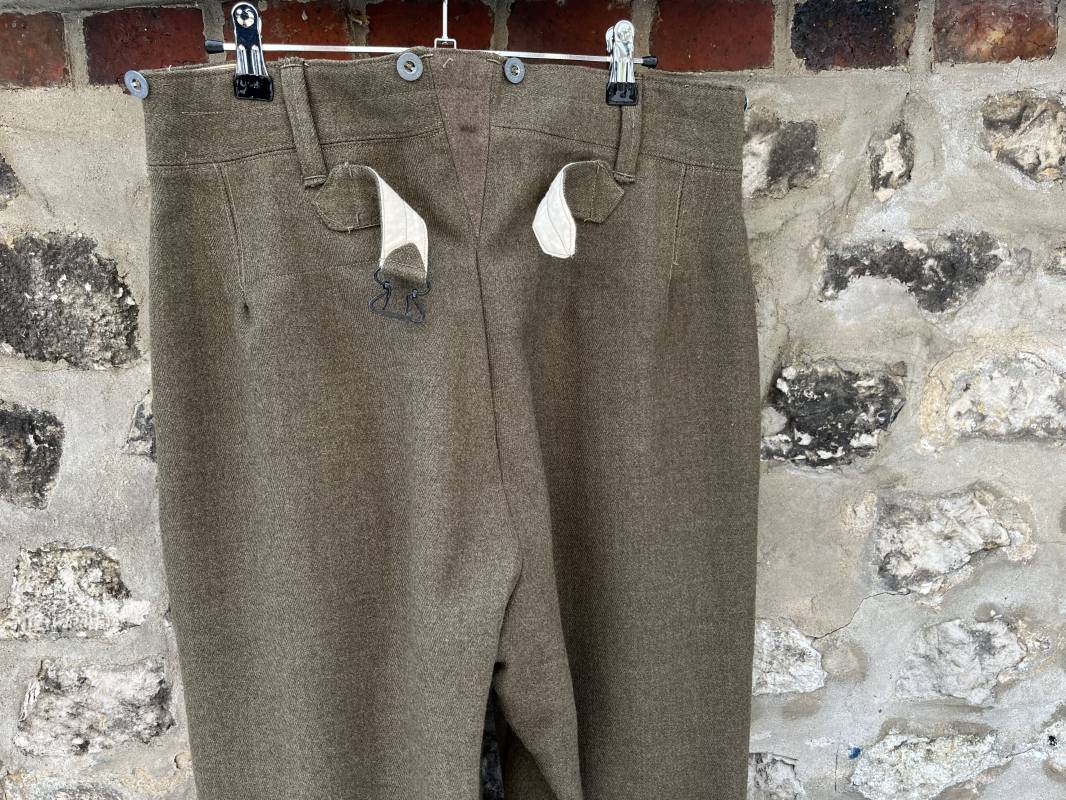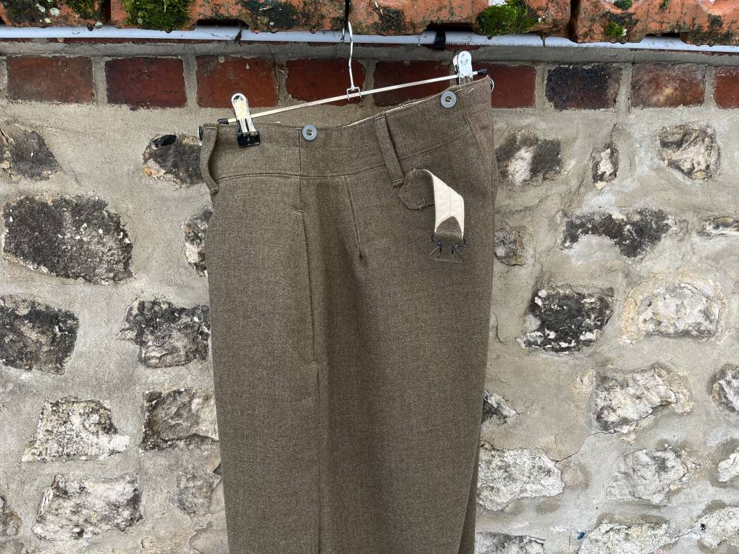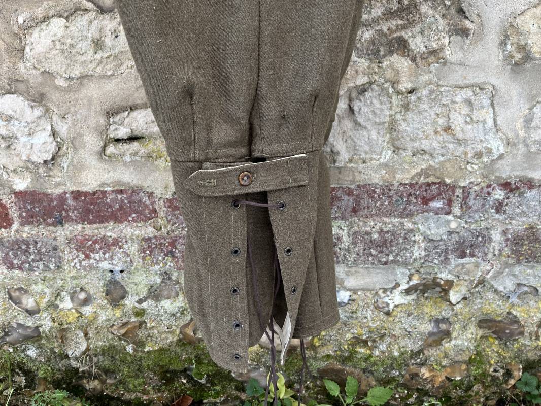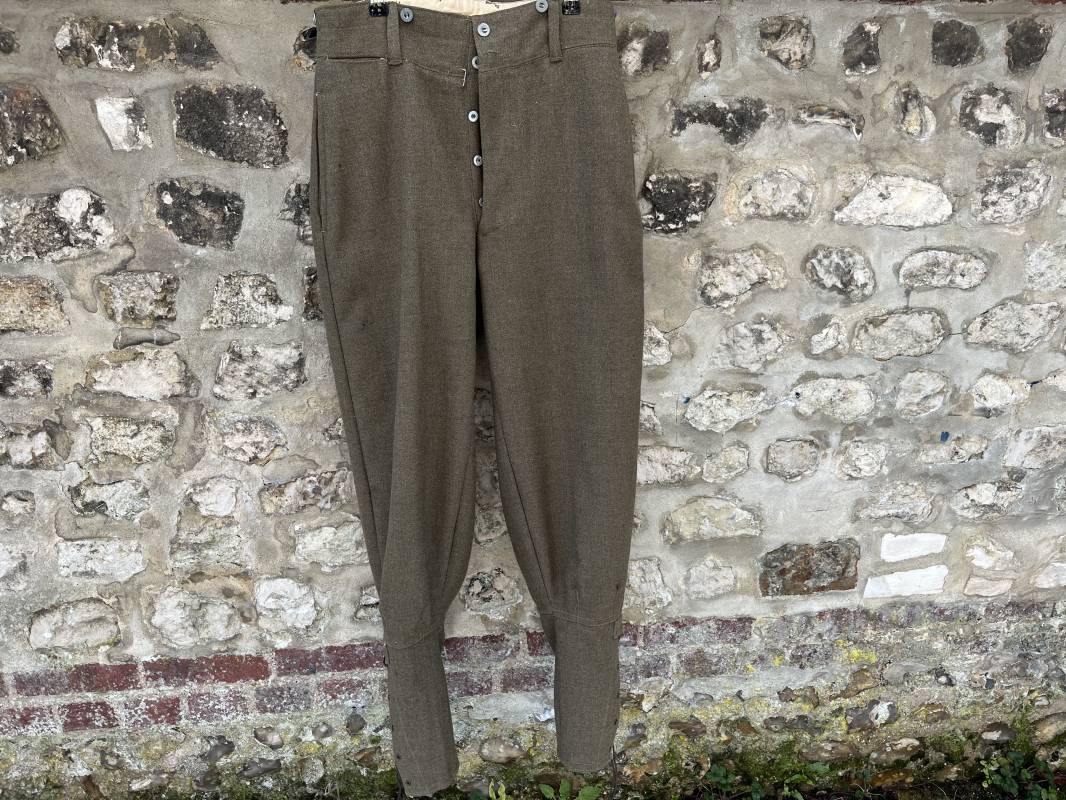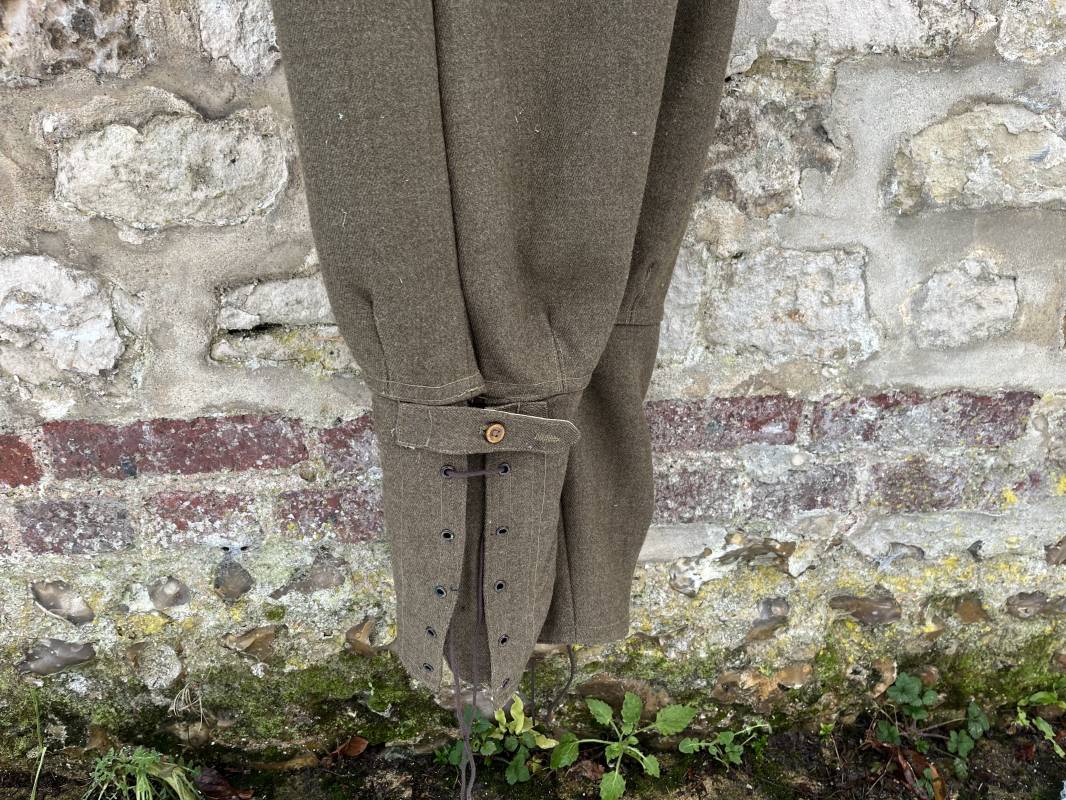 Trés belle culotte troupe modèle 1938 en gabardine kaki. Culotte réglementaire dite "golf". Passants de ceinturon en tissu. Boutons 'équipements militaires'. Crochet métallique de braguette. Deux poches latérales, poche à gousset. Martingale avec boutons alu. Bas des jambes à lacets. Lacets d'origines en coton kaki . Des deux pattes de serrage en drap et boutons sous genoux . Intèrieur doublé en coton blanc. Tampon rond fabricant . Daté 1940 Taille 88 M . Taille 42. Longueur 117 cm .Culotte trés lègèrement portée en trés bel état . Culotte définitive en collection 1939/40. Ref 21107