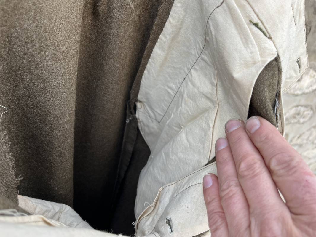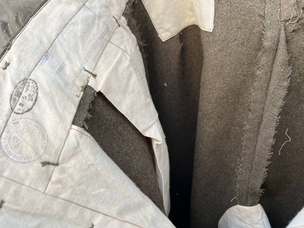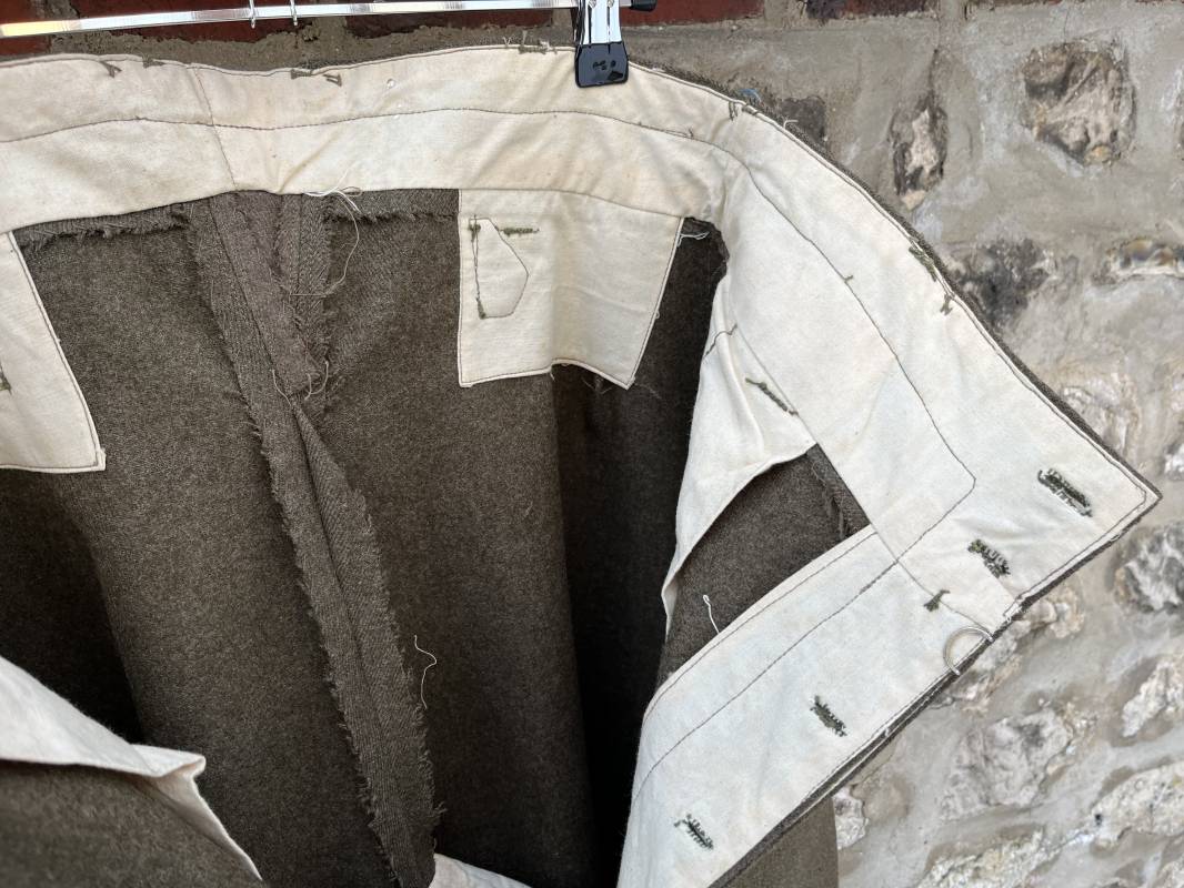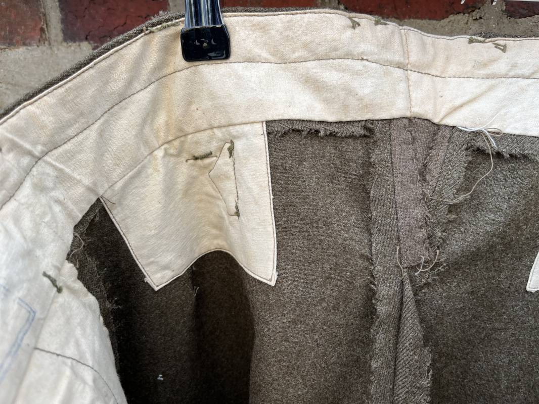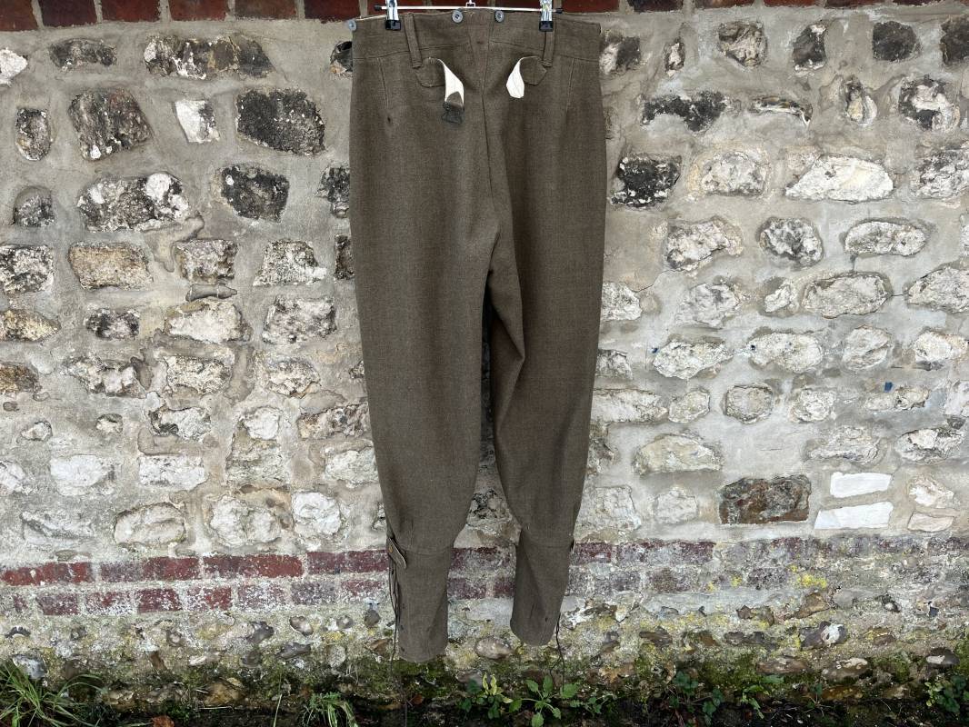 Trés belle culotte troupe modèle 1938 en gabardine kaki. Culotte réglementaire dite "golf". Passants de ceinturon en tissu. Boutons 'équipements militaires'. Crochet métallique de braguette. Deux poches latérales, poche à gousset. Martingale avec boutons alu. Bas des jambes à lacets. Lacets d'origines en coton kaki . Des deux pattes de serrage en drap et boutons sous genoux . Intèrieur doublé en coton blanc. Tampon rond fabricant . Daté 1940 Taille 88 M . Taille 42. Longueur 117 cm .Culotte trés lègèrement portée en trés bel état . Culotte définitive en collection 1939/40. Ref 21107