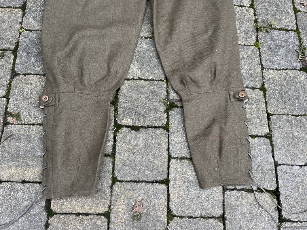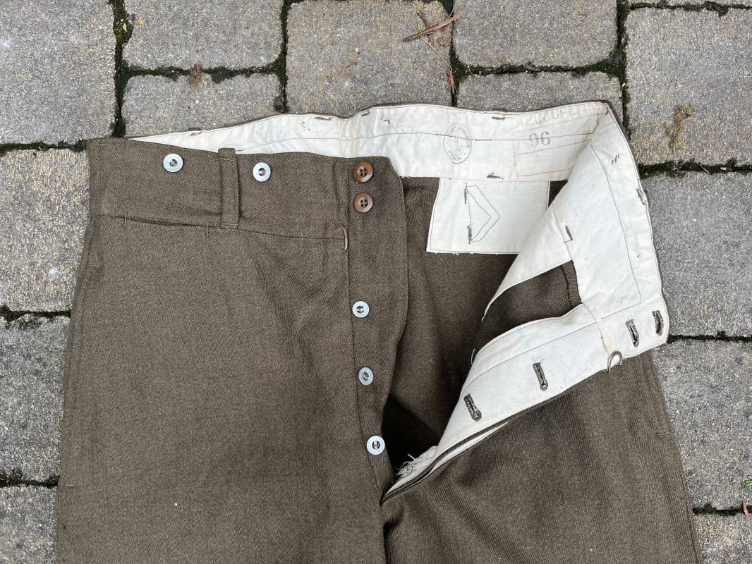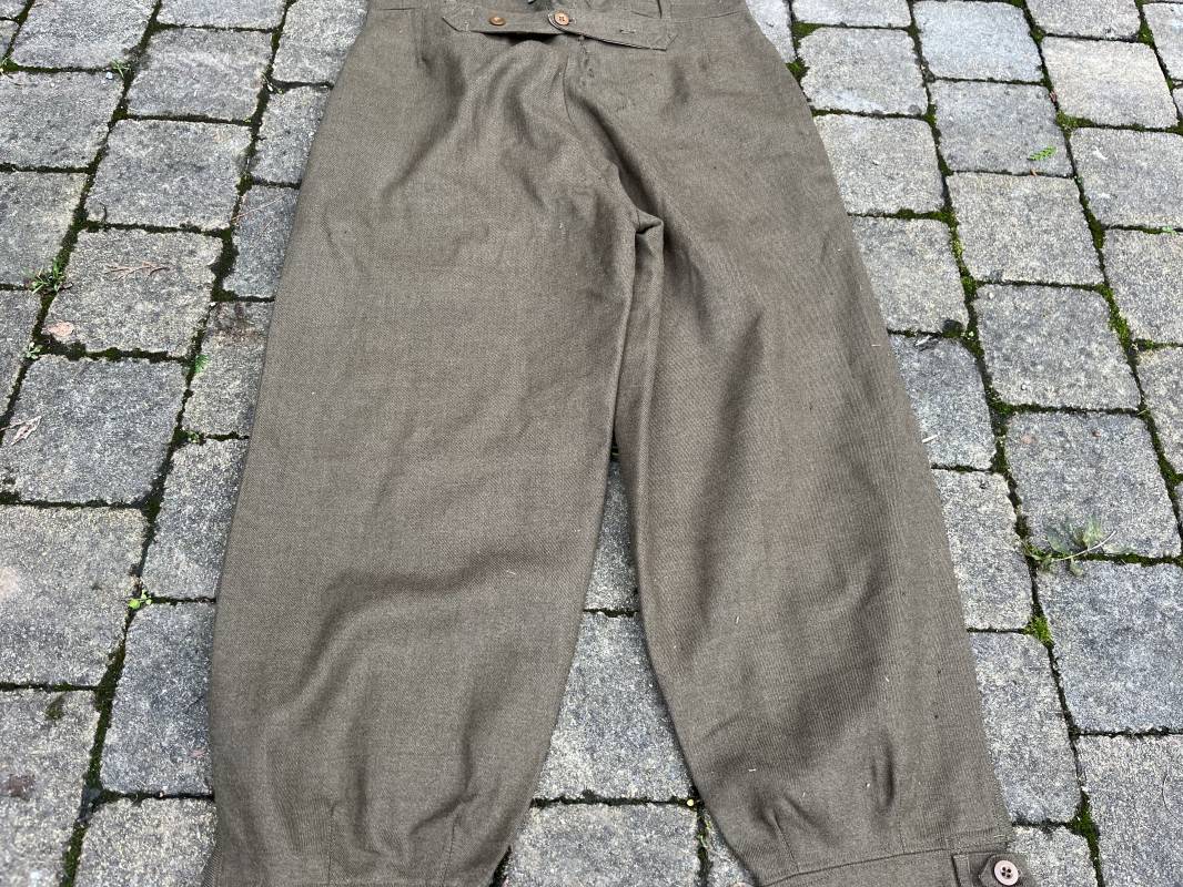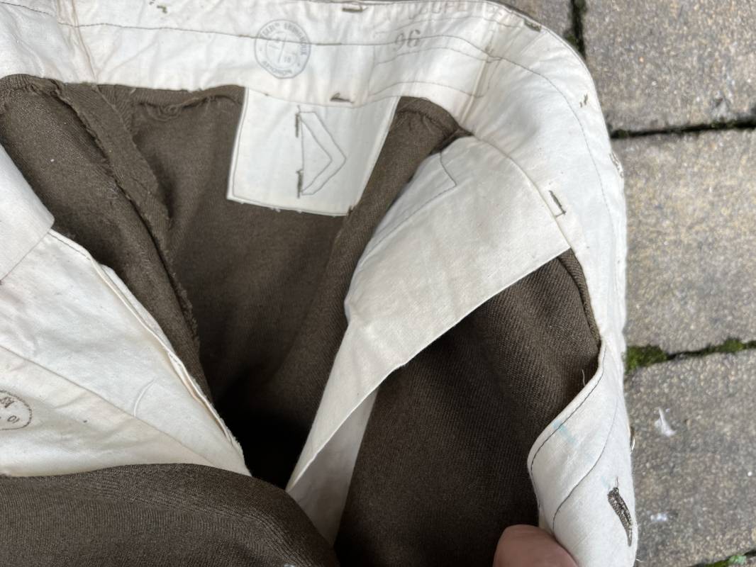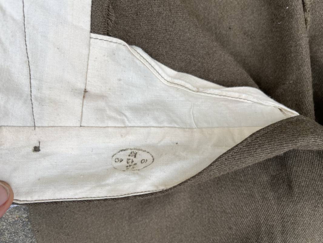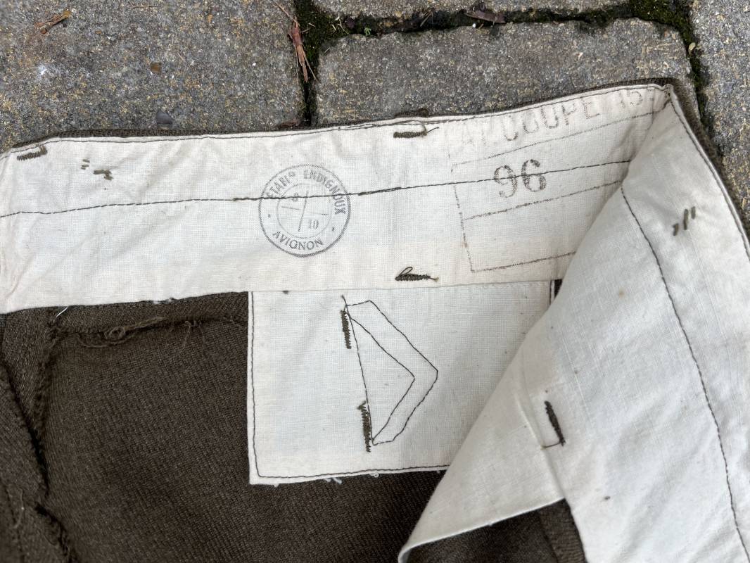 Trés belle culotte troupe modèle 1938 en gabardine kaki. Culotte réglementaire dite "golf". Passants de ceinturon en tissu. Boutons 'équipements militaires'. Crochet métallique de braguette. Deux poches latérales, poche à gousset. Martingale avec boutons plastique marron . Bas des jambes à lacets. Lacets d'origines en coton kaki . Des deux pattes de serrage en drap et boutons sous genoux . Intèrieur doublé en coton blanc. Tampon rond fabricant . Daté 1940 Taille 96 L . Taille 46. Longueur 123 cm .Culotte trés lègèrement portée en trés bel état .A noté un petit accroc réparé ( 2 cm ) sur le derrière sous la martingale ( voir photos ) Culotte définitive en collection 1939/40. Ref 17193