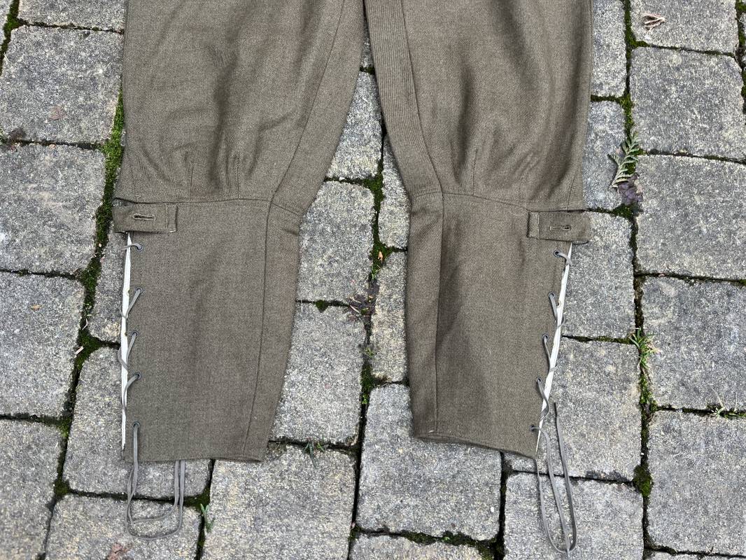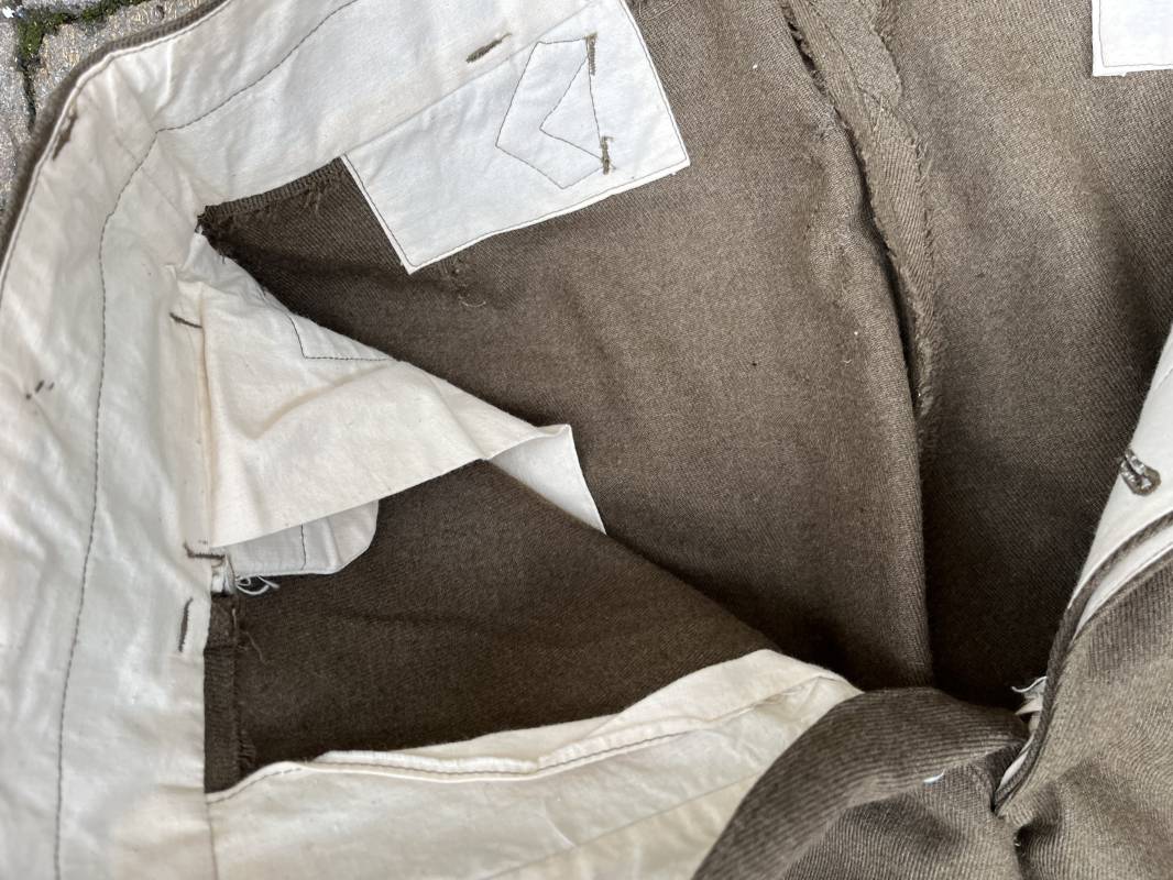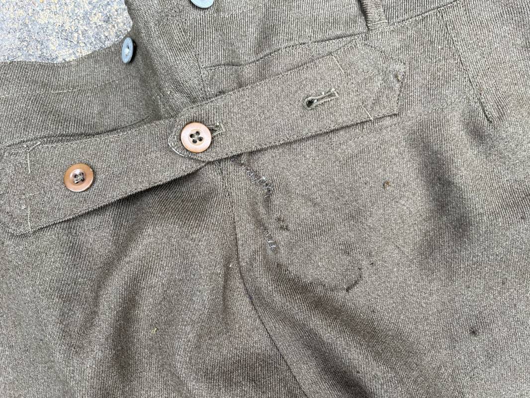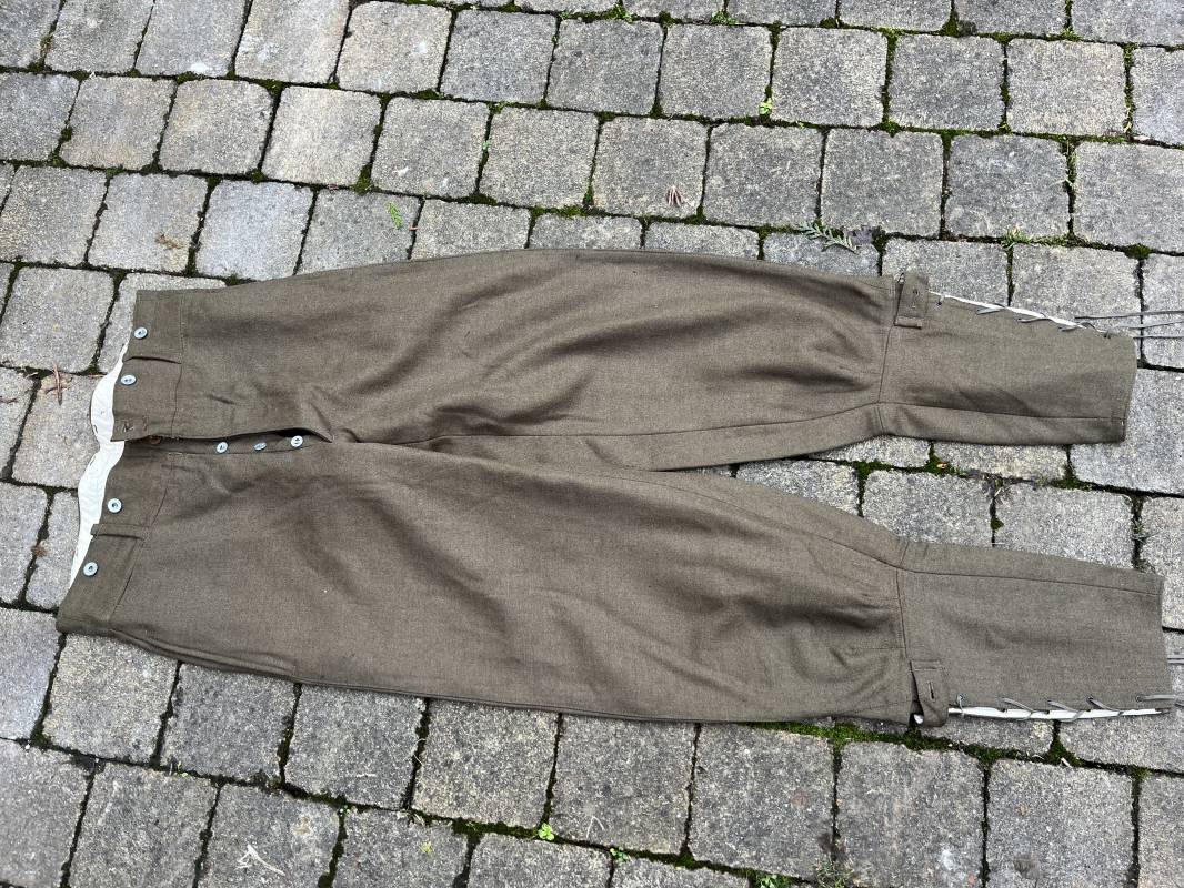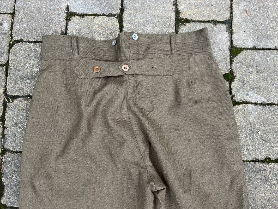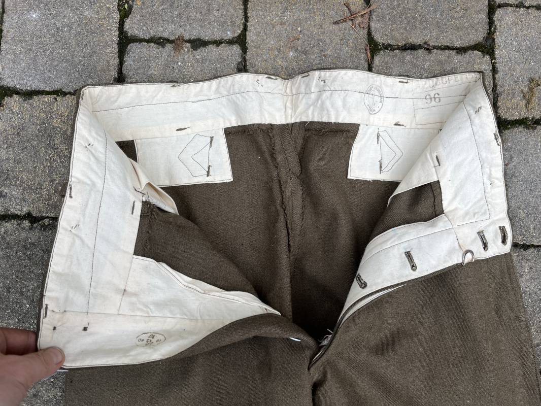 Trés belle culotte troupe modèle 1938 en gabardine kaki. Culotte réglementaire dite "golf". Passants de ceinturon en tissu. Boutons 'équipements militaires'. Crochet métallique de braguette. Deux poches latérales, poche à gousset. Martingale avec boutons plastique marron . Bas des jambes à lacets. Lacets d'origines en coton kaki . Des deux pattes de serrage en drap et boutons sous genoux . Intèrieur doublé en coton blanc. Tampon rond fabricant . Daté 1940 Taille 96 L . Taille 46. Longueur 123 cm .Culotte trés lègèrement portée en trés bel état .A noté un petit accroc réparé ( 2 cm ) sur le derrière sous la martingale ( voir photos ) Culotte définitive en collection 1939/40. Ref 17193