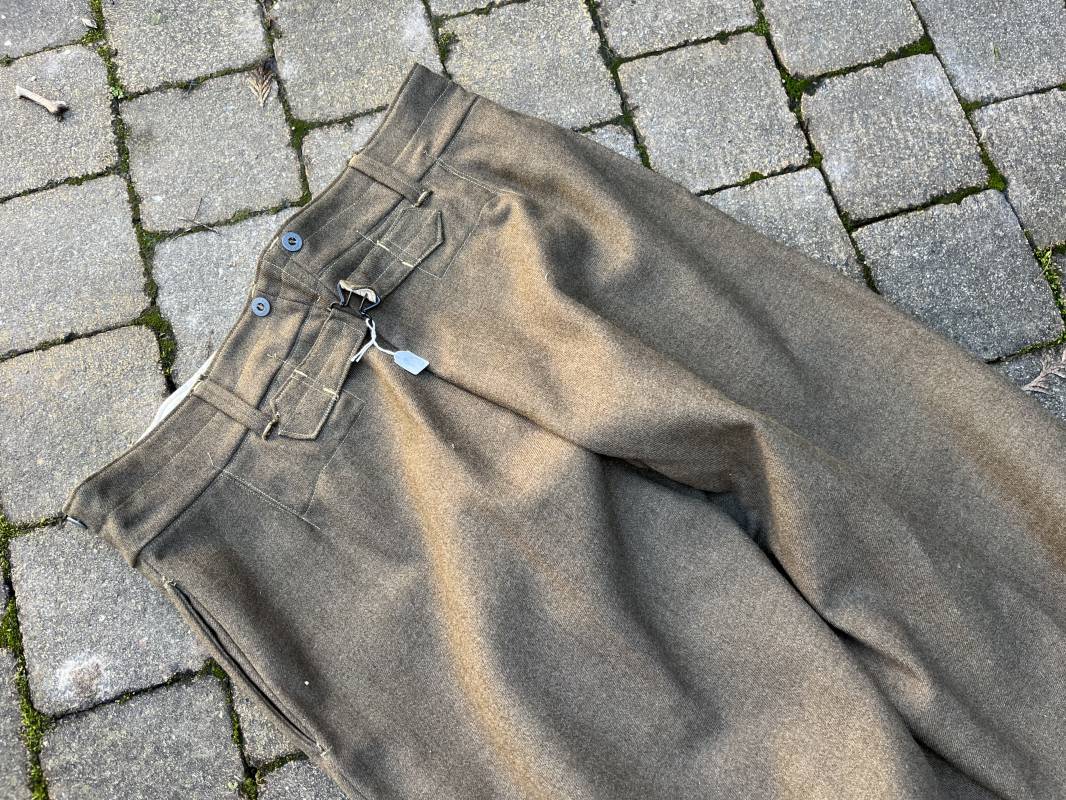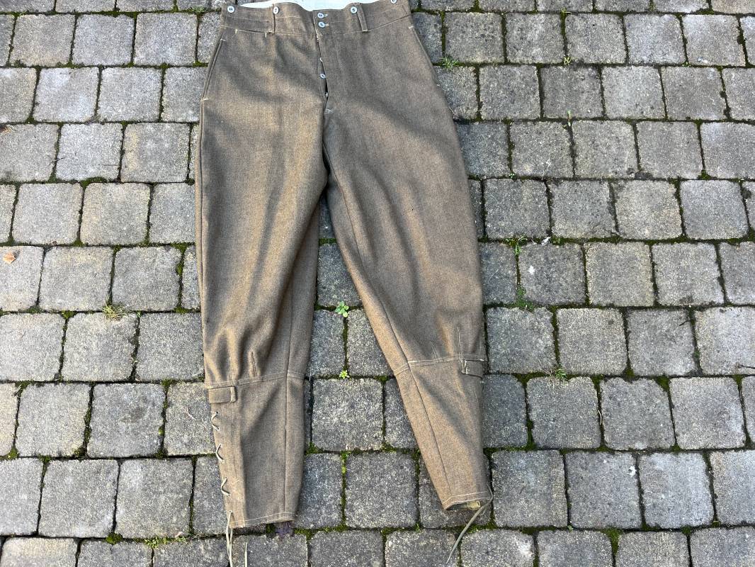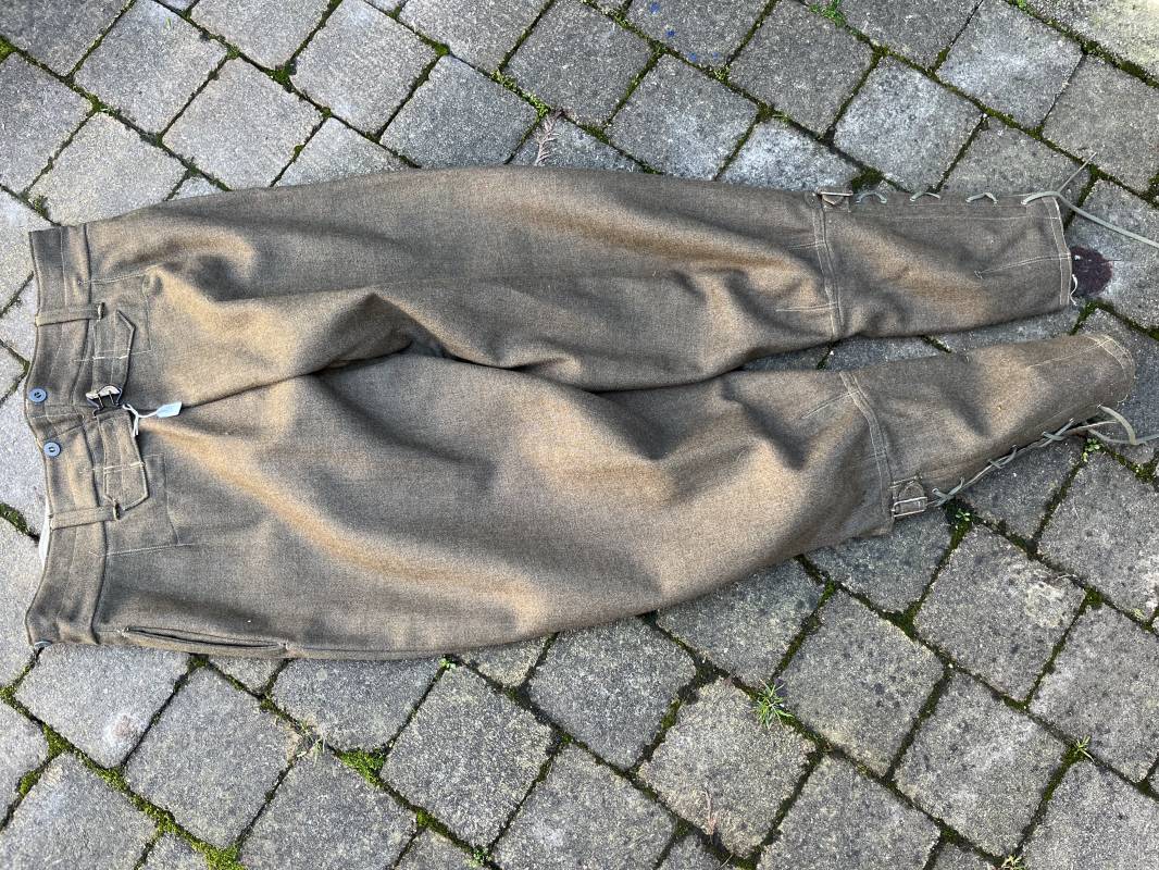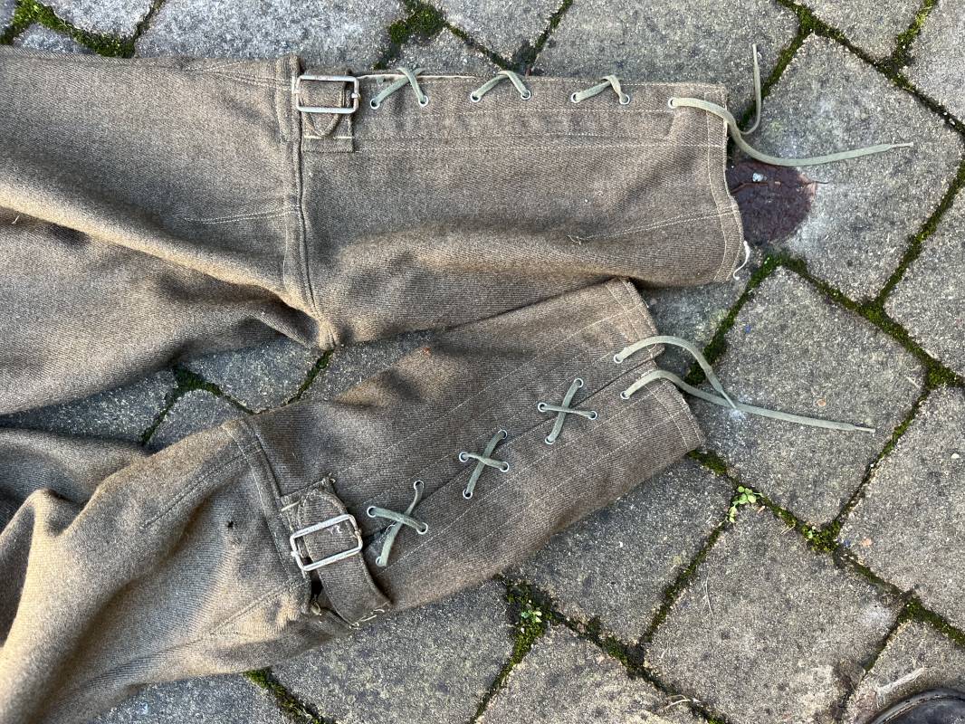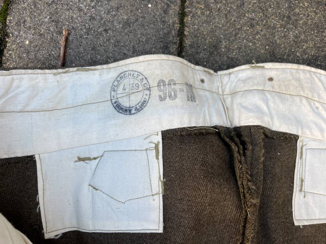 Trés belle culotte troupe modèle 1938 en gabardine kaki. Culotte réglementaire dite "golf". Passants de ceinturon en tissu. Boutons 'équipements militaires'. Crochet métallique de braguette. Deux poches latérales, poche à gousset. Martingale avec boucle de serrage métallique . Bas des jambes à lacets. Lacets d'origines en coton kaki . Des deux pattes de serrage en drap et boucles métalliques sous genoux . Intèrieur doublé en coton blanc. Tampon rond fabricant . Daté 4 1939 Taille 96 LM . Taille 46. Longueur 119 cm .Culotte trés lègèrement portée en trés bel état . Culotte définitive en collection 1939/40. Ref 21852