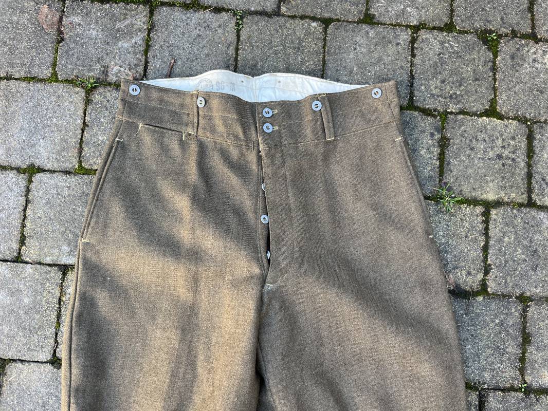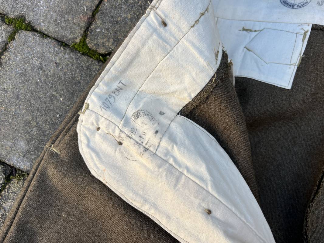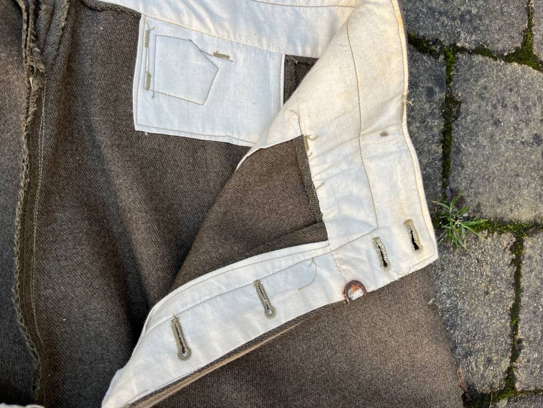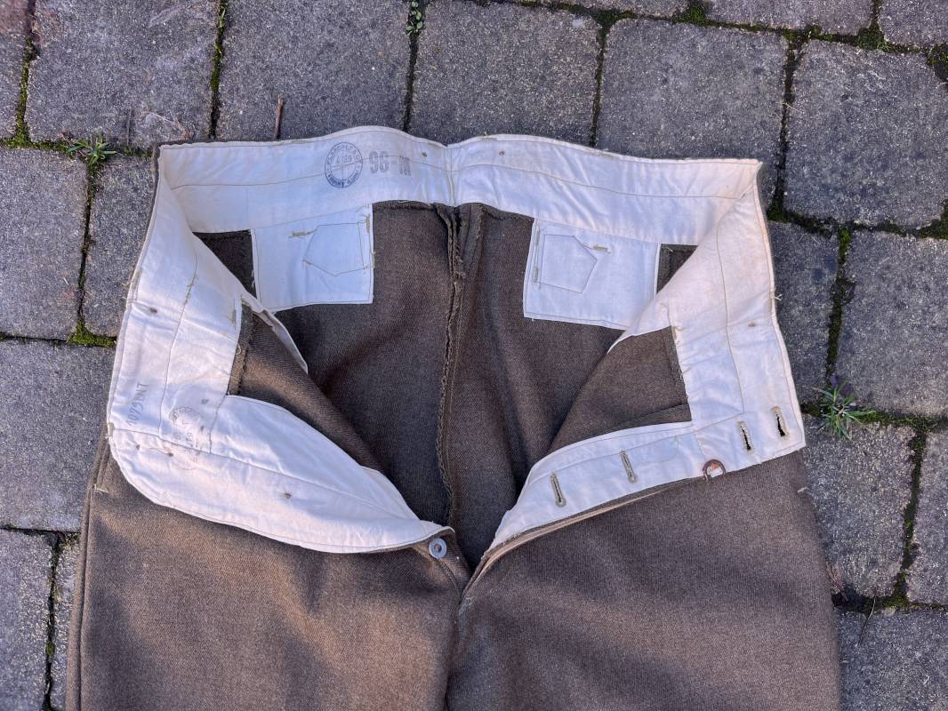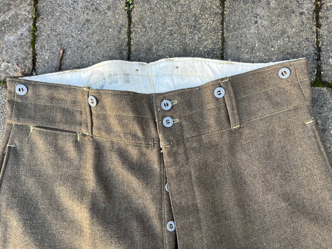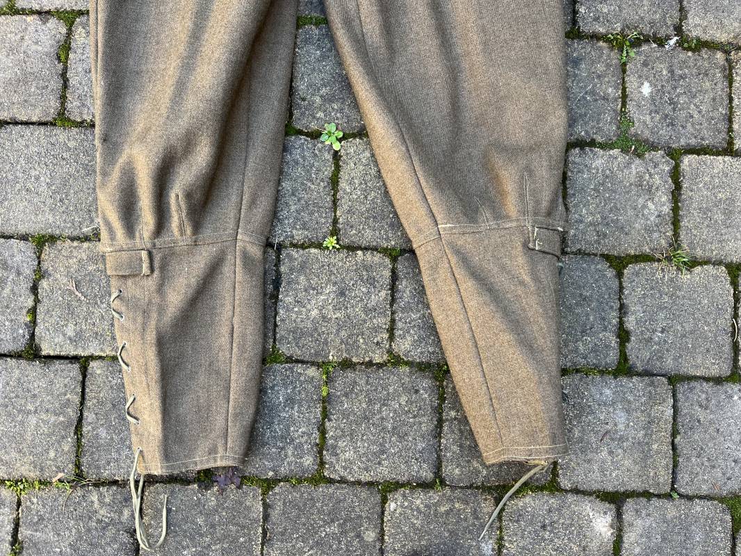 Trés belle culotte troupe modèle 1938 en gabardine kaki. Culotte réglementaire dite "golf". Passants de ceinturon en tissu. Boutons 'équipements militaires'. Crochet métallique de braguette. Deux poches latérales, poche à gousset. Martingale avec boucle de serrage métallique . Bas des jambes à lacets. Lacets d'origines en coton kaki . Des deux pattes de serrage en drap et boucles métalliques sous genoux . Intèrieur doublé en coton blanc. Tampon rond fabricant . Daté 4 1939 Taille 96 LM . Taille 46. Longueur 119 cm .Culotte trés lègèrement portée en trés bel état . Culotte définitive en collection 1939/40. Ref 21852
