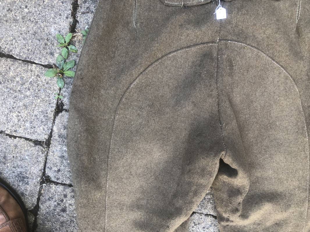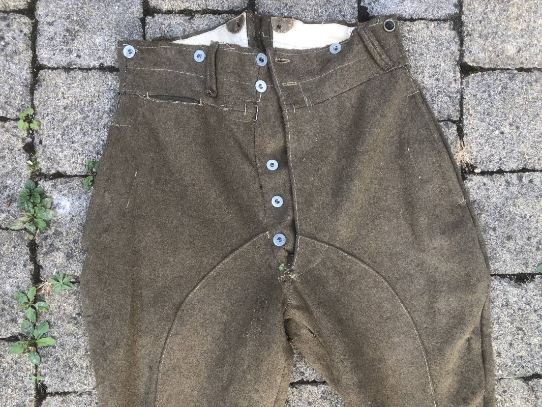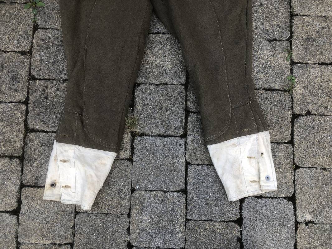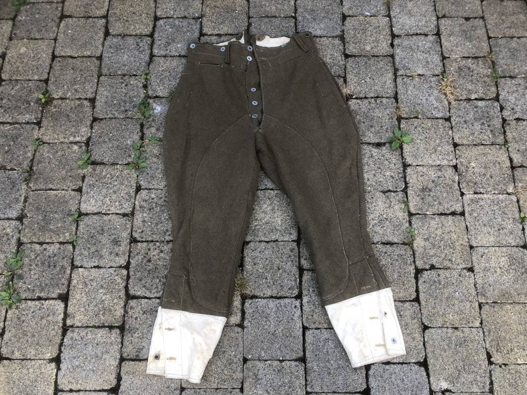 Culotte troupe montée modéle 1933 en drap kaki . Culotte réglementaire pour cavalier , artilleur ... . Passants de ceinturon en drap , crochet métallique de braguette . Boutons alu ' équipements militaires' . Martingale , deux poches latérales et poches a gousset . Pattes de fermeture en drap sur poches latérales . Renforts a l'entre deux jambes en drap . Bas des jambes boutonnés avec manchettes en toile de coton blanc . Doublure intérieure en toile de coton blanc . Marquage fabricant daté 1936 Tampons d'affectation CMG n°28 . Taille 40 Longueur 98 cm . Drap frais , culotte portée en bon état 100 % dans son jus et intouchée 1935/40 Ref 19033
