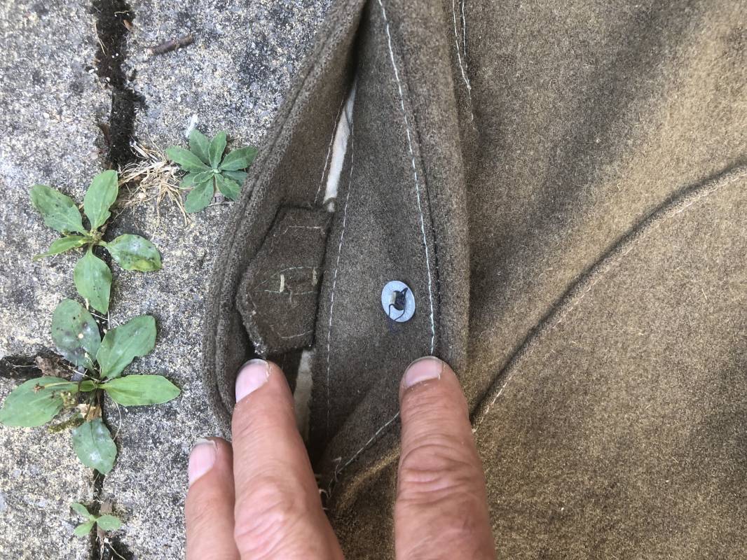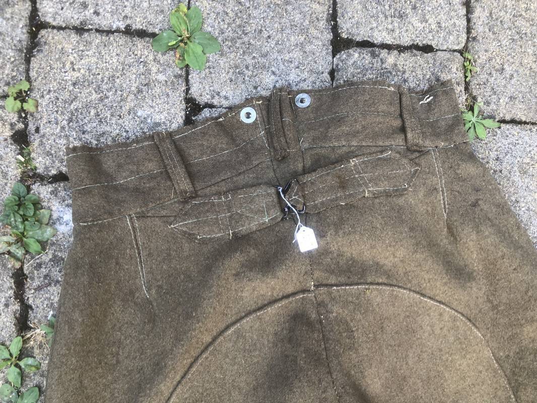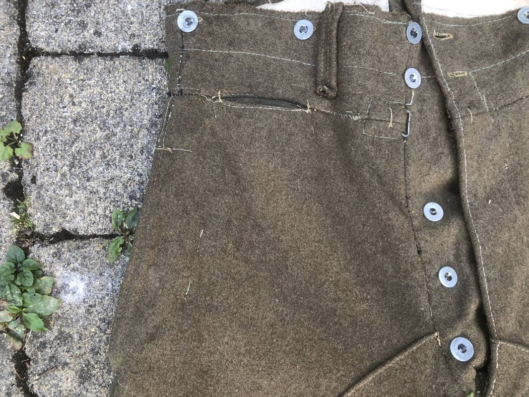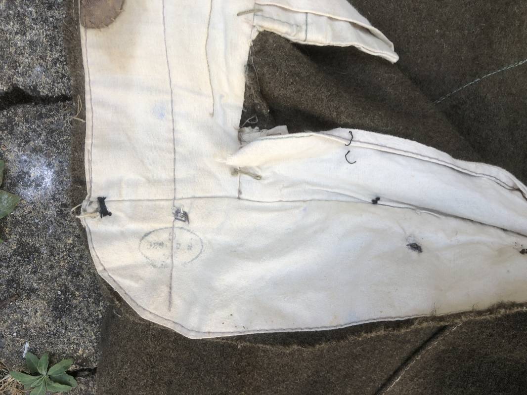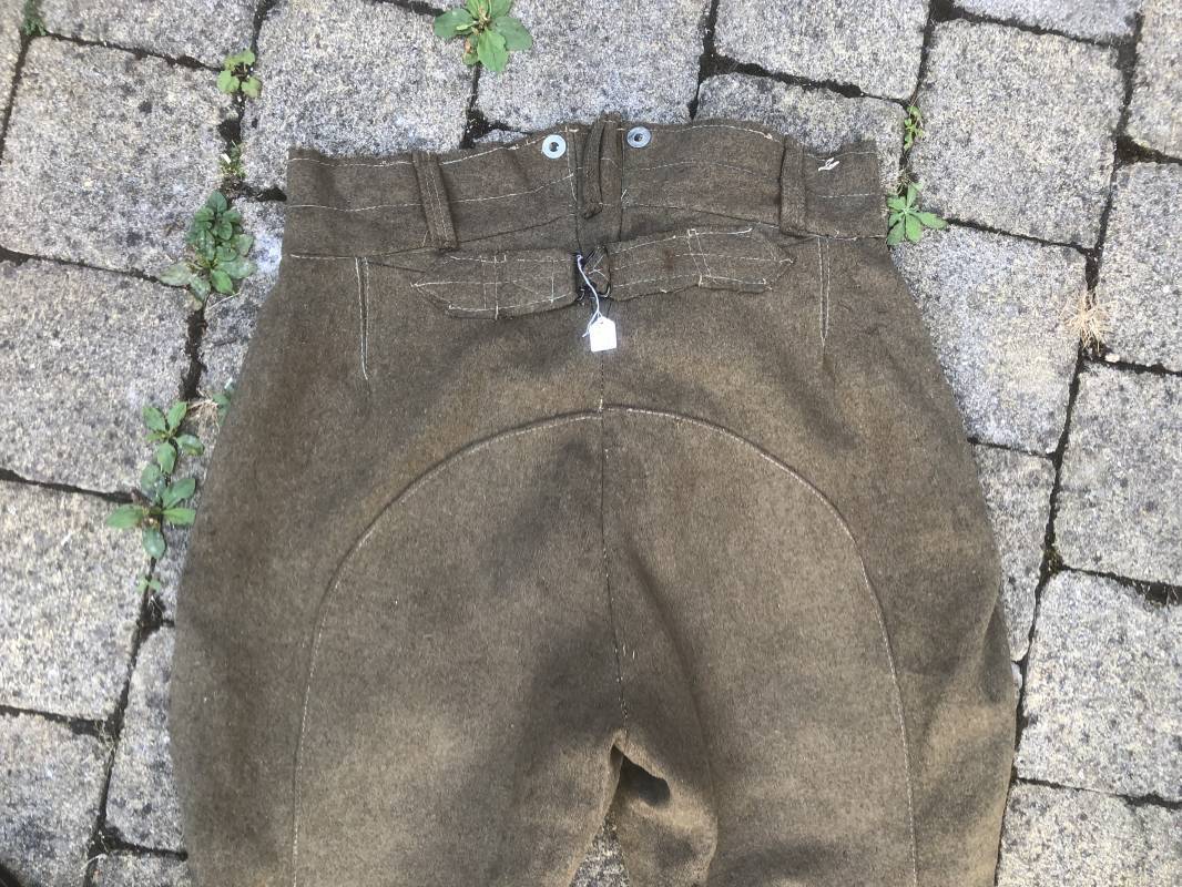Culotte troupe montée modéle 1933 en drap kaki . Culotte réglementaire pour cavalier , artilleur ... . Passants de ceinturon en drap , crochet métallique de braguette . Boutons alu ' équipements militaires' . Martingale , deux poches latérales et poches a gousset . Pattes de fermeture en drap sur poches latérales . Renforts a l'entre deux jambes en drap . Bas des jambes boutonnés avec manchettes en toile de coton blanc . Doublure intérieure en toile de coton blanc . Marquage fabricant daté 1936 Tampons d'affectation CMG n°28 . Taille 40 Longueur 98 cm . Drap frais , culotte portée en bon état 100 % dans son jus et intouchée 1935/40 Ref 19033