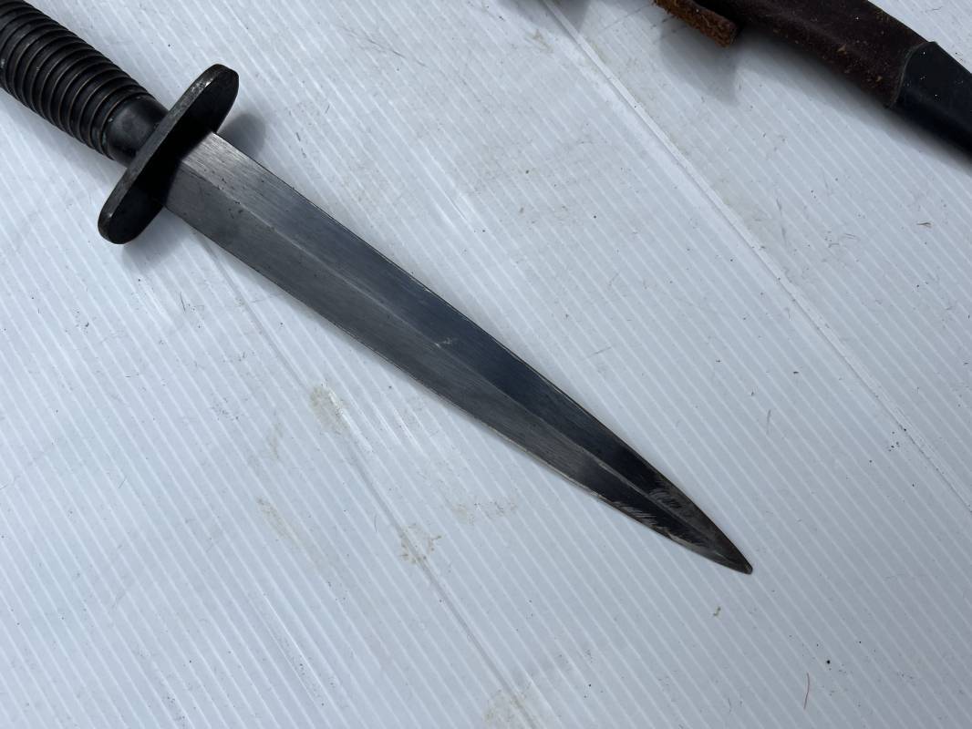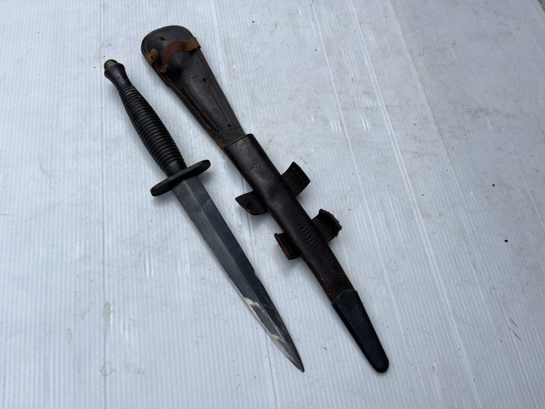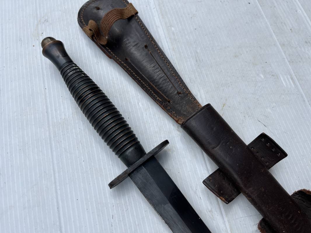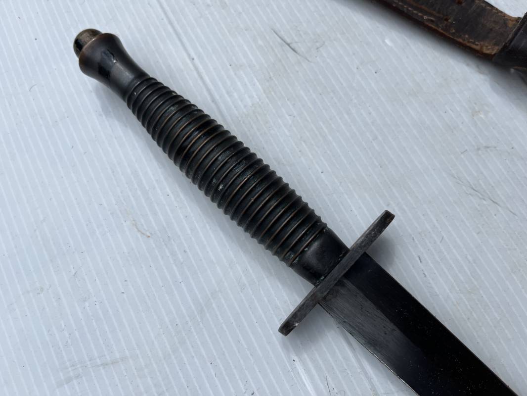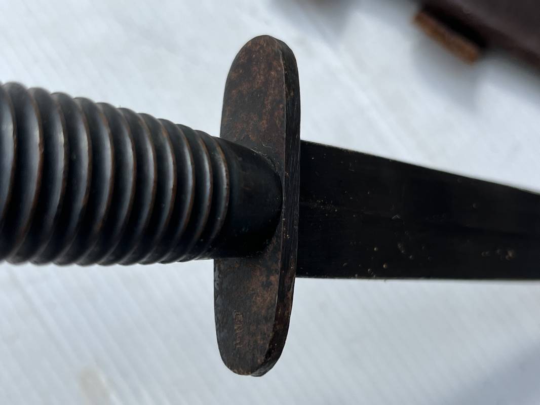 Superbe dague Fairbairn du 3éme modéle avec son fourreau en cuir marron . Rare dague des troupes de choc britanniques ( commando , parachutistes , éclaireurs ) Poignée à cannelure cotelée , pommeau en forme d'olive . Marquage fabricant ' 2 ' sur le haut de la poignée . Garde acier ovale . Trés belle lame bronzée d'origine Longueur 168 mm . Lame trés coupante à double tranchants . Fourreau en cuir marron foncé , passant de ceinturon , élastique marron d'origine , passants en cuir de fixation par couture . Bouterole en laiton noirci Rivets en laiton . 100 % dans son jus et totalement intouché 1943/45 Dague définitive dans une collection en superbe état . Ref 19225