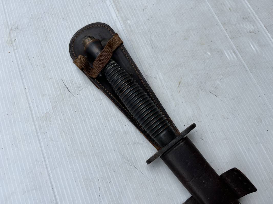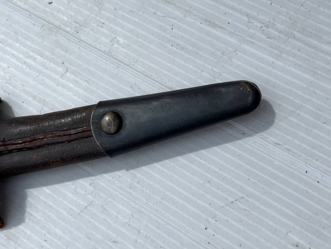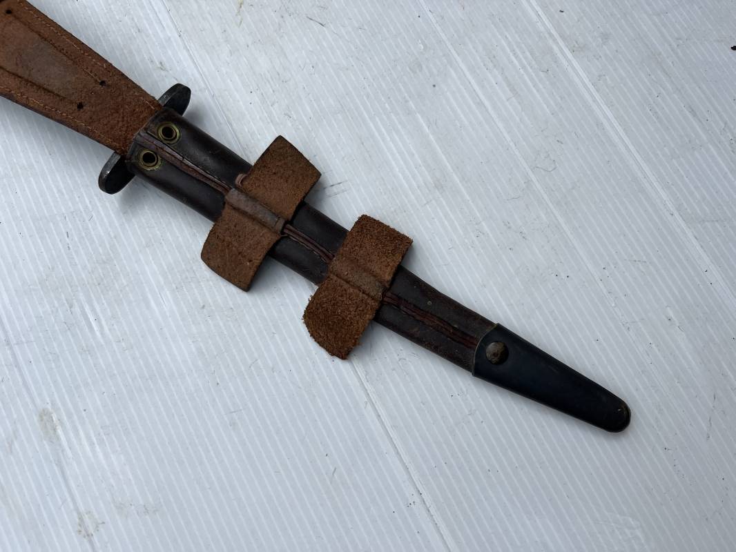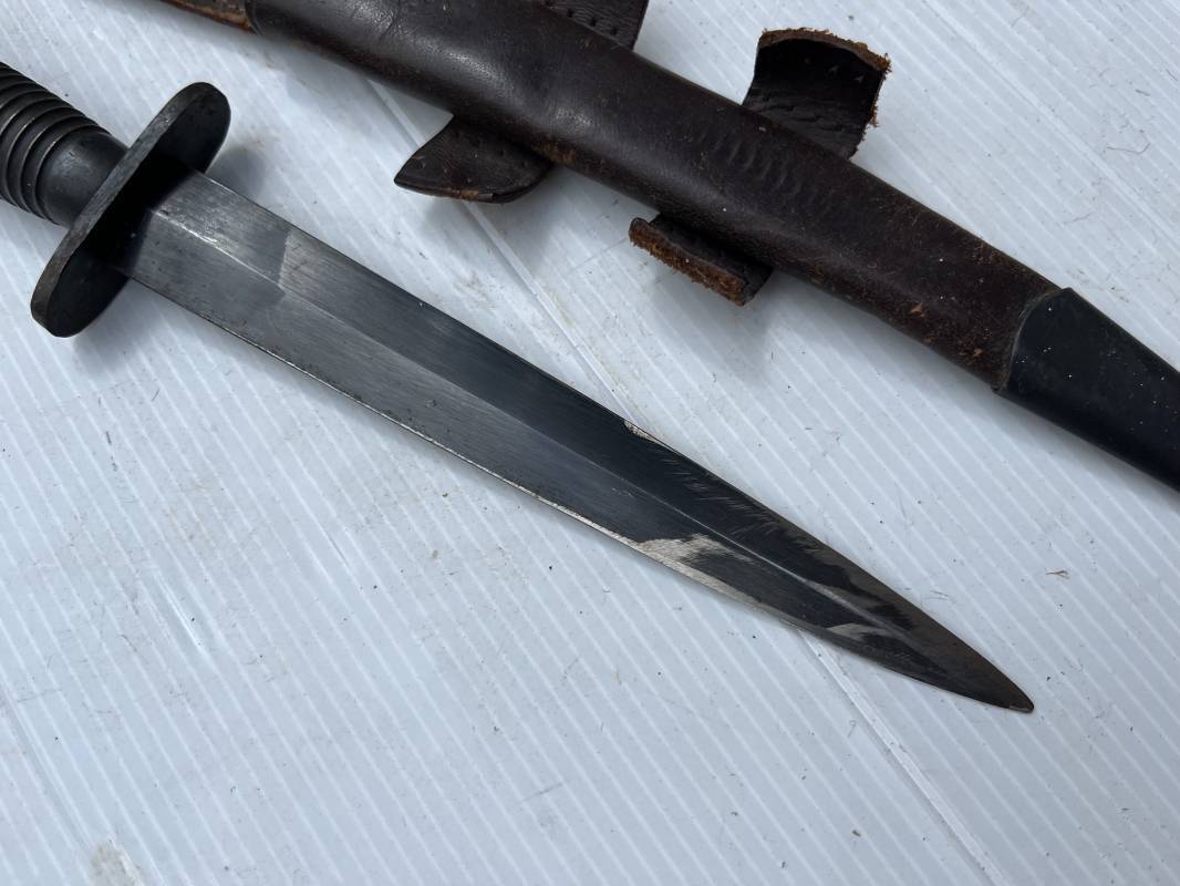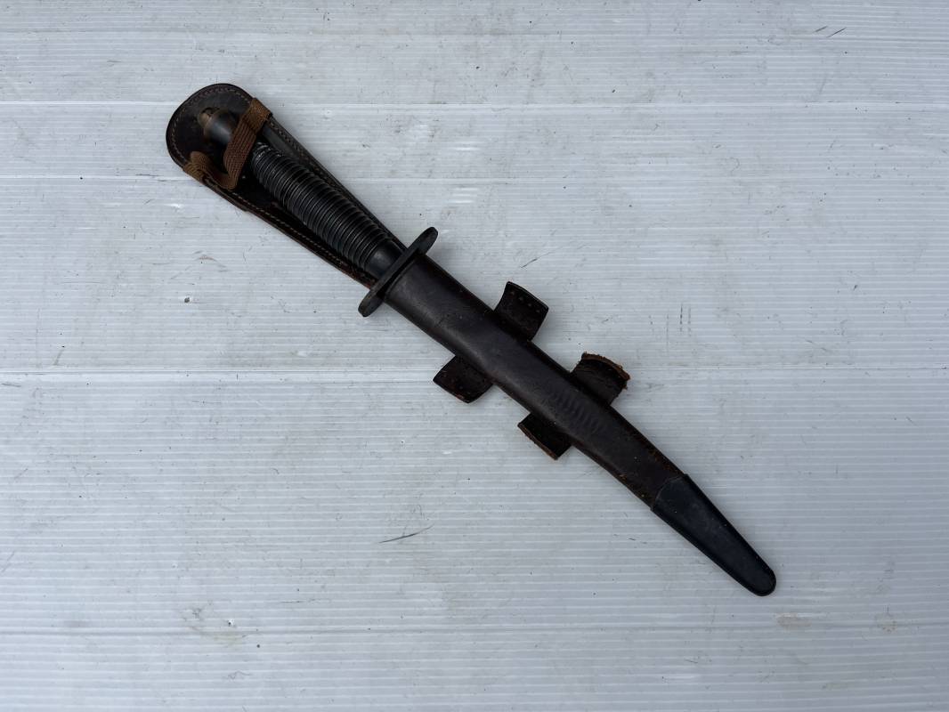 Superbe dague Fairbairn du 3éme modéle avec son fourreau en cuir marron . Rare dague des troupes de choc britanniques ( commando , parachutistes , éclaireurs ) Poignée à cannelure cotelée , pommeau en forme d'olive . Marquage fabricant ' 2 ' sur le haut de la poignée . Garde acier ovale . Trés belle lame bronzée d'origine Longueur 168 mm . Lame trés coupante à double tranchants . Fourreau en cuir marron foncé , passant de ceinturon , élastique marron d'origine , passants en cuir de fixation par couture . Bouterole en laiton noirci Rivets en laiton . 100 % dans son jus et totalement intouché 1943/45 Dague définitive dans une collection en superbe état . Ref 19225