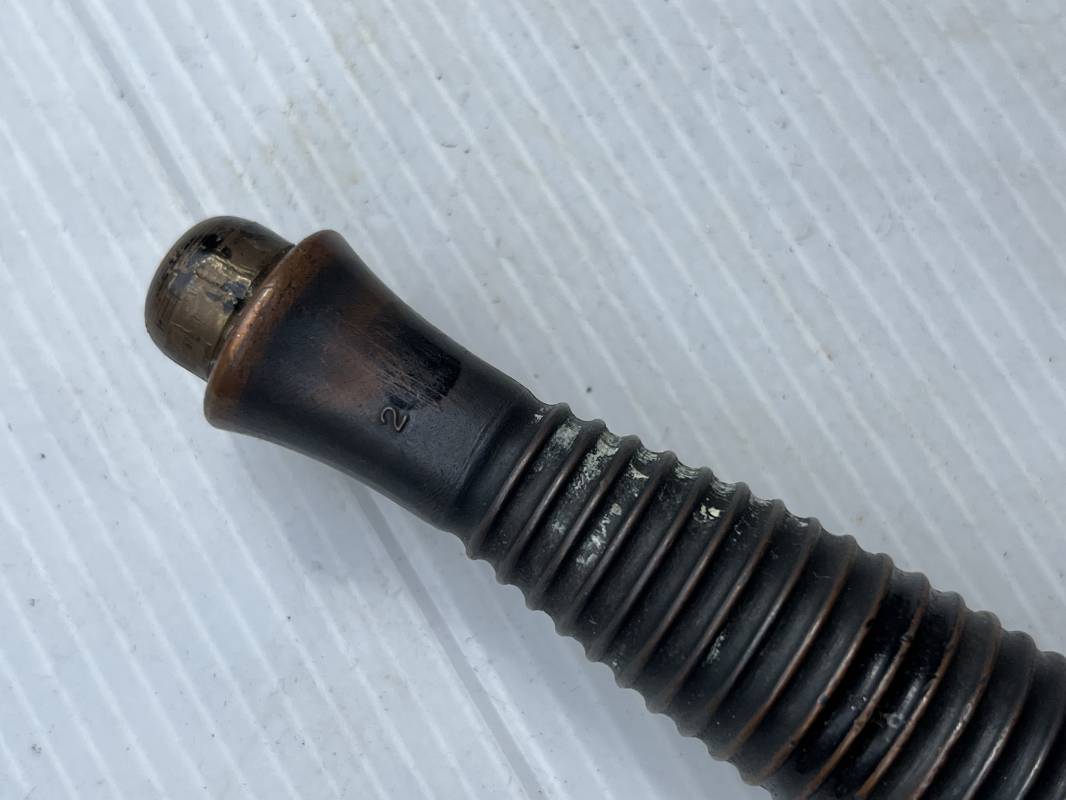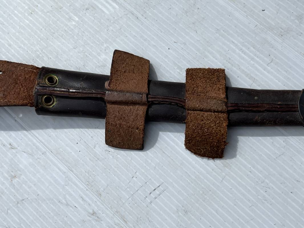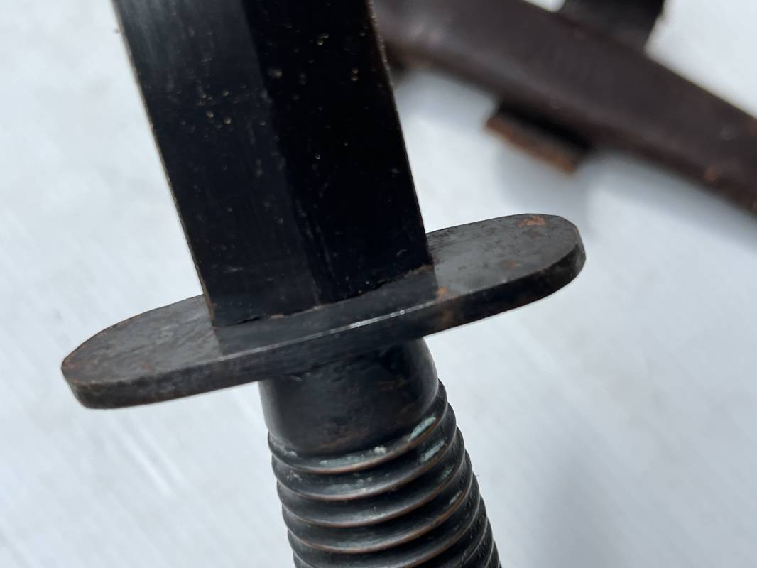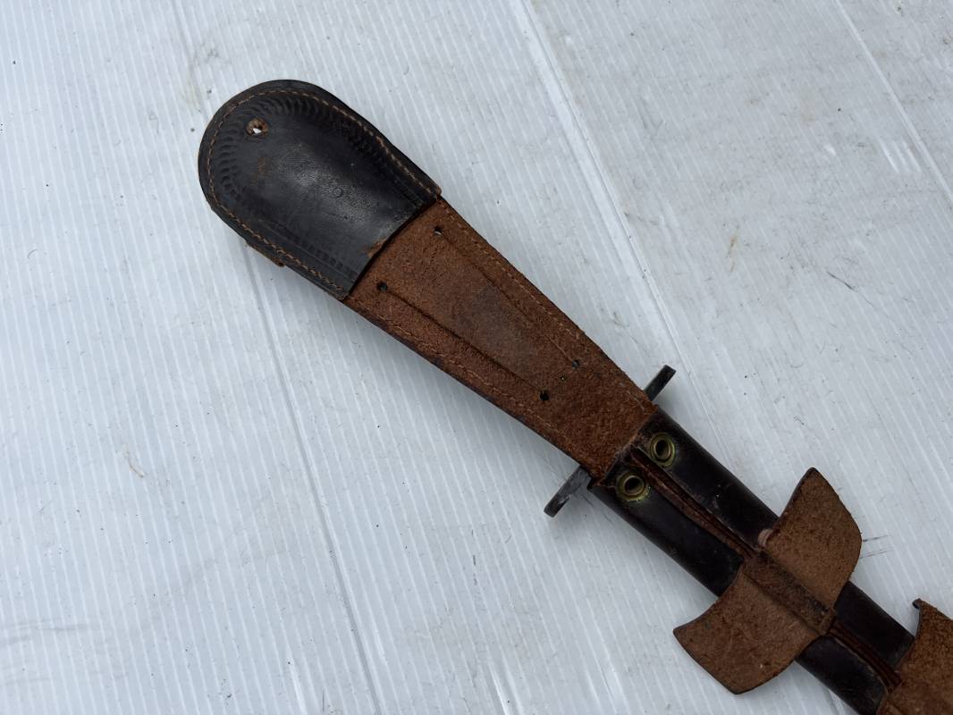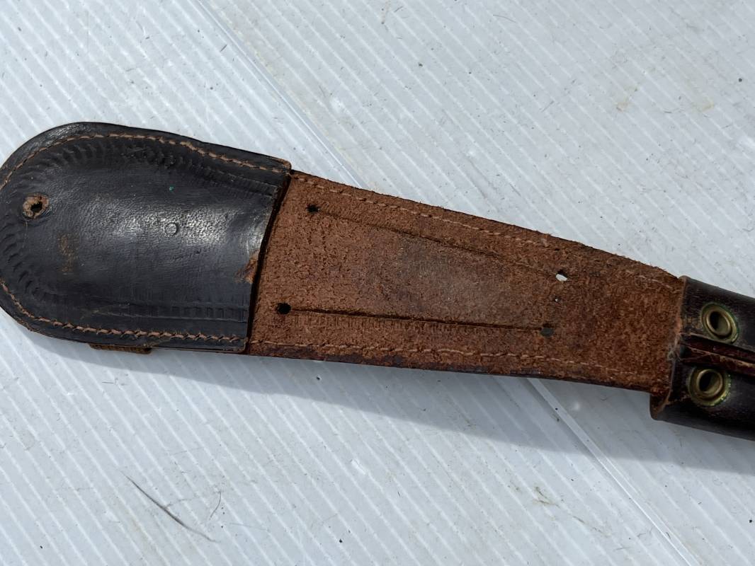 Superbe dague Fairbairn du 3éme modéle avec son fourreau en cuir marron . Rare dague des troupes de choc britanniques ( commando , parachutistes , éclaireurs ) Poignée à cannelure cotelée , pommeau en forme d'olive . Marquage fabricant ' 2 ' sur le haut de la poignée . Garde acier ovale . Trés belle lame bronzée d'origine Longueur 168 mm . Lame trés coupante à double tranchants . Fourreau en cuir marron foncé , passant de ceinturon , élastique marron d'origine , passants en cuir de fixation par couture . Bouterole en laiton noirci Rivets en laiton . 100 % dans son jus et totalement intouché 1943/45 Dague définitive dans une collection en superbe état . Ref 19225