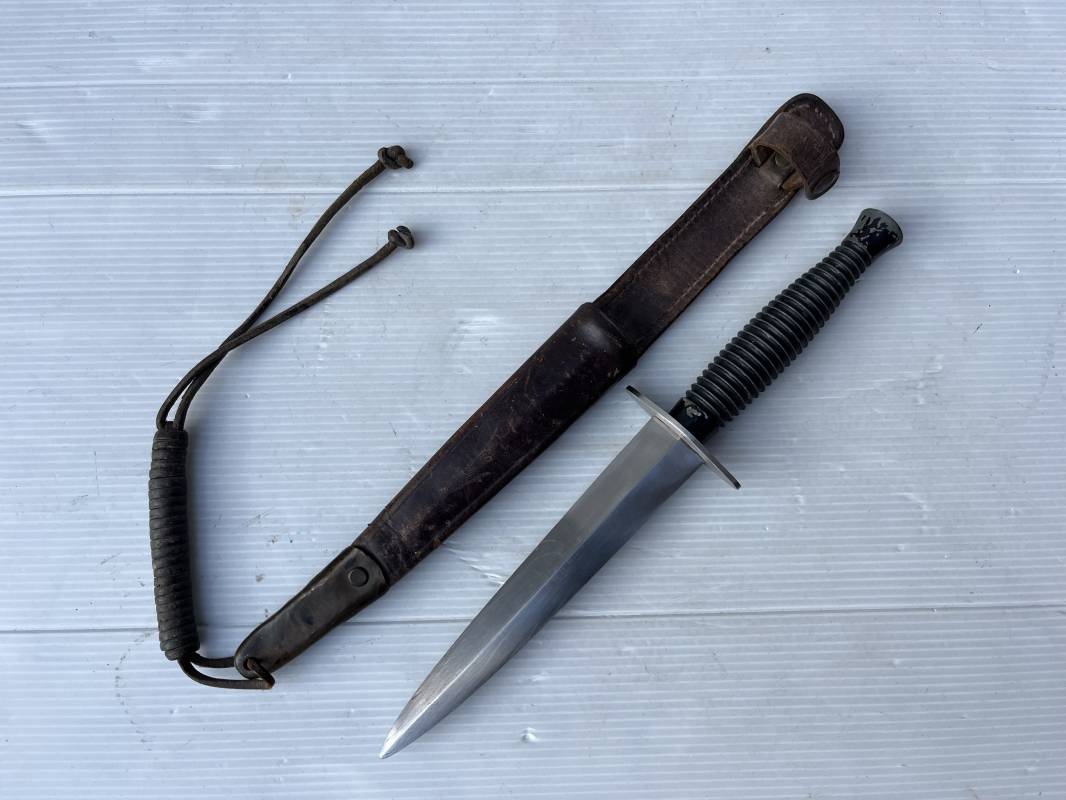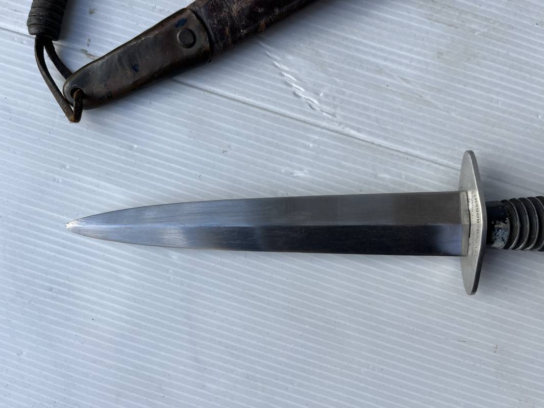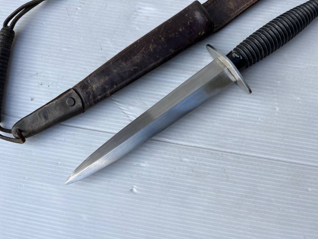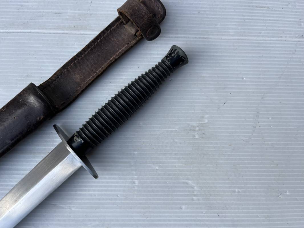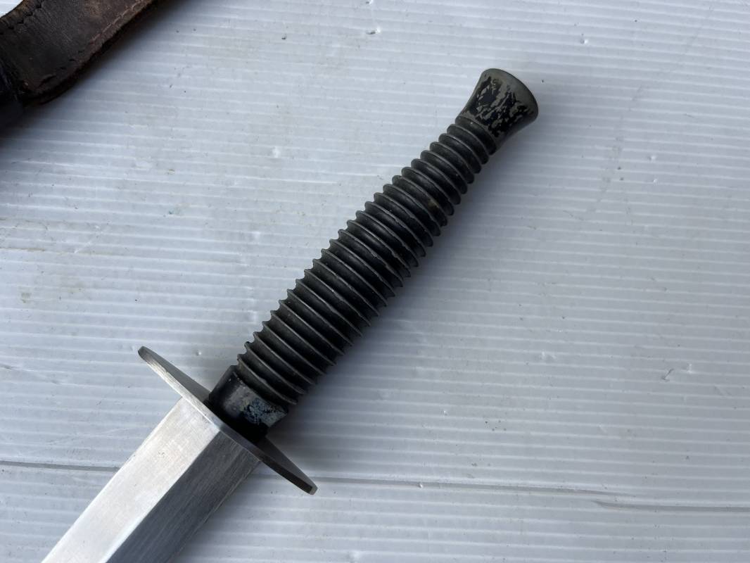 Rare dague 'commando' parachutiste copié sur le modéle Britannique Fairbairn SyKe . Dague de production francaise Marquage sur la garde ovale en acier ; ' Le commando Inox' Marque et modéle déposés Super Nogent . Poignée en metal cannelé . Lame en acier Fourreau en cuir marron avec passant de ceinturon , lanière en cuir et pression . Passant métallique à ressort pour le port au ceinturon . Lacet d origine en cuir . Beau poignard commando parachutiste en pafait état . 100 % dans son jus et intouché . Ref 18624