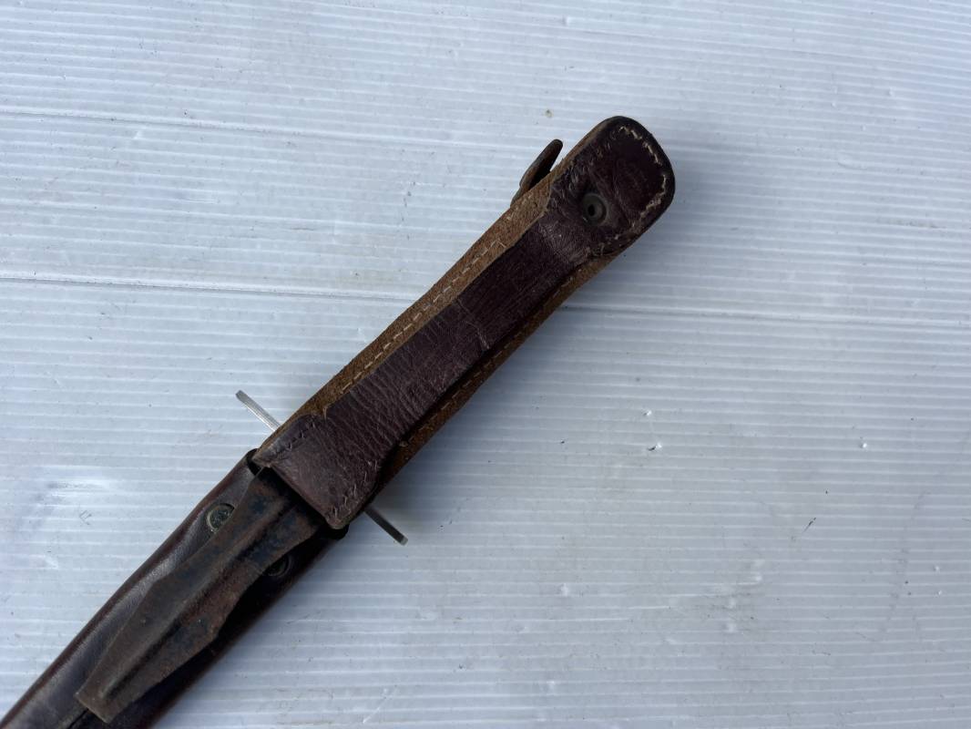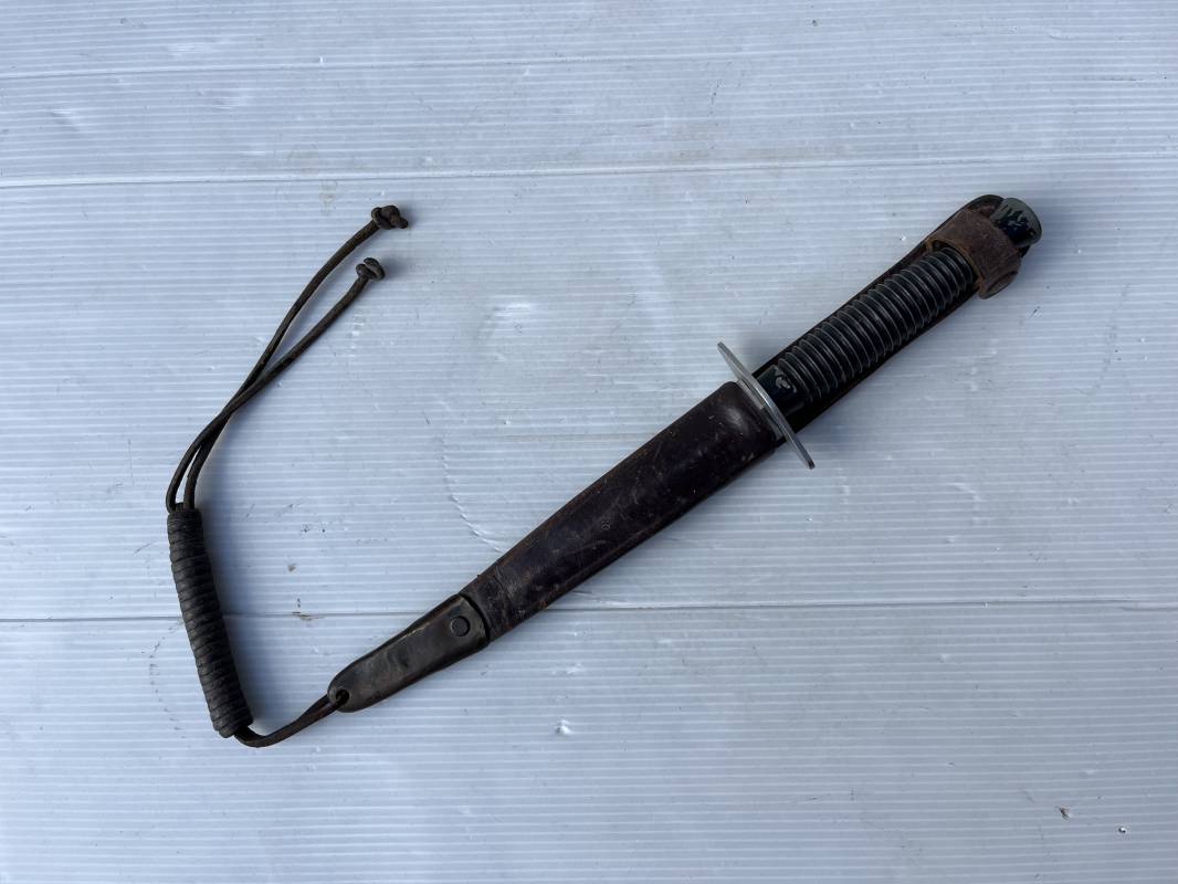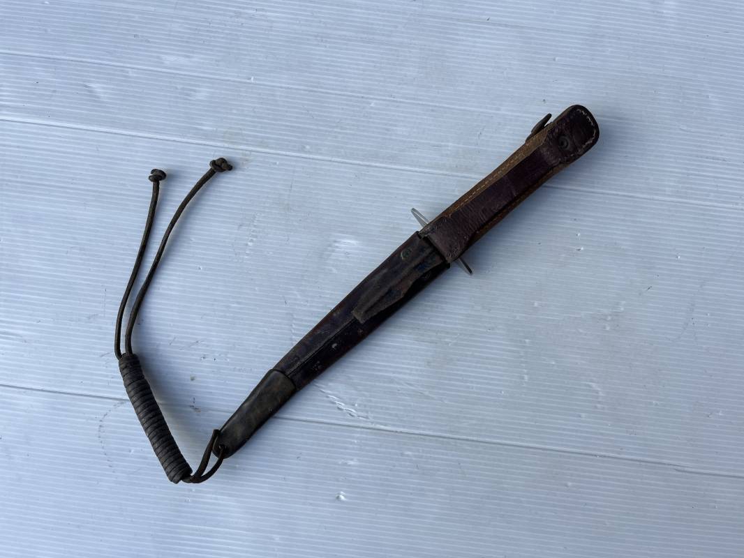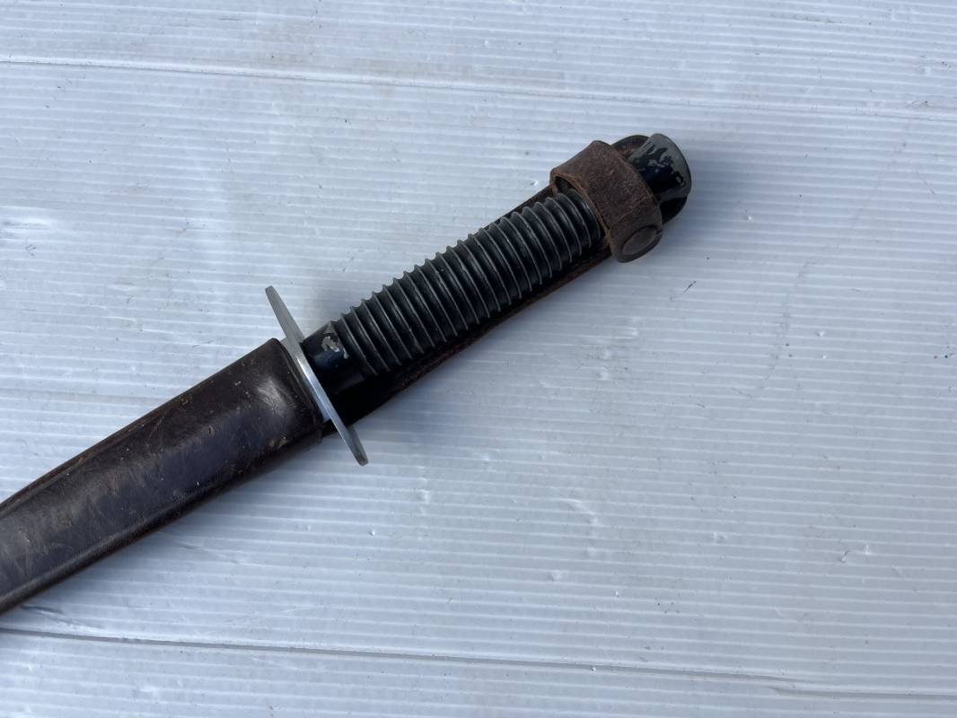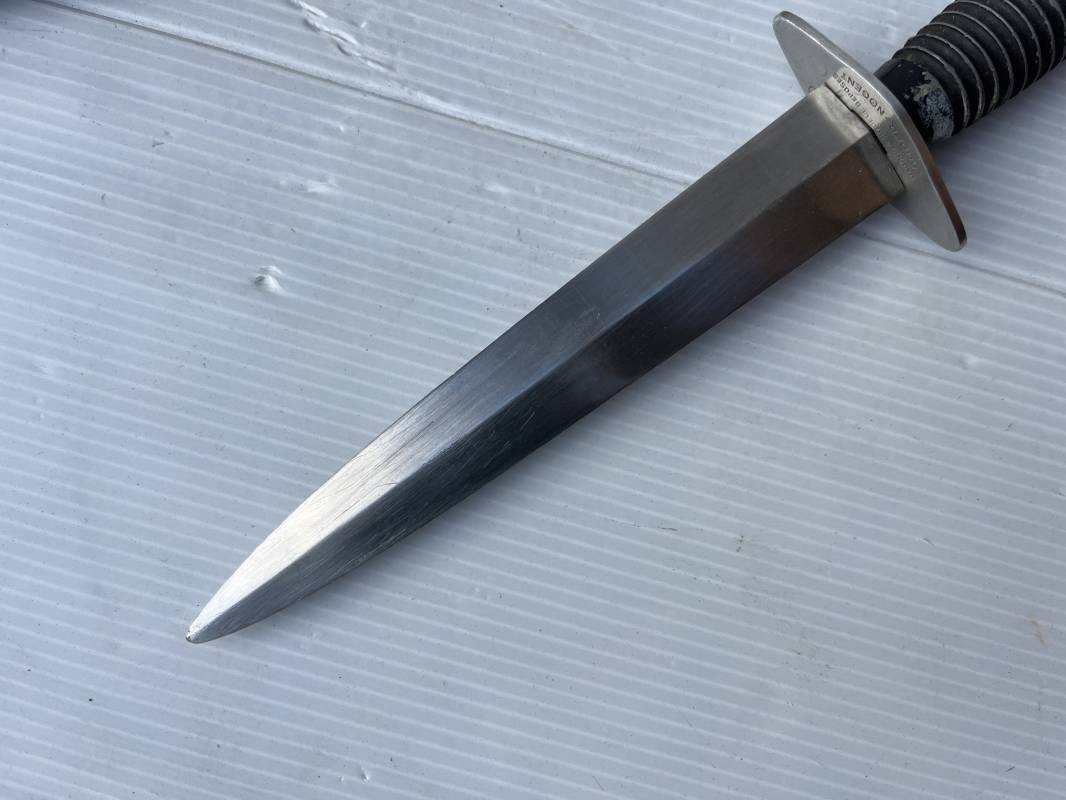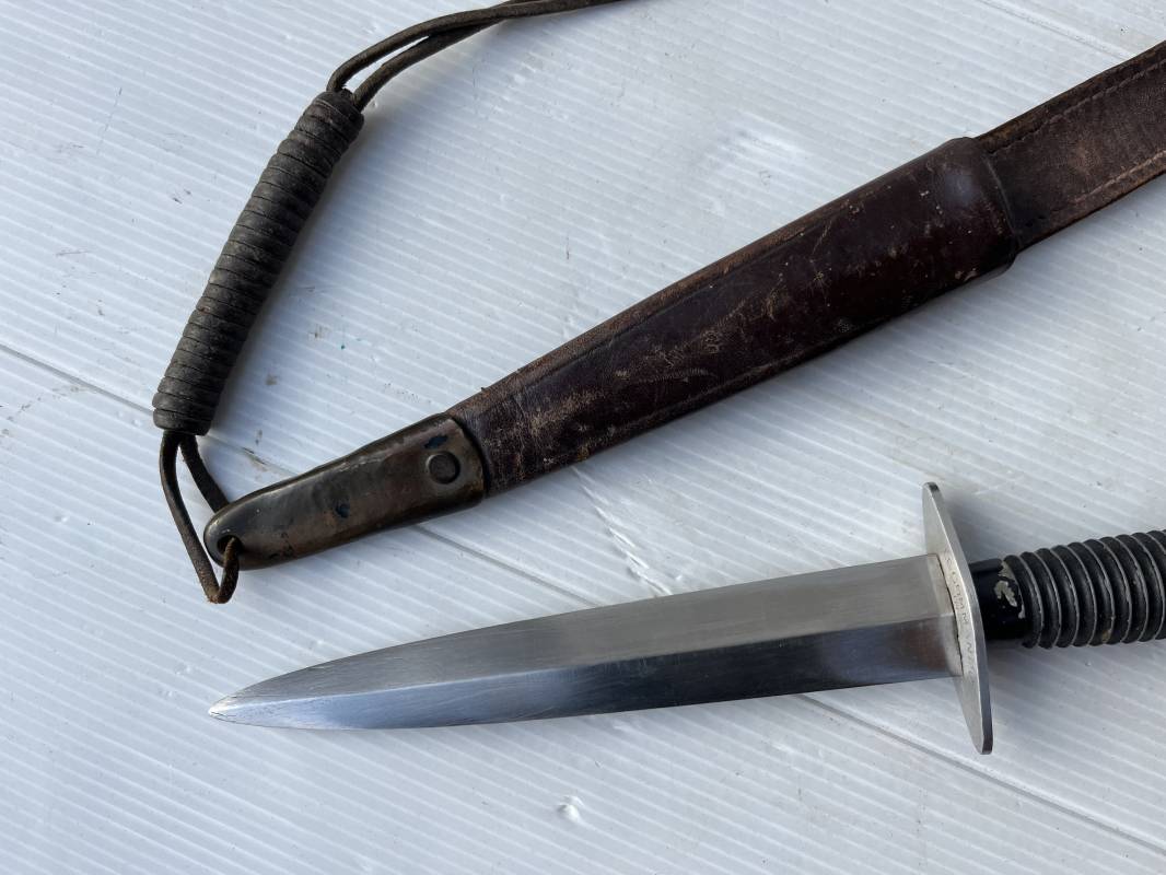 Rare dague 'commando' parachutiste copié sur le modéle Britannique Fairbairn SyKe . Dague de production francaise Marquage sur la garde ovale en acier ; ' Le commando Inox' Marque et modéle déposés Super Nogent . Poignée en metal cannelé . Lame en acier Fourreau en cuir marron avec passant de ceinturon , lanière en cuir et pression . Passant métallique à ressort pour le port au ceinturon . Lacet d origine en cuir . Beau poignard commando parachutiste en pafait état . 100 % dans son jus et intouché . Ref 18624