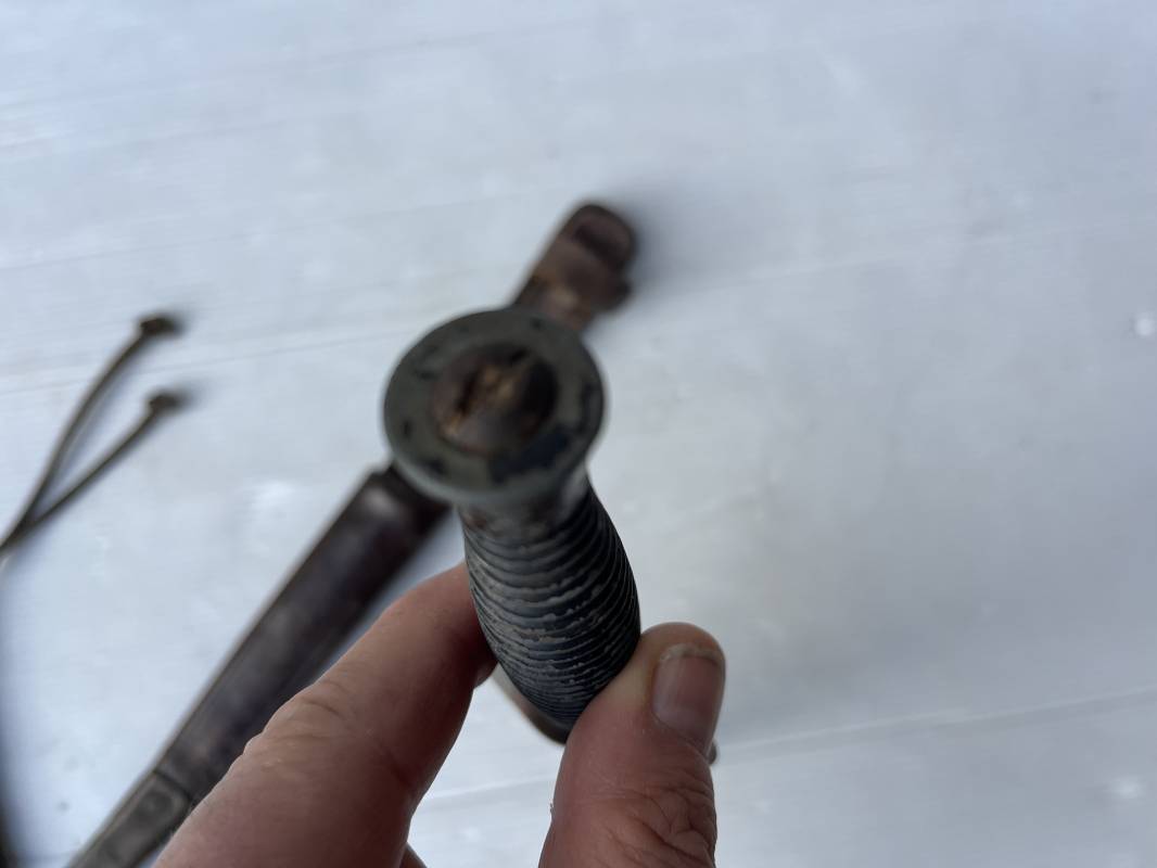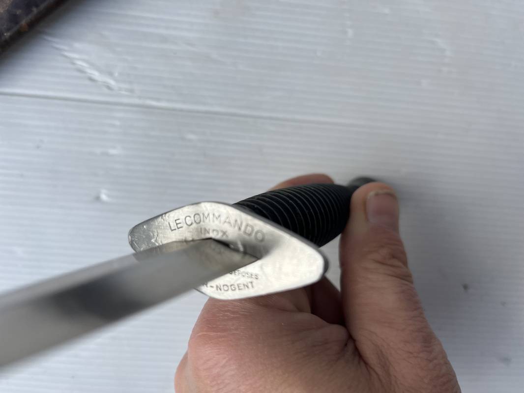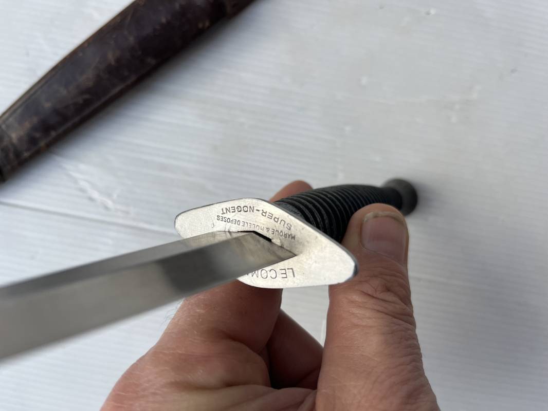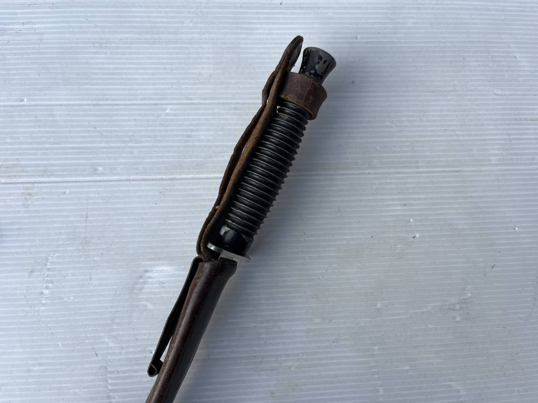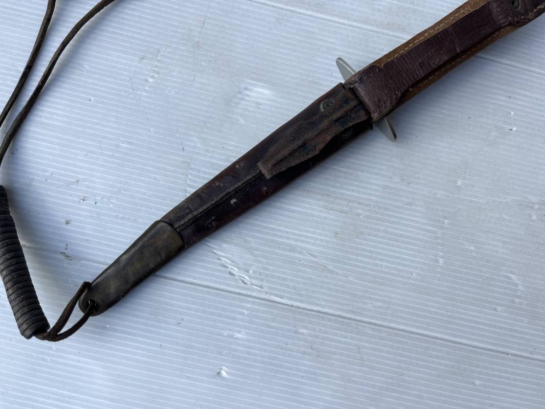 Rare dague 'commando' parachutiste copié sur le modéle Britannique Fairbairn SyKe . Dague de production francaise Marquage sur la garde ovale en acier ; ' Le commando Inox' Marque et modéle déposés Super Nogent . Poignée en metal cannelé . Lame en acier Fourreau en cuir marron avec passant de ceinturon , lanière en cuir et pression . Passant métallique à ressort pour le port au ceinturon . Lacet d origine en cuir . Beau poignard commando parachutiste en pafait état . 100 % dans son jus et intouché . Ref 18624