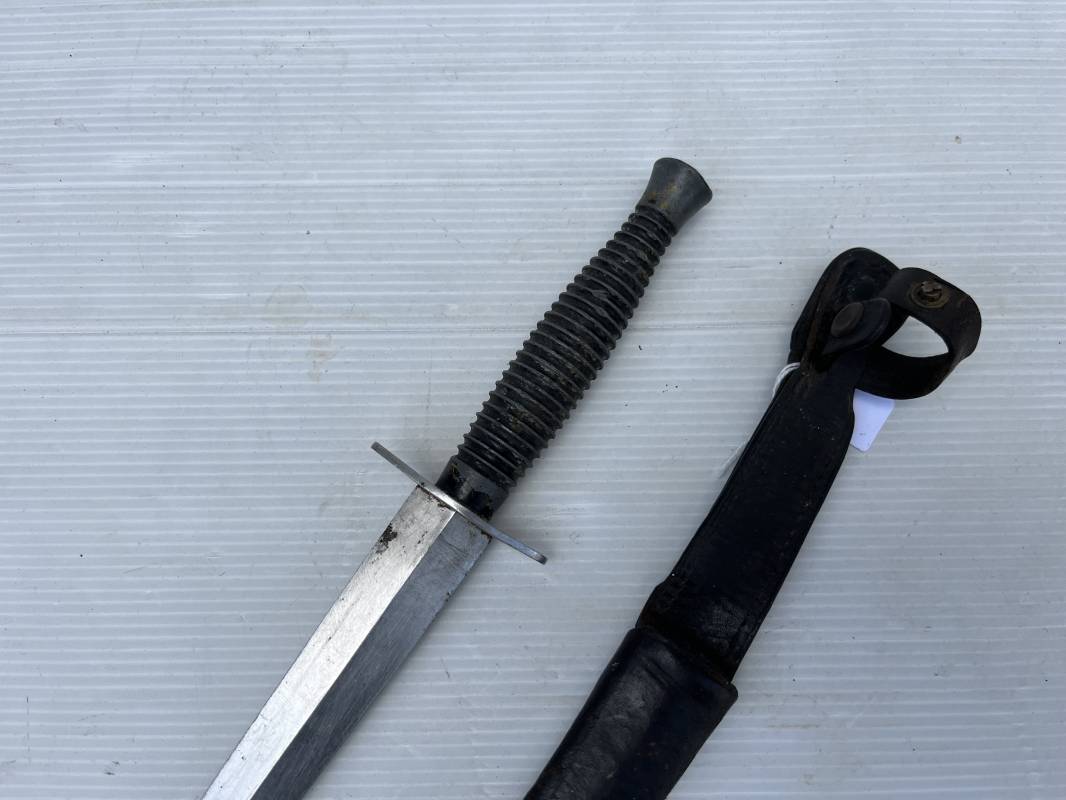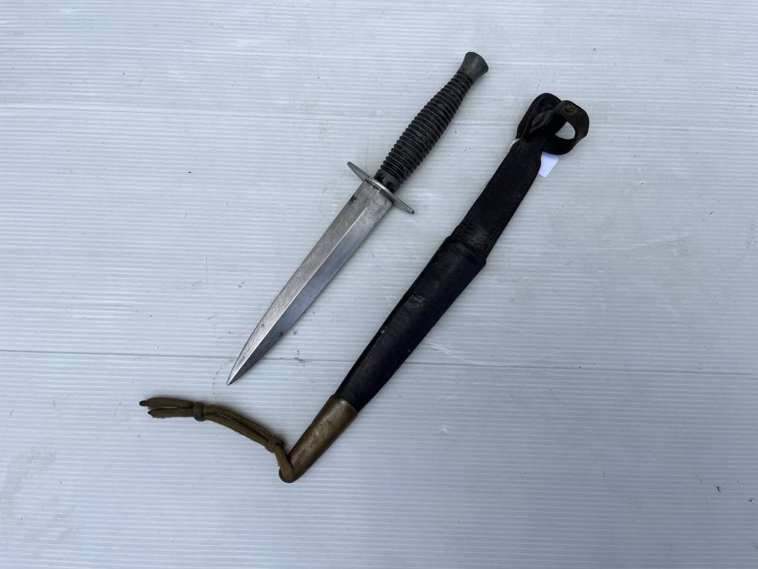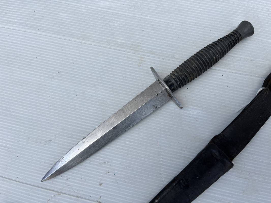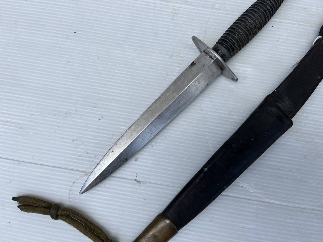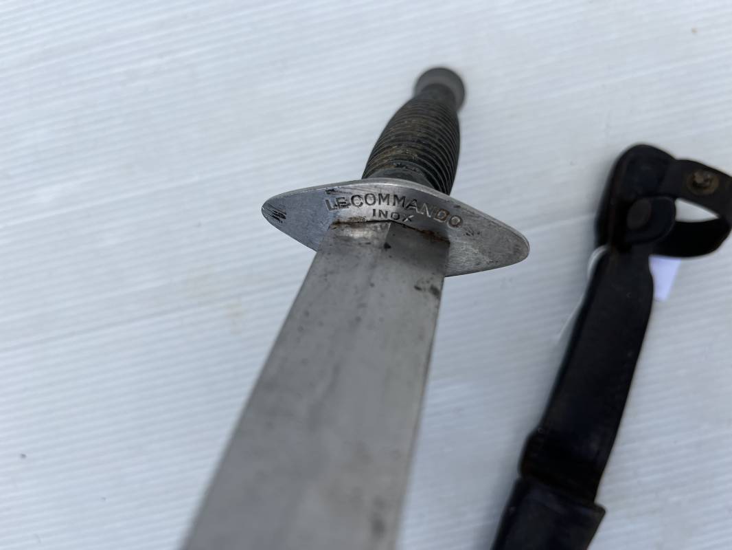 Rare dague 'commando' parachutiste copié sur le modéle Britannique Fairbairn SyKe . Dague de production francaise ' Le commando' Inox Marque et modéle deposé Super NOGENT . Marquage sur la garde acier . Poignée en metal cannelé . Lame en acier Fourreau en cuir marron avec passant de ceinturon , lanière en cuir et pression . Passant metallique a ressort pour le port au ceinturon . Lacet en sunspente de parachute . Beau poignard commando parachutiste en pafait état . 100 % dans son jus et intouché . Ref 21363