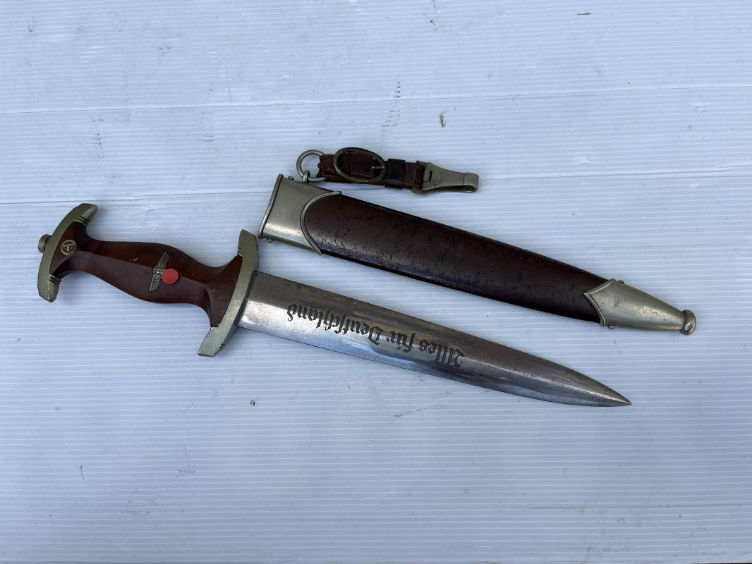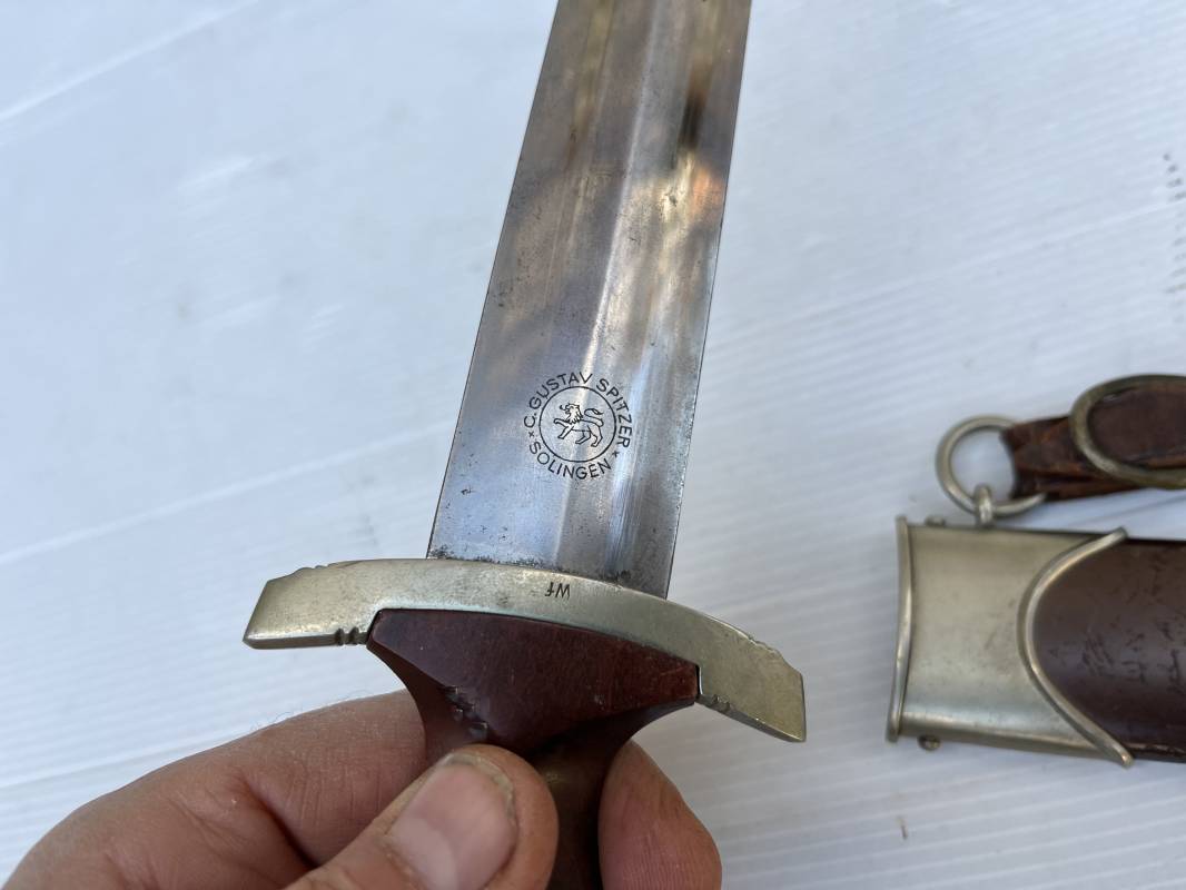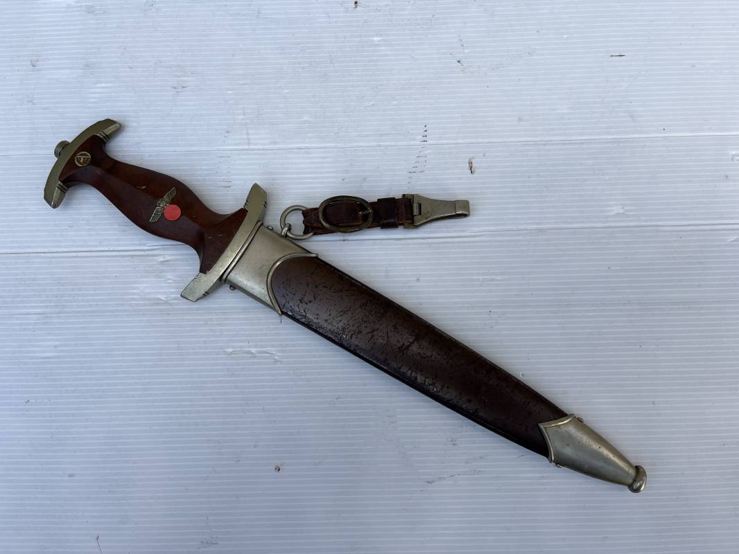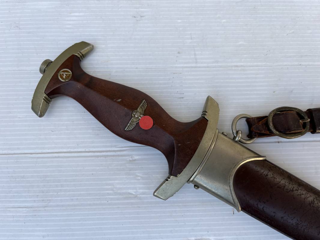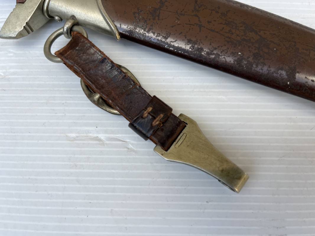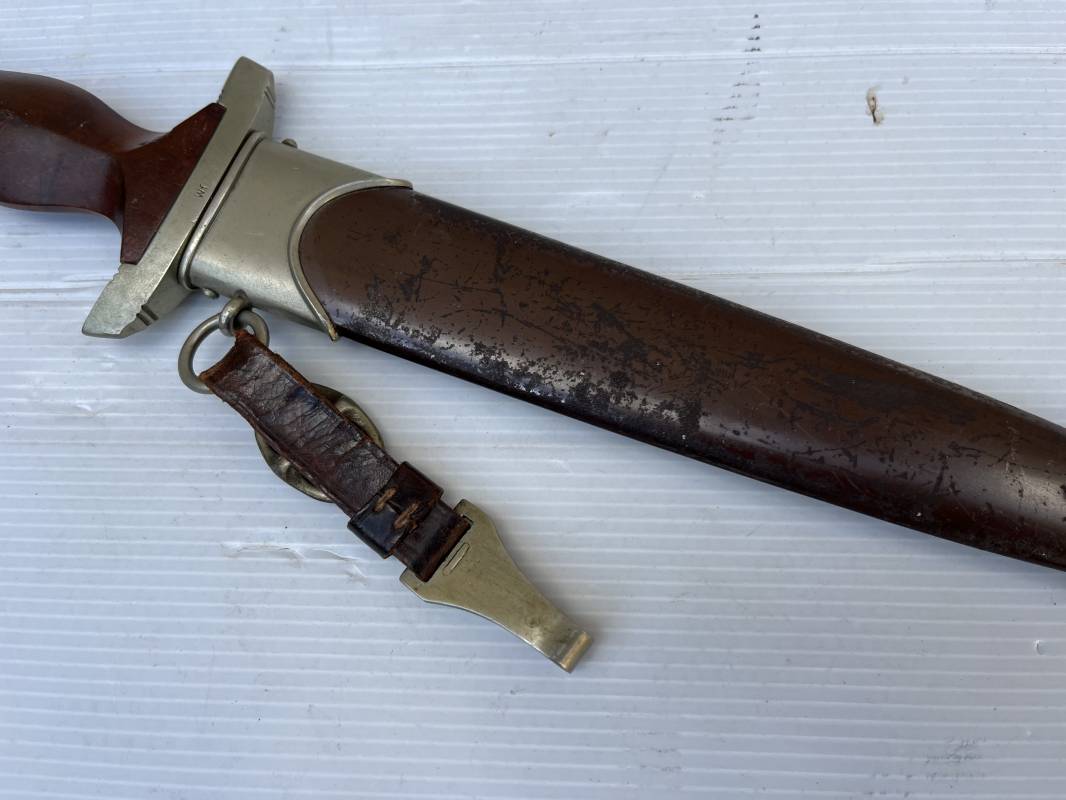 Très belle dague SA modèle 1933 et sa bélière.Modéle dit ' lourd' avec garnitures en Maillechort fabrication 1933/38 . Cette dague 100 % nature a été recupérée en sucession familiale et n a jamais été en collection Marquage fabricant Gustav Spitzer ( rare fabricant ) . Poignée en ébène marron . Insigne émaillé SA. Aigle en maillechort . Garnitures de poignée et pommeau en maillechort . Marquage ' Wf' sur le revers de la Garde pour le Groupe Westphalie . Belle lame avec devise. Marquage fabricant au dos. Fourreau en métal cuivré parkérise brun/marron d'origine, garnitures en maillechort . Bouterole . Toutes les visses sont présentes . Anneau. Bélière en cuir marron. Crochet et boucle à un ardillon en maillechort de fabrication précoce 1933/38 . Bel ensemble homogène en trés bel état. Très belle dague SA du modèle dit "lourd ". Fabrication 1933/38 . Ref 19537
