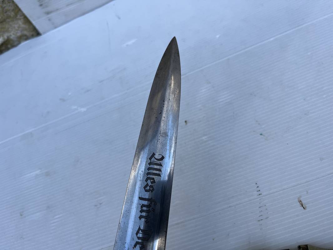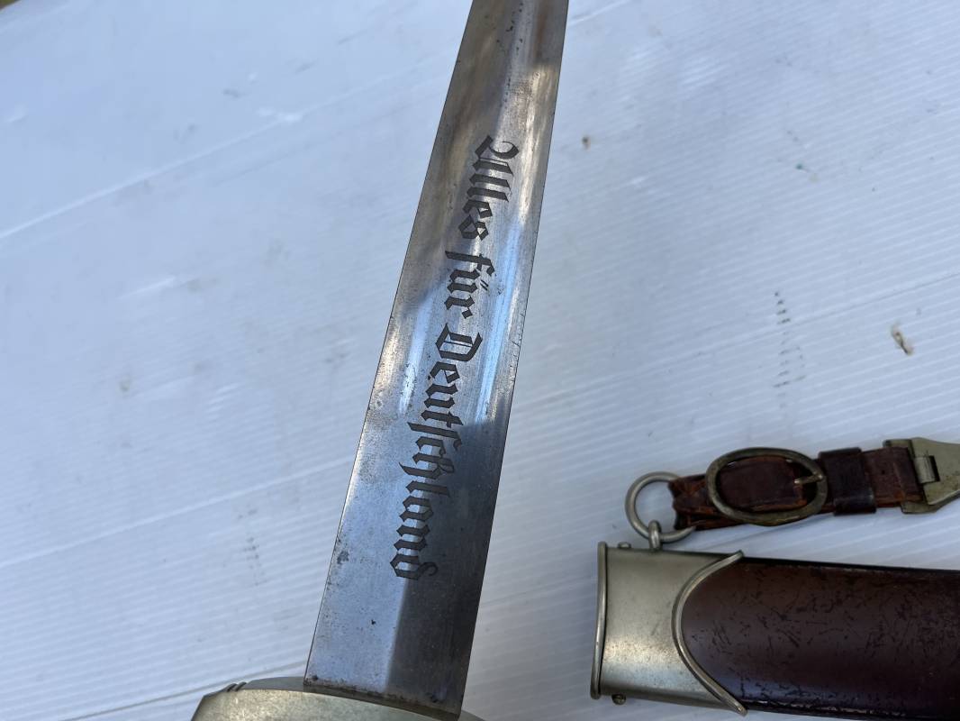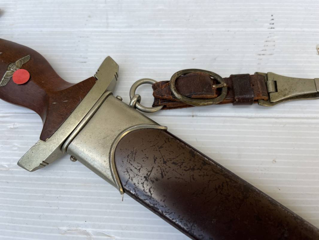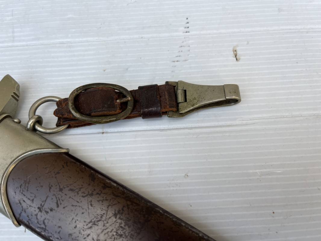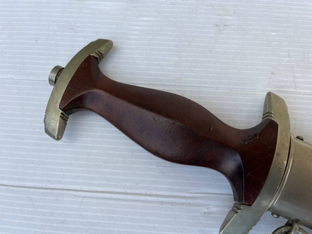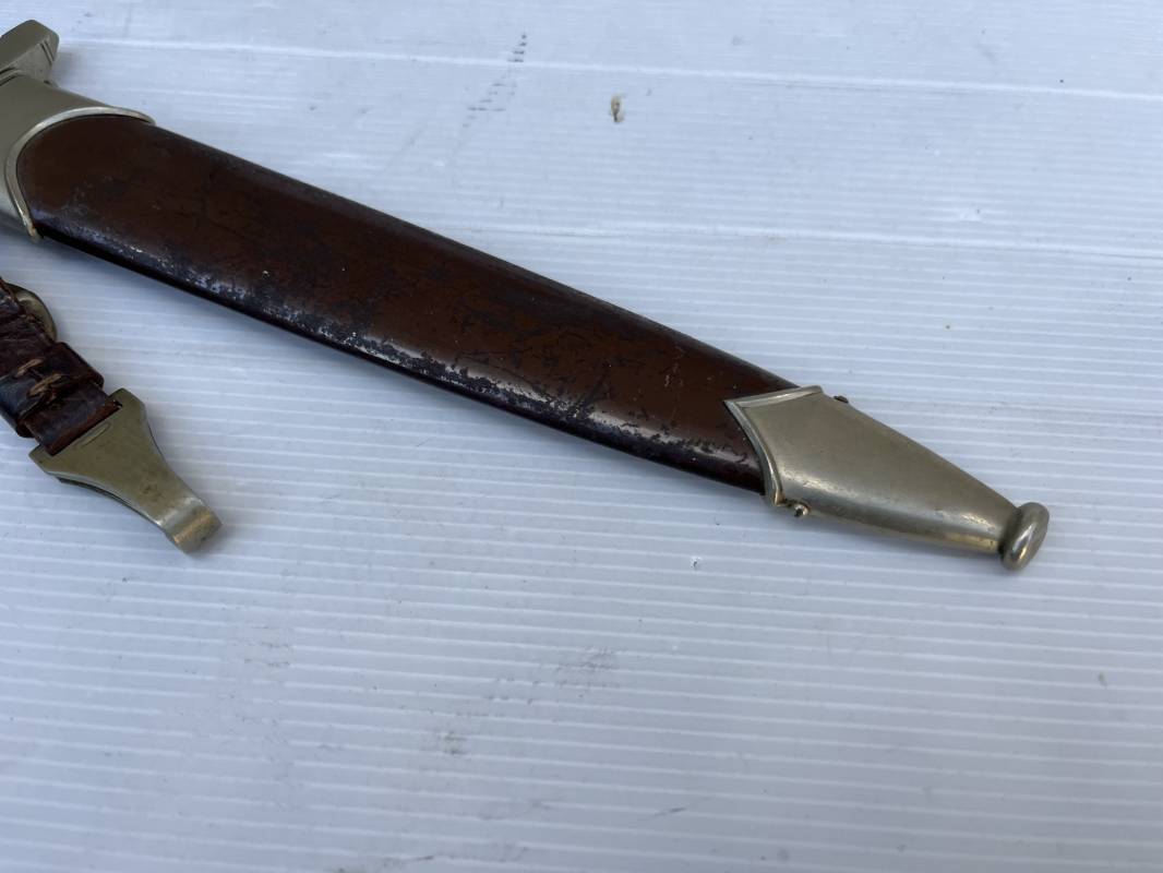 Très belle dague SA modèle 1933 et sa bélière.Modéle dit ' lourd' avec garnitures en Maillechort fabrication 1933/38 . Cette dague 100 % nature a été recupérée en sucession familiale et n a jamais été en collection Marquage fabricant Gustav Spitzer ( rare fabricant ) . Poignée en ébène marron . Insigne émaillé SA. Aigle en maillechort . Garnitures de poignée et pommeau en maillechort . Marquage ' Wf' sur le revers de la Garde pour le Groupe Westphalie . Belle lame avec devise. Marquage fabricant au dos. Fourreau en métal cuivré parkérise brun/marron d'origine, garnitures en maillechort . Bouterole . Toutes les visses sont présentes . Anneau. Bélière en cuir marron. Crochet et boucle à un ardillon en maillechort de fabrication précoce 1933/38 . Bel ensemble homogène en trés bel état. Très belle dague SA du modèle dit "lourd ". Fabrication 1933/38 . Ref 19537
